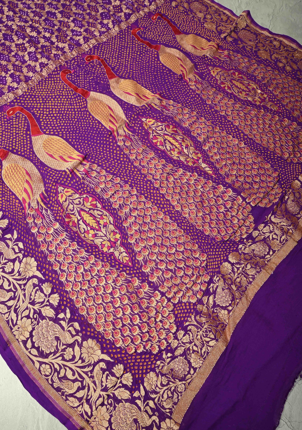 This authentic Purple Bandhej Banarasi Pure Silk Georgette Dupatta is a stunning fusion of traditional craftsmanship and regal elegance. Handwoven by skilled artisans in Banaras, it features intricate zari jaal work that shimmers gracefully across the soft, lightweight pure silk georgette base. The bandhej (tie-dye) pattern in royal purple adds a vibrant touch, showcasing the beauty of age-old dyeing techniques. The highlight of this masterpiece is its exquisite peacock meenakari pallu, adorned with colorful enamel detailing that symbolizes grace and opulence. Perfect for festive occasions or special celebrations, this dupatta effortlessly elevates any ensemble with its timeless charm and luxurious drape