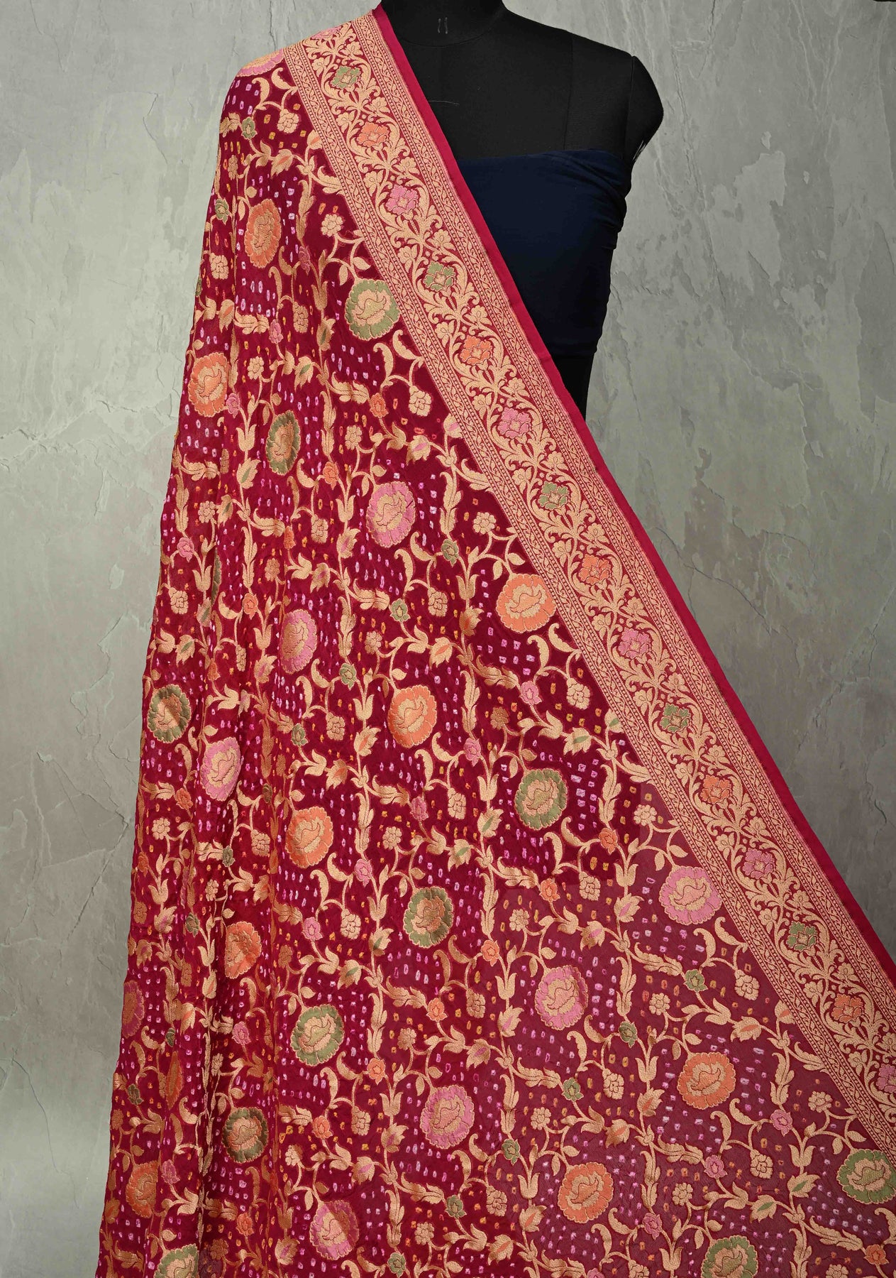 This Rani Pink Bandhej Banarasi Silk Georgette Dupatta is a breathtaking piece that radiates royal charm and traditional allure. Handcrafted from silk georgette, it showcases the timeless Bandhej (tie-dye) technique in a vibrant rani pink hue. The dupatta is intricately adorned with meenakari floral motifs and a shimmering zari jaal, reflecting the finesse of Banarasi craftsmanship. Its soft texture, lustrous finish, and graceful drape make it a perfect accessory for weddings, festive occasions, and grand celebrations.