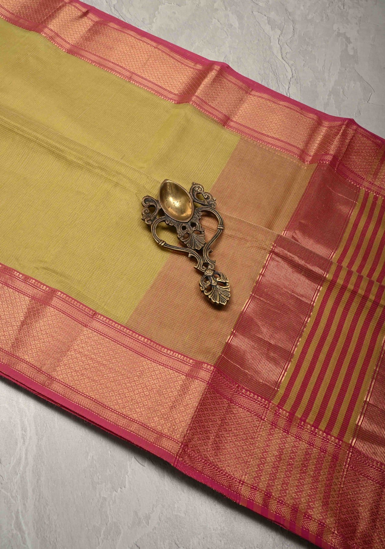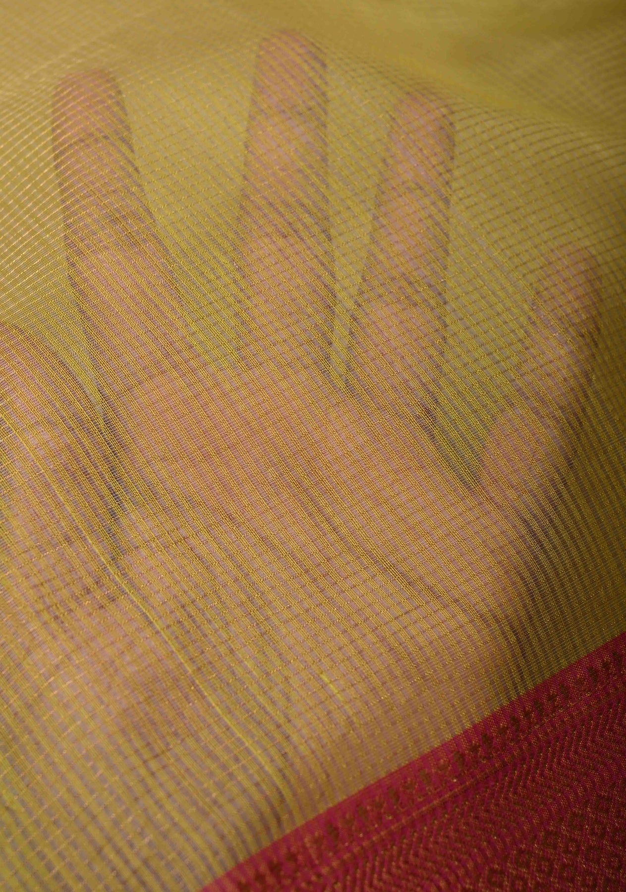 Brighten your wardrobe with the timeless charm of this Yellow Handwoven Maheshwari Silk Cotton Saree, thoughtfully crafted by skilled artisans. The breathable silk-cotton blend offers a soft, lightweight drape, ideal for all-day wear. Featuring delicate tissue checks that add a subtle shimmer to the vibrant yellow base, the saree is beautifully finished with a striking contrast Zari border that adds a touch of festive elegance. Perfect for traditional celebrations, cultural events, or elegant daytime outings, this saree pairs wonderfully with understated jewelry and a complementary blouse.