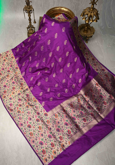 Purple Pure Banarasi Katan Silk Saree with Floral Zari Buttas and Paithani Wide Border, Pallu | SILK MARK CERTIFIED