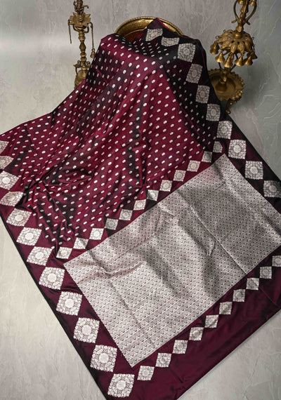 Maroon Banarasi Katan Silk Saree with Checks Pattern and Zari Border | SILK MARK CERTIFIED