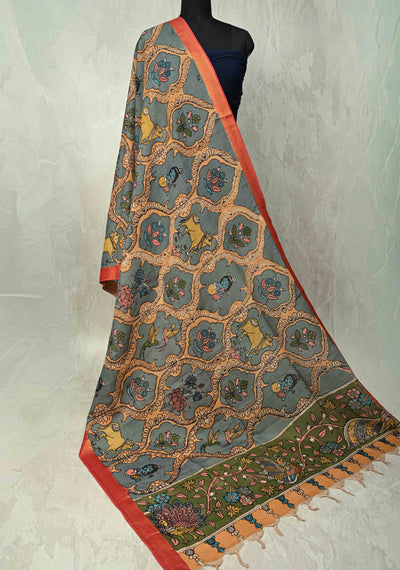 DUPATTA : Dusty Teal Authentic Pen Kalamkari Pichwai design on Mangalagiri Silk Cotton Dupatta with Krishna PIchwai Theme