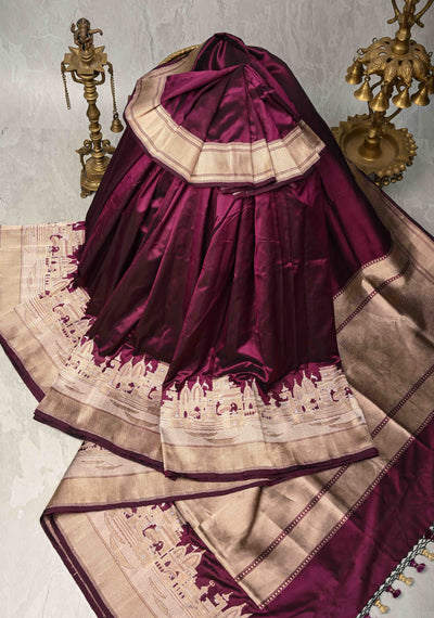 Dark Wine Banarasi Katan silk saree with and Ganga Ghat Temple Zari Border | SILK MARK CERTIFIED
