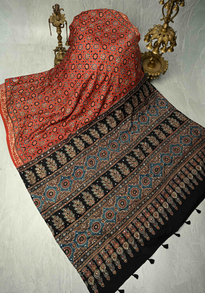 Red Ajrakh Block Print on Modal Saree with Mirror Work