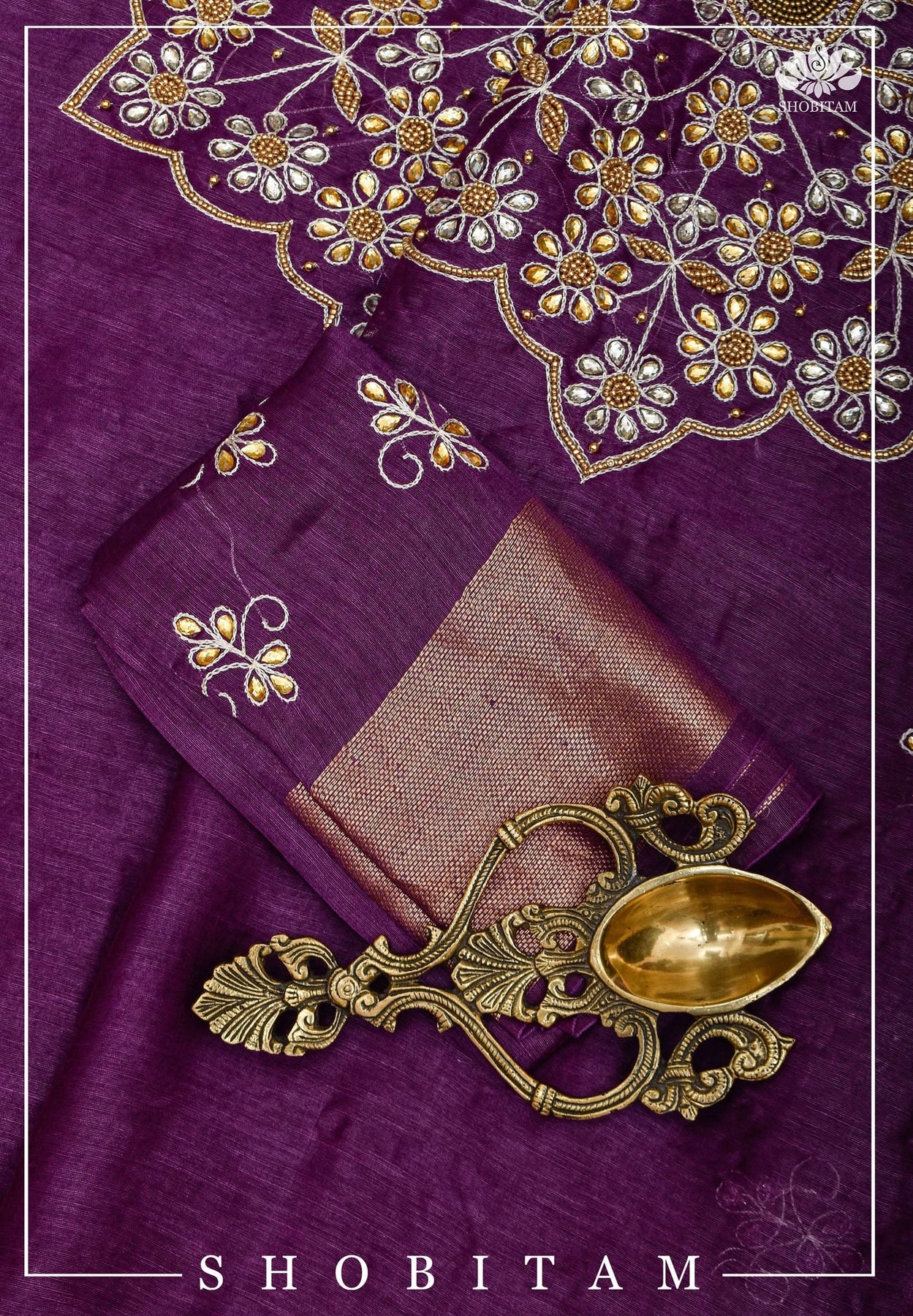 Presenting an elegant silk Linen saree in a rich purple with gold Zari border. The Saree has beautiful kundan stone and resham embroidery and comes with a matching blouse piece.Pretty tassels and zari adorn the pallu.