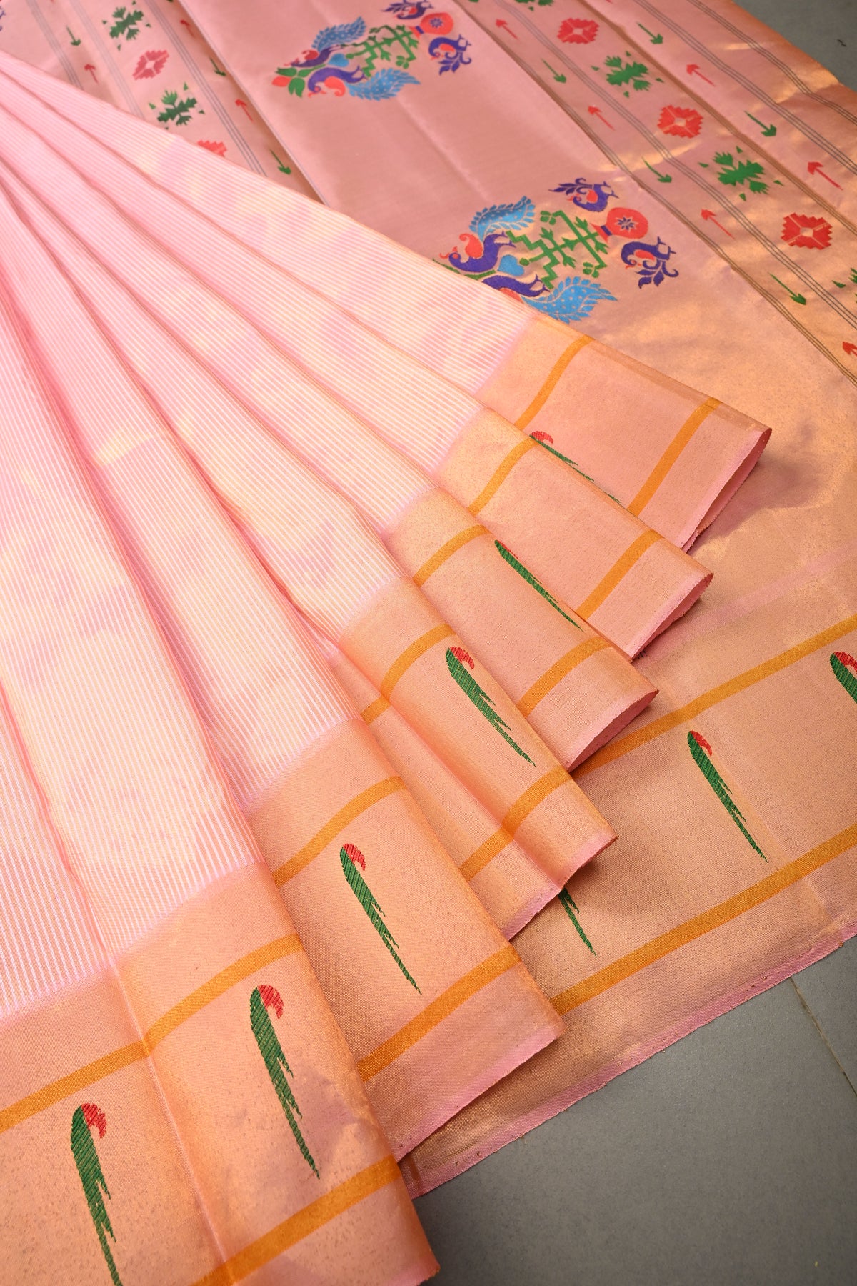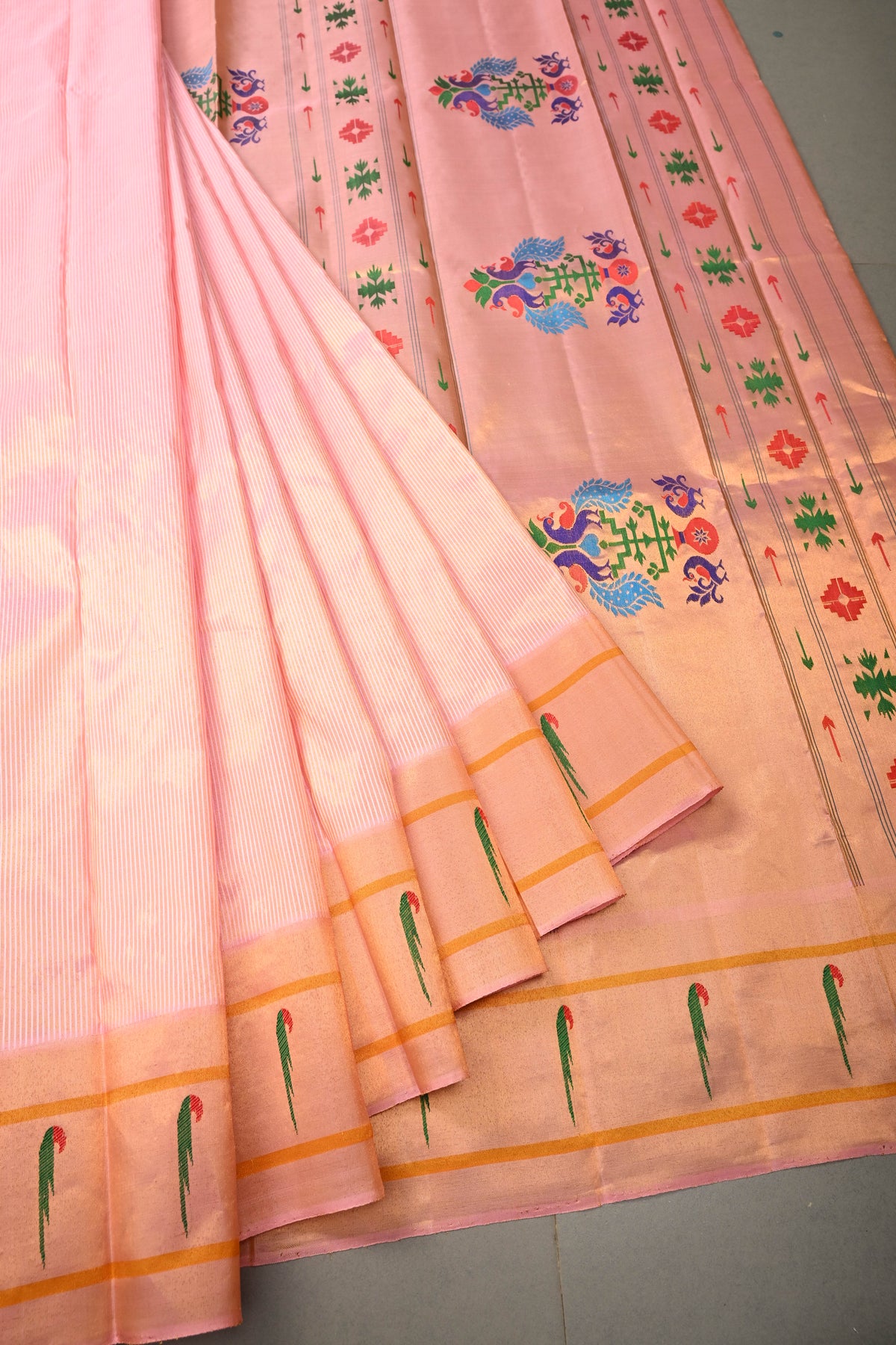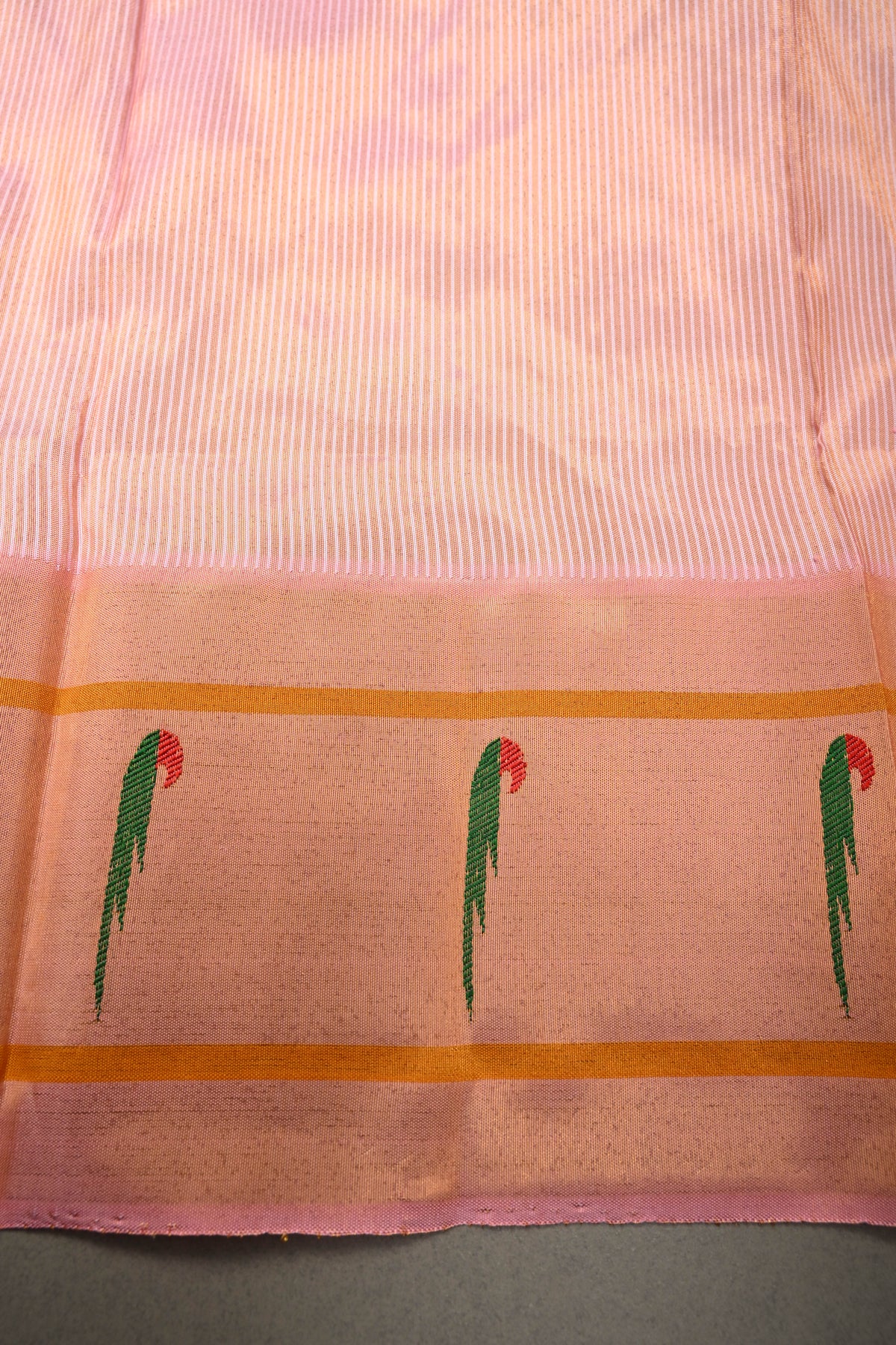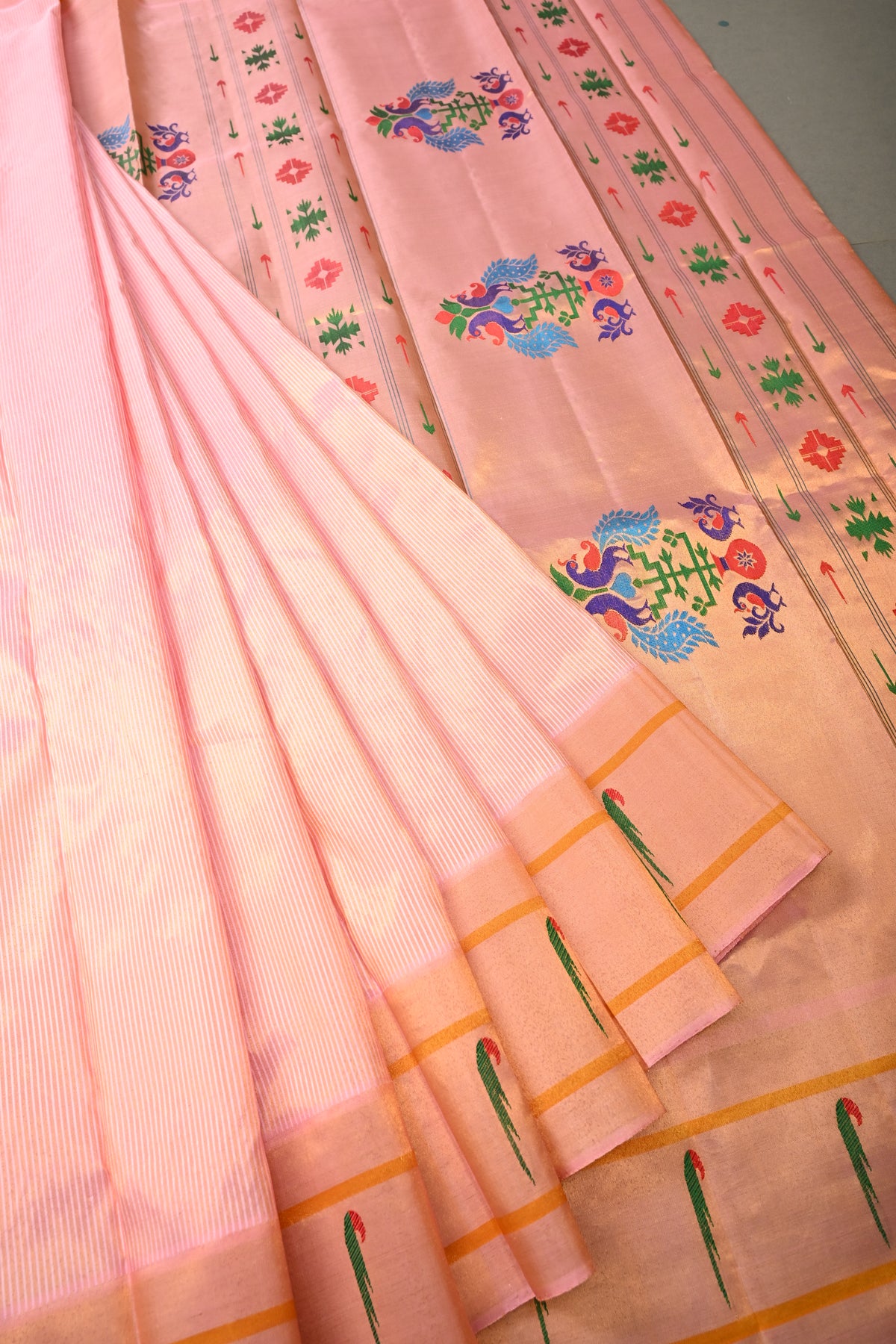 Embrace timeless elegance with this Authentic Pink Yeola Paithani Handloom Silk Saree with Single Muniya Borders and Peacock Motifs on Pallu. Handwoven with meticulous craftsmanship, this saree is a true reflection of the heritage of Yeola Paithani silk, celebrated for its fine texture, vibrant colors, and luxurious finish.