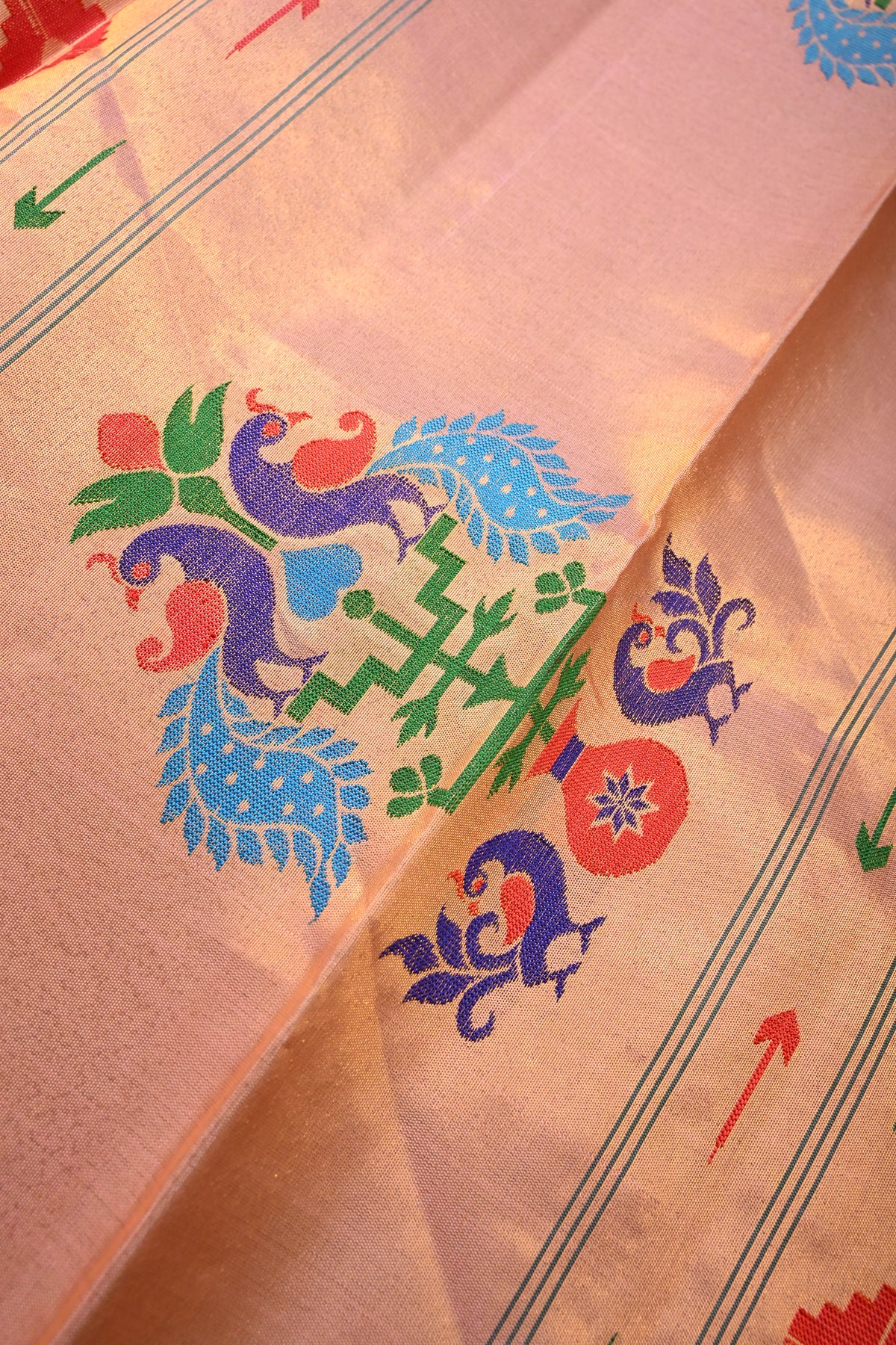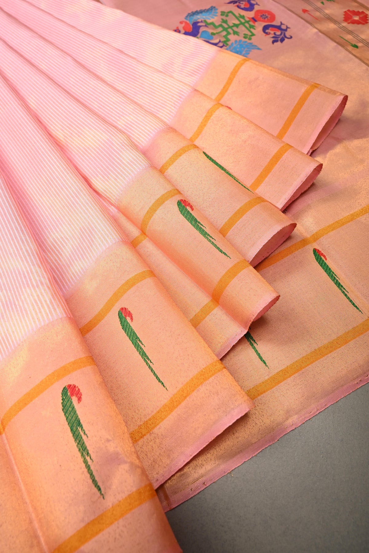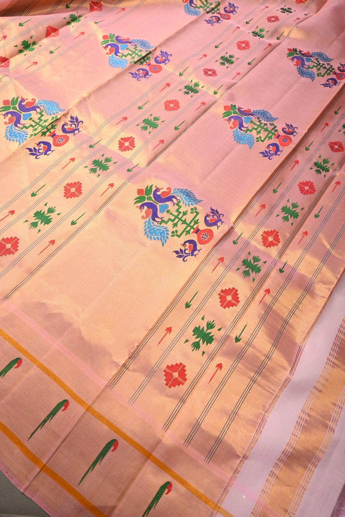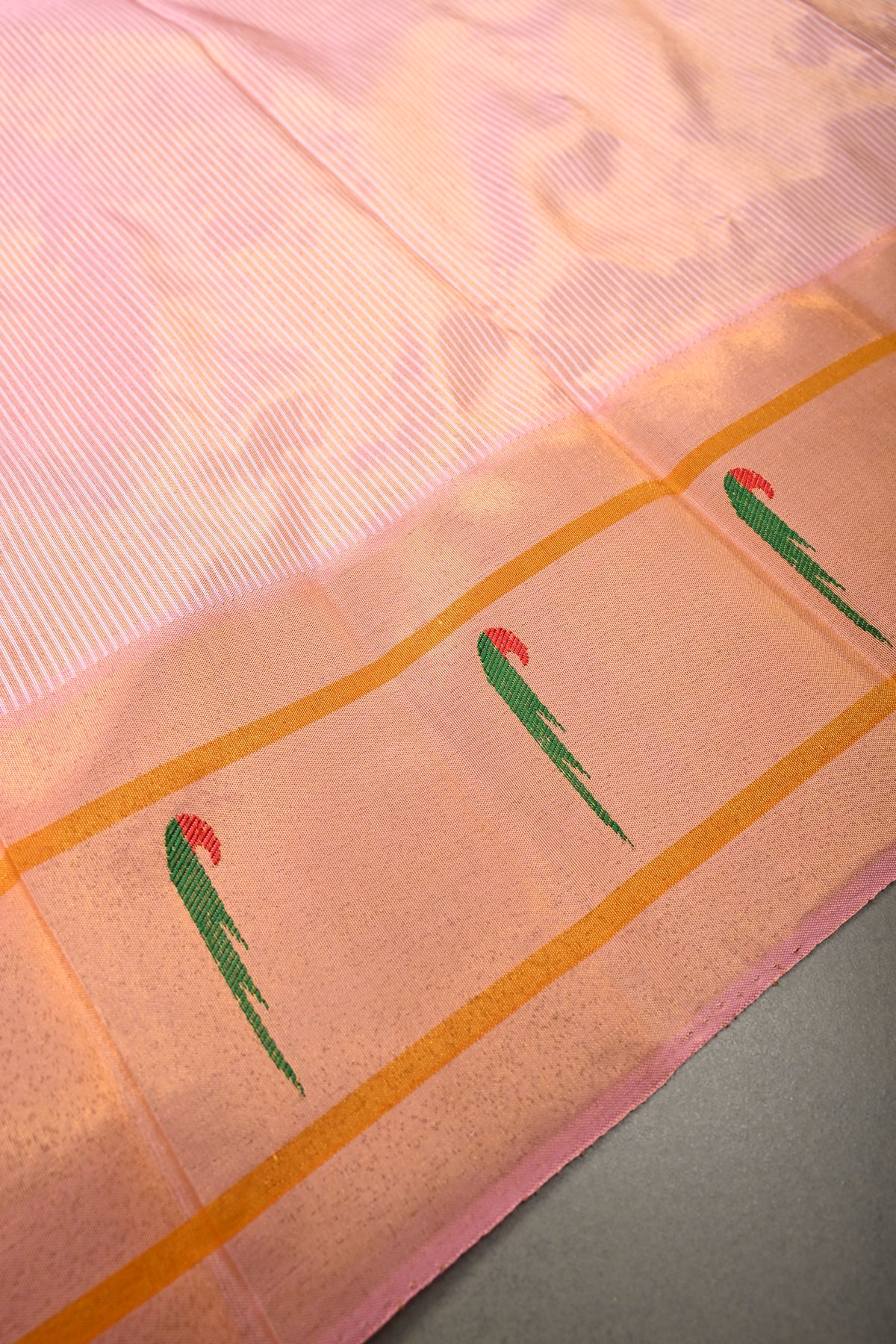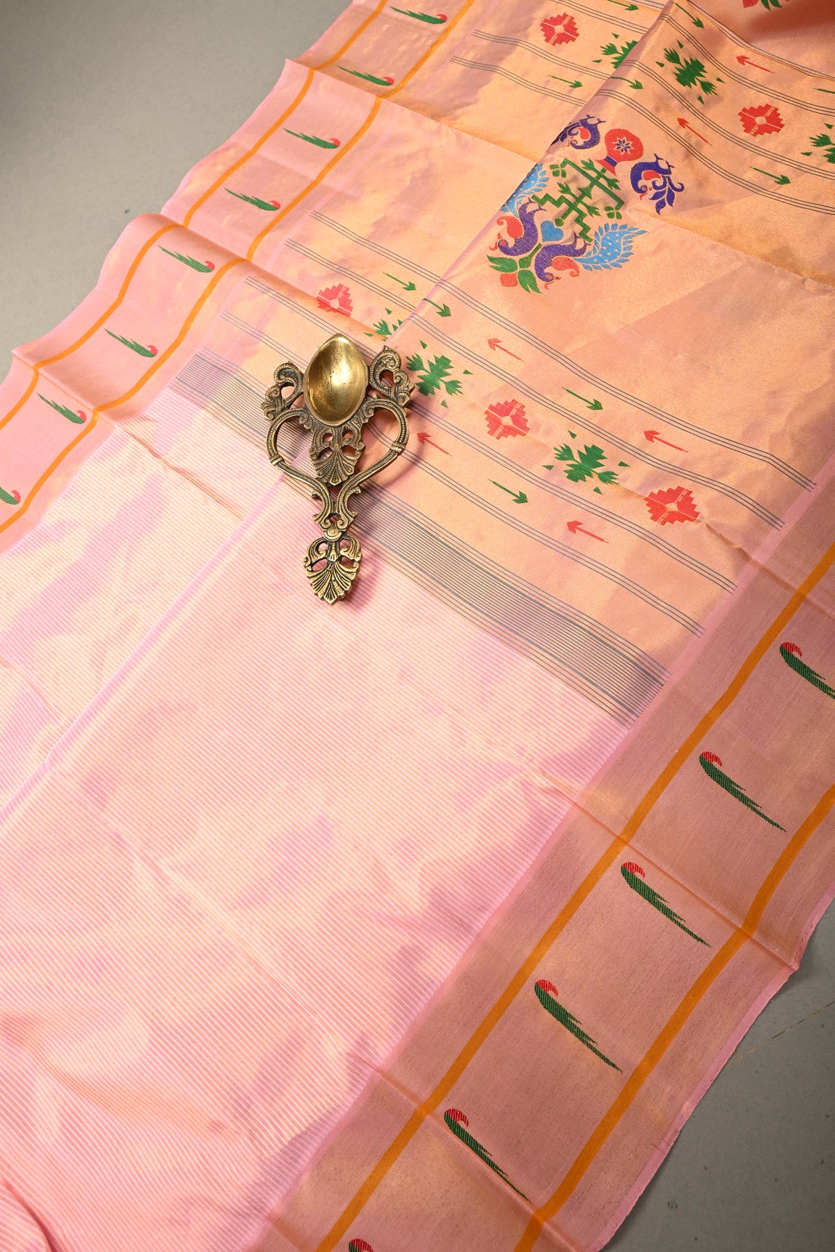 Embrace timeless elegance with this Authentic Pink Yeola Paithani Handloom Silk Saree with Single Muniya Borders and Peacock Motifs on Pallu. Handwoven with meticulous craftsmanship, this saree is a true reflection of the heritage of Yeola Paithani silk, celebrated for its fine texture, vibrant colors, and luxurious finish.