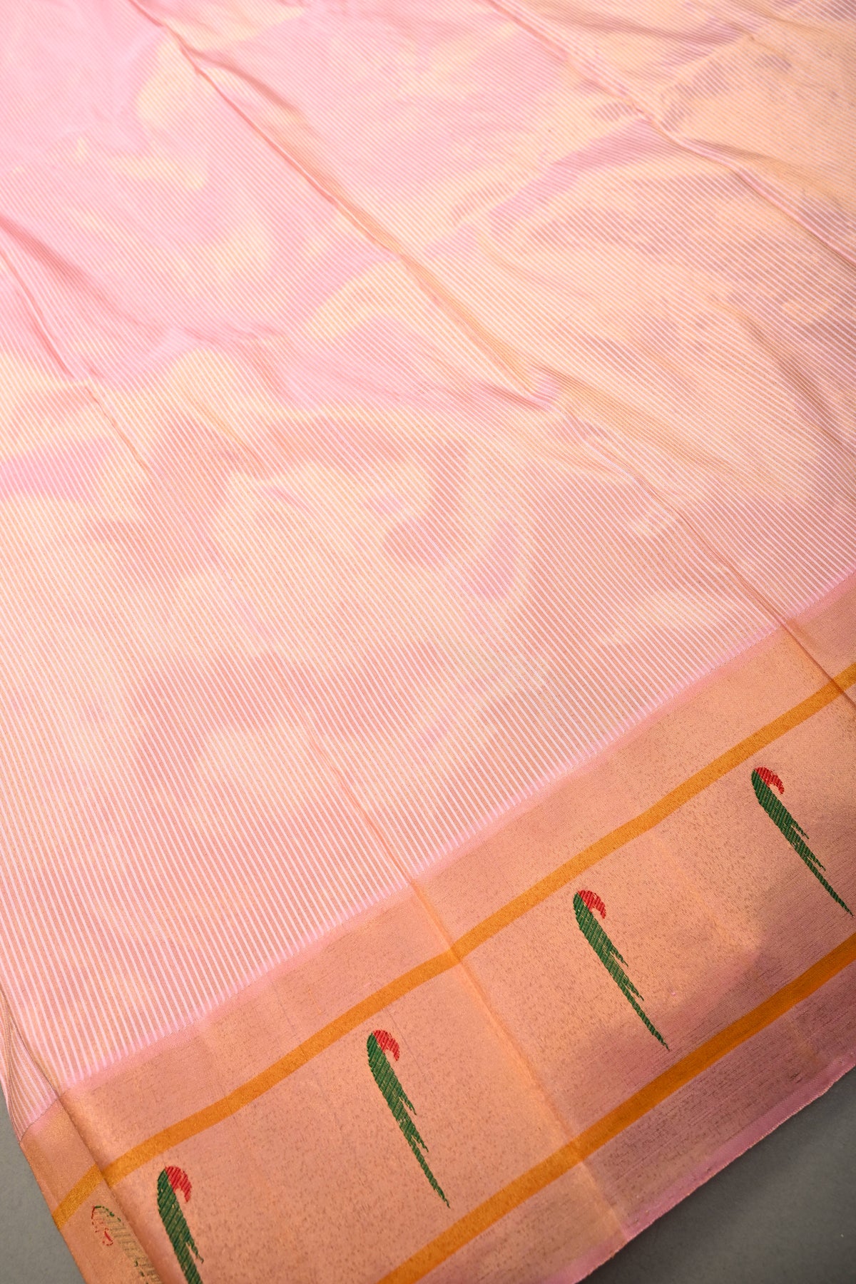 The soft pink shade exudes grace and femininity, while the classic single Muniya borders add subtle sophistication. The pallu features intricate peacock motifs, showcasing traditional artistry and adding a regal charm to the saree. Lightweight yet rich, this saree drapes beautifully, making it perfect for weddings, festive occasions, and cultural celebrations.