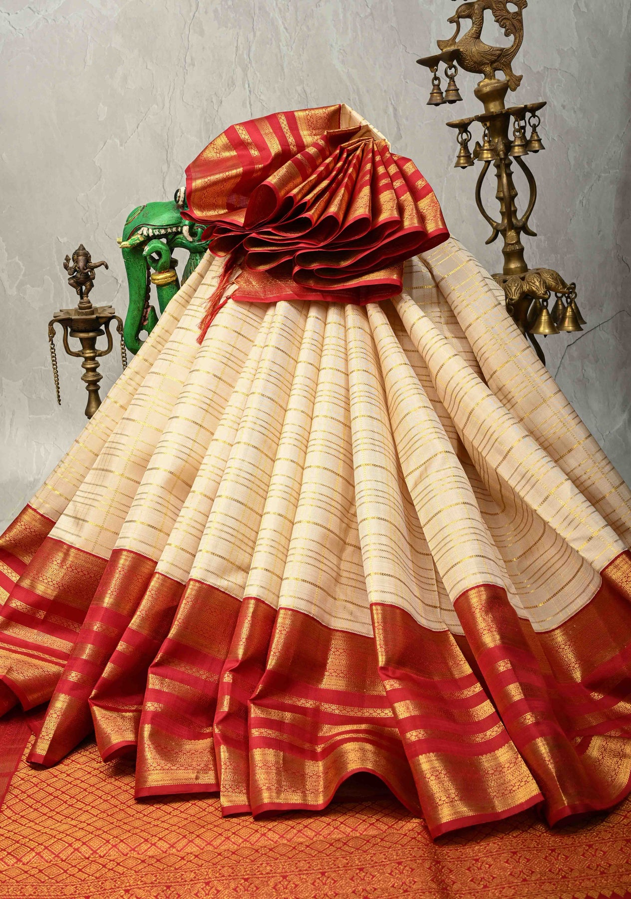 This elegant Beige Korvai Kanjivaram pure silk saree is a graceful blend of subtle sophistication and traditional artistry. Crafted from pure silk, the saree features classic zari checks woven across the body, lending it a timeless and structured appeal. The Korvai weaving technique beautifully highlights the rich contrast zari border, adding depth and grandeur to the neutral beige tone. Finished with an intricately woven zari pallu, this saree is an ideal choice for weddings, festive celebrations, and traditional occasions where understated luxury makes a lasting impression.