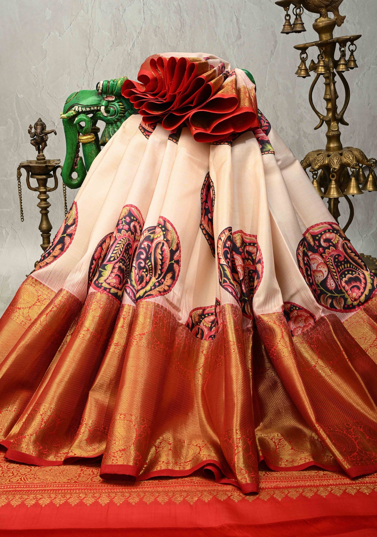 This beige pure Kanjivaram silk saree exudes understated elegance and artistic sophistication. Crafted from Kanjivaram silk, it features a beautifully detailed Kalamkari Mandala–Peacock digital print that adds a unique blend of tradition and contemporary design. The serene beige base enhances the intricacy of the motifs, while the contrast wide zari border lends a rich and regal finish. With its smooth texture and graceful drape, the saree offers timeless appeal. Perfect for weddings, festive occasions, and cultural celebrations, it reflects refined craftsmanship and classic beauty.