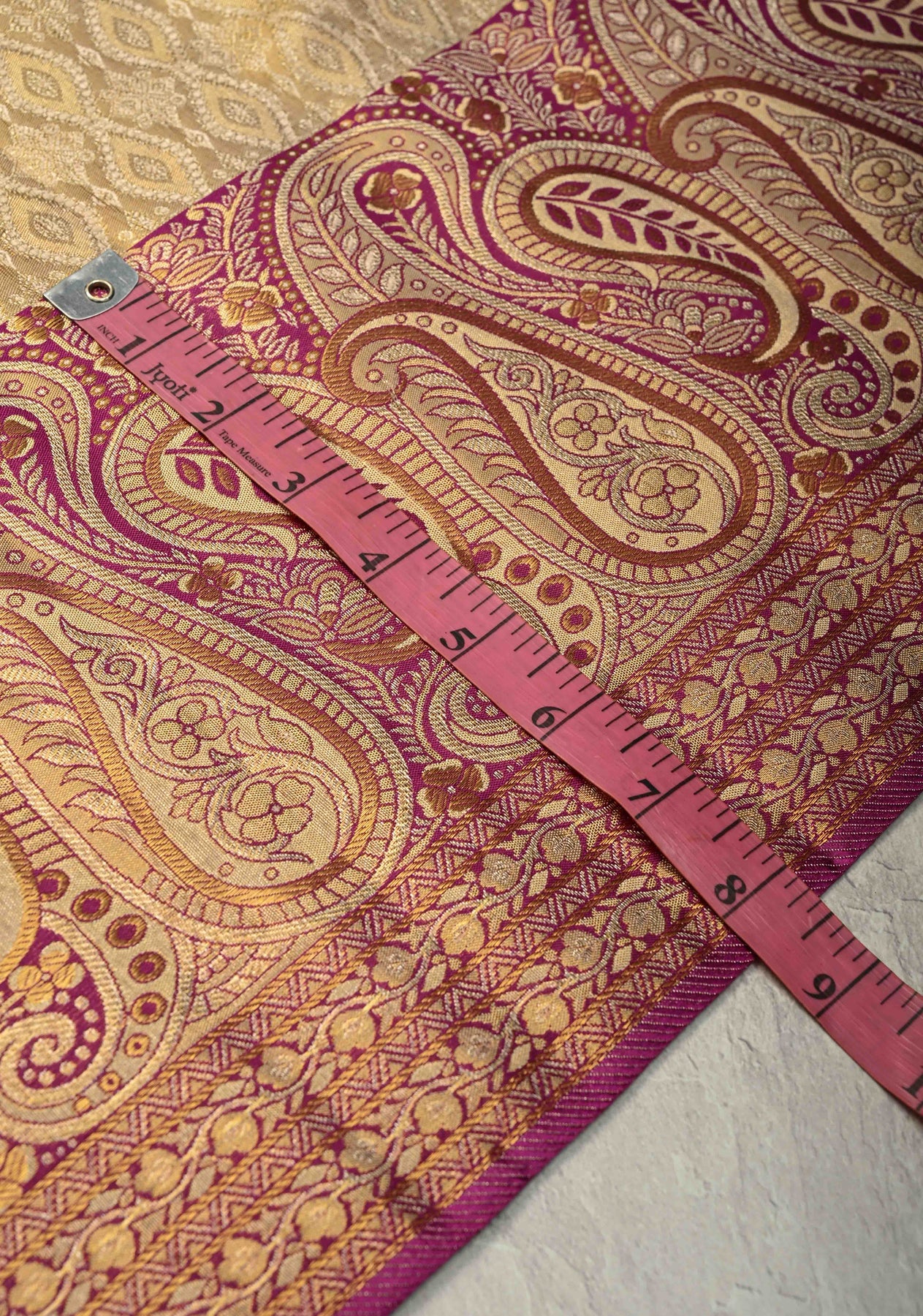 This beige pure Kanjivaram tissue silk saree exudes understated luxury and traditional charm. The tissue silk base is beautifully enhanced with intricate meenakari brocade jaal, adding rich detailing and artistic depth. A striking contrast pashmina-style zari border elevates the saree with a regal finish, blending classic South Indian craftsmanship with a refined contemporary touch. Ideal for weddings, festive celebrations, and elegant soirées, this saree is a timeless addition to any ethnic collection.