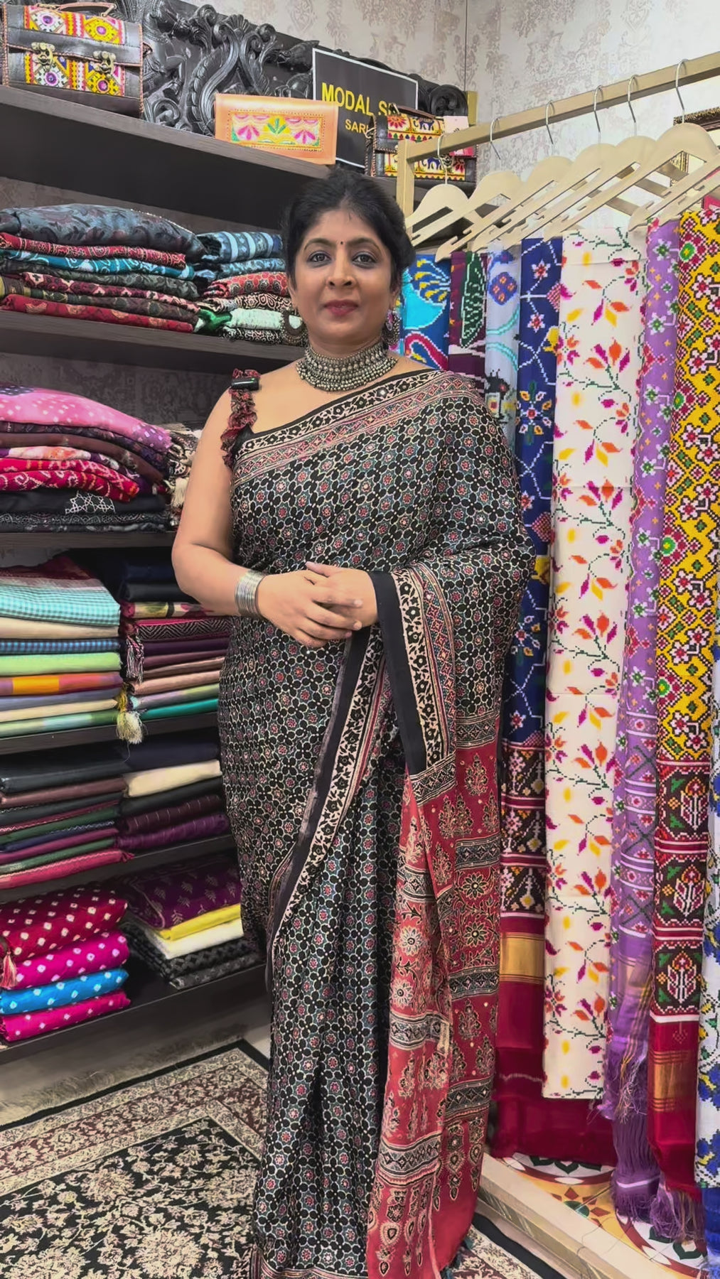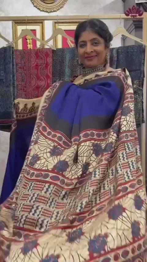 Make a striking statement with this Black Ajrakh Hand Block Print Modal Silk Saree, expertly hand-printed with traditional Ajrakh motifs. Crafted from soft modal silk, the saree offers a lightweight and flowing drape, combining comfort with luxury.