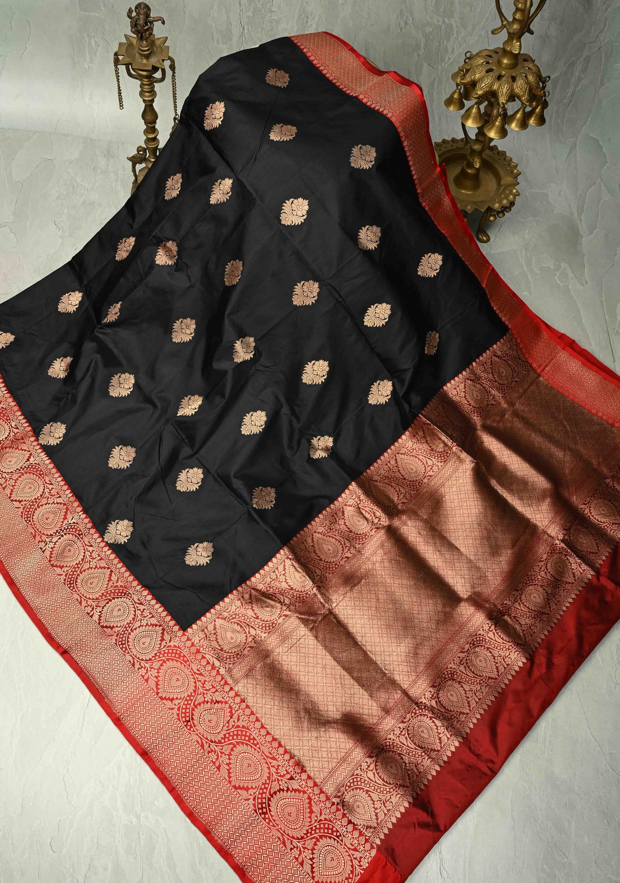 This striking Black Katan Silk Handloom Saree is a perfect blend of elegance and traditional craftsmanship. Handwoven from katan silk, it features a smooth, lustrous texture that drapes beautifully. The saree is adorned with antique zari buttas, adding a subtle yet rich touch of opulence. A contrast zari border enhances the overall grandeur, creating a sophisticated and timeless appeal. Ideal for festive occasions, and evening events, this saree embodies classic charm and artisanal excellence.