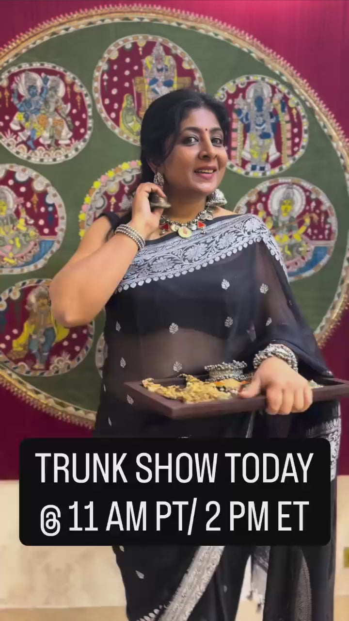 This Black Pure Chiffon Silk Saree is a statement of timeless sophistication and understated luxury. Crafted from fine chiffon silk, it drapes effortlessly with a light, airy flow. The saree is embellished with delicate silver-tone zari buttas that sparkle subtly against the black backdrop, creating a striking contrast. A beautifully woven silver-tone zari border frames the saree, adding a refined touch of traditional elegance. Perfect for evening occasions, festive celebrations, or formal events, this saree blends classic charm with contemporary grace.