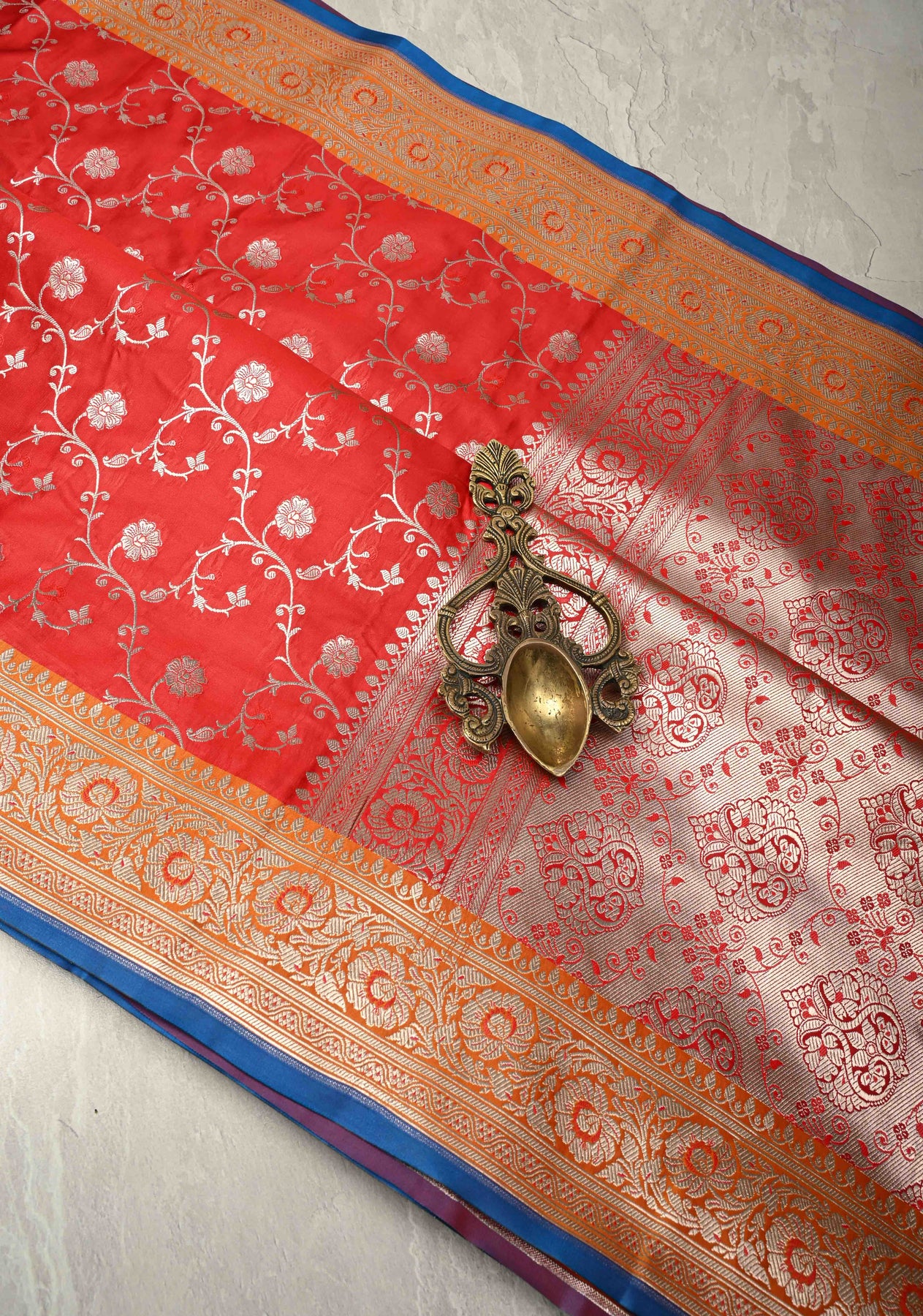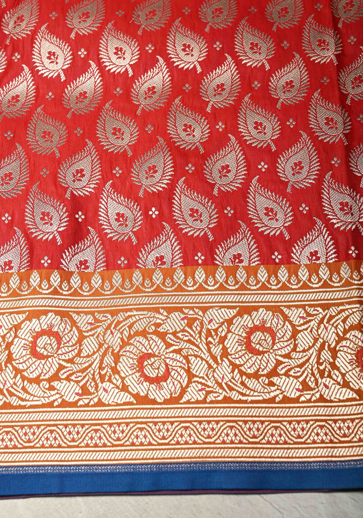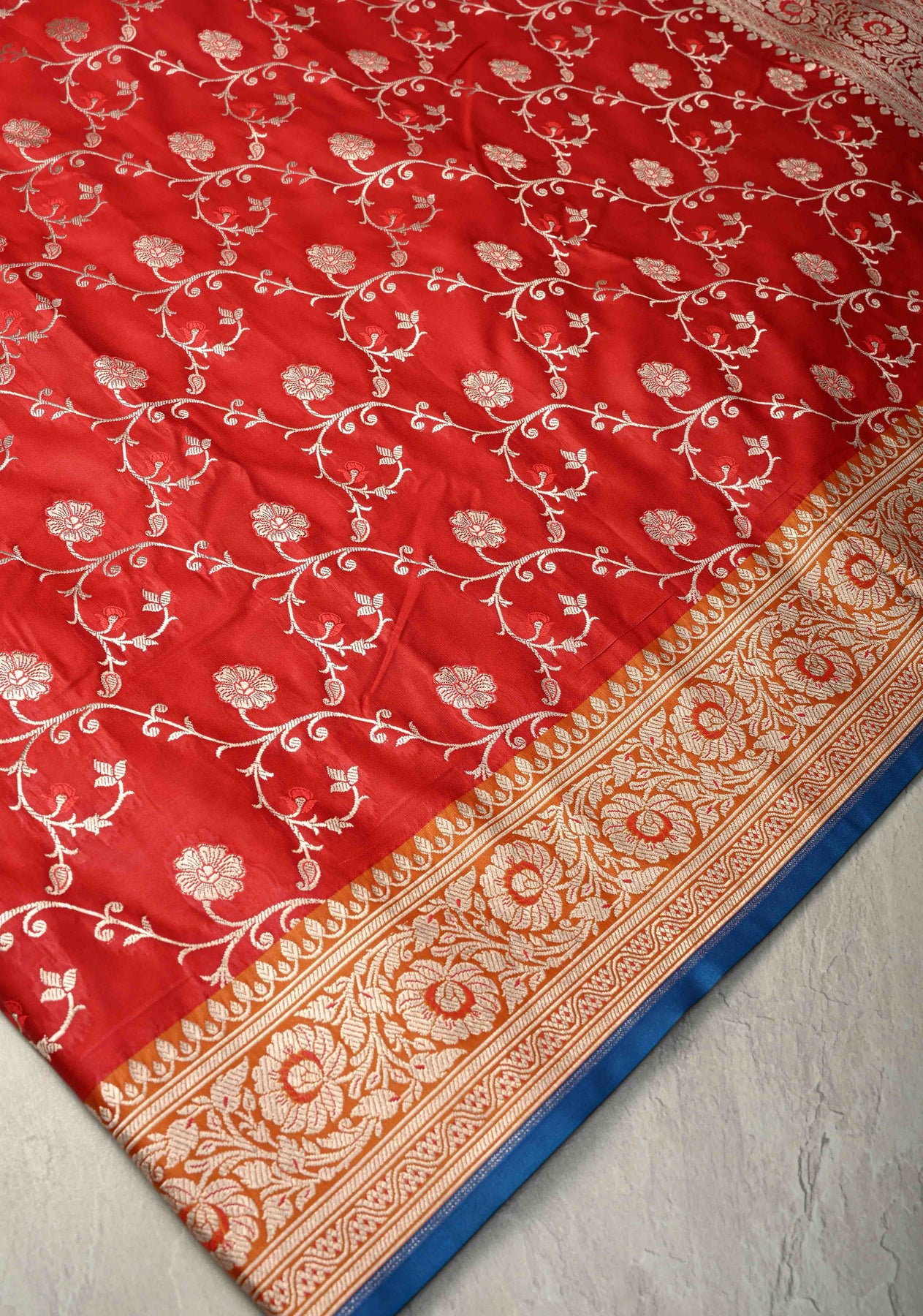The Blood Red Banarasi Semi Mashru Silk Saree is a captivating blend of timeless elegance and exquisite craftsmanship. Woven from Banarasi semi mashru silk, this saree features a blood red base adorned with intricate Meenakari silver zari floral jaal, adding delicate shimmer and artisanal charm. A contrast zari border frames the saree beautifully, enhancing its regal and festive appeal. Lightweight, lustrous, and graceful, this saree is perfect for weddings, special occasions, and cultural celebrations.
