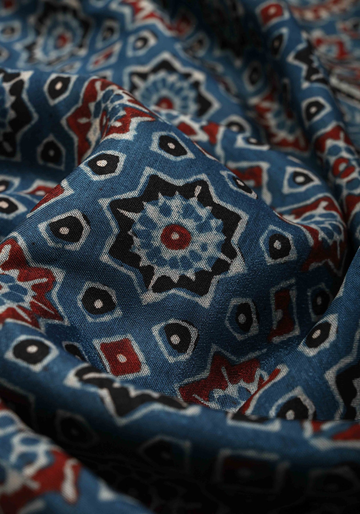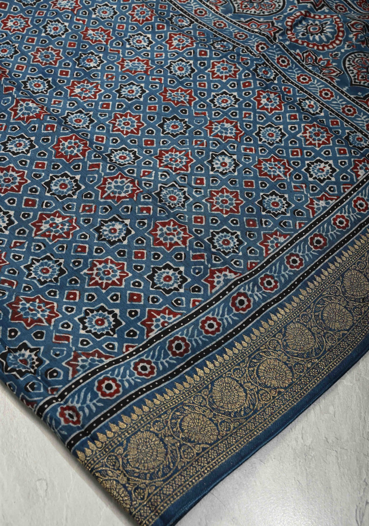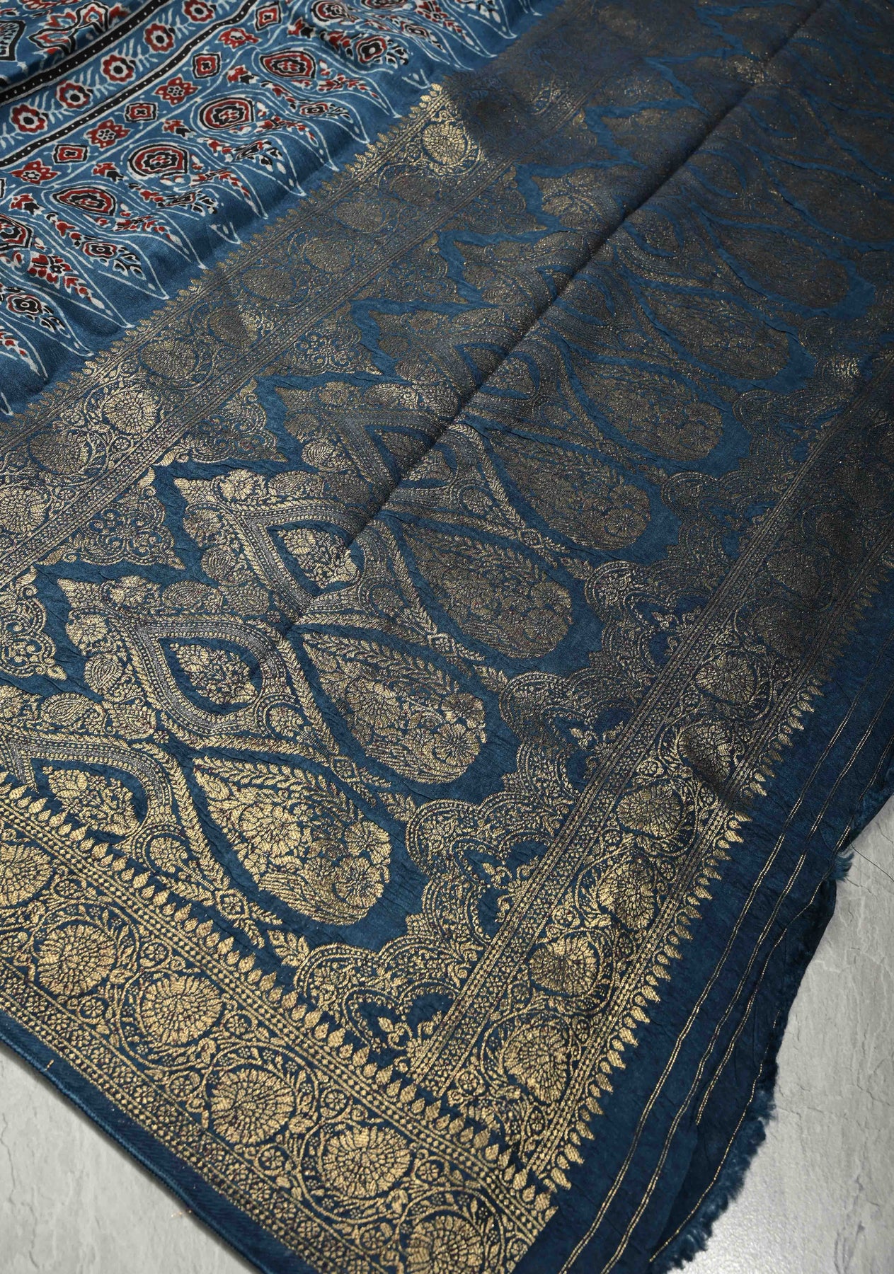 The Blue Ajrakh Hand Block Print on Dola Silk Saree with Fancy Zari Border is a stunning fusion of rich textile tradition and elegant design. Crafted from dola silk, this saree features authentic Ajrakh hand block prints in deep blue hues, showcasing intricate geometric and floral patterns native to this ancient art form. The saree is beautifully accentuated by a fancy zari border, adding a touch of opulence and shimmer that perfectly complements the bold prints. Ideal for festive occasions, weddings, and special celebrations, this saree blends heritage artistry with sophisticated charm.