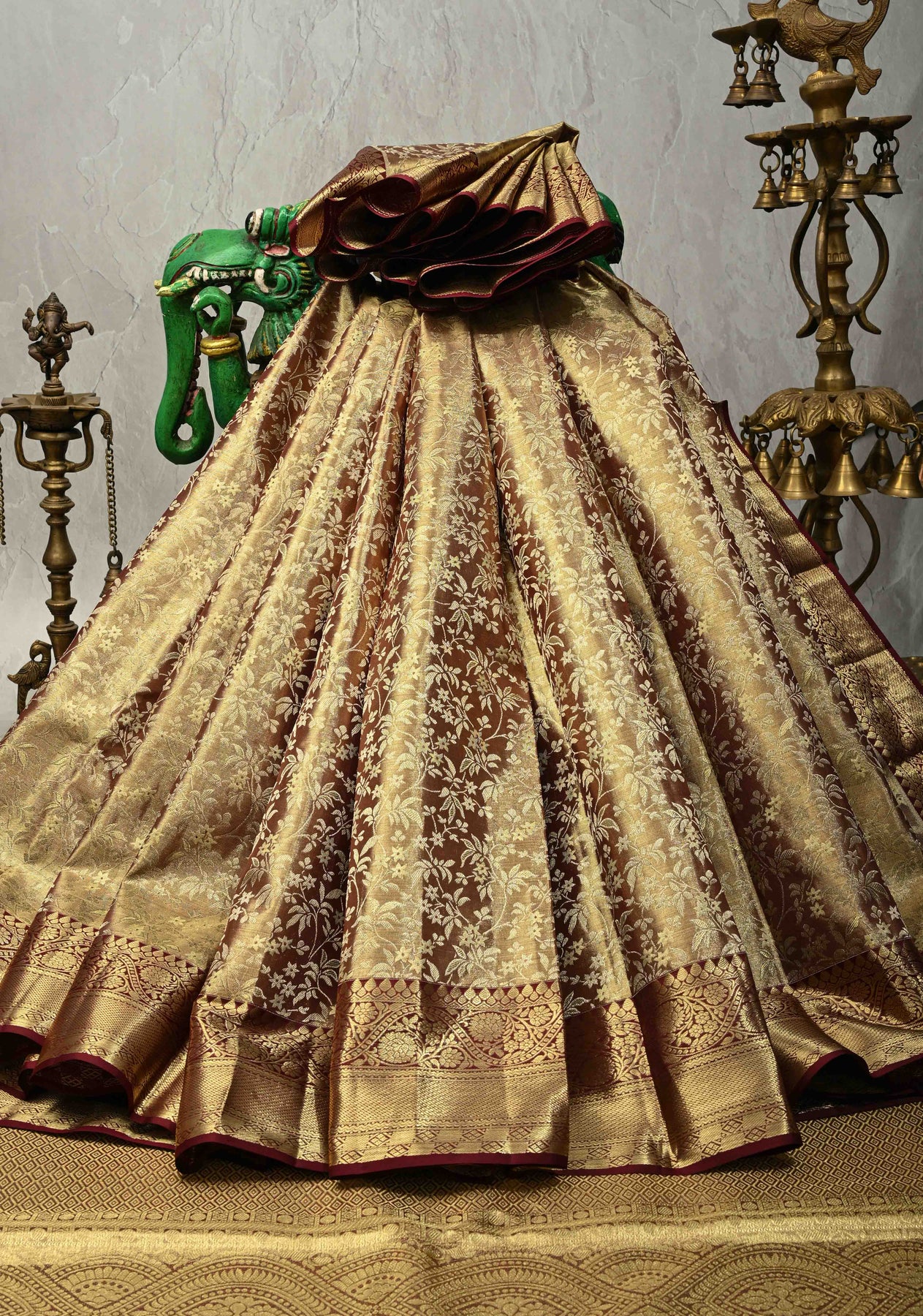 Exude timeless sophistication with this Brown Tissue Kanjivaram Pure Silk Saree, expertly crafted from tissue silk. Adorned with intricate Meenakari floral jaal brocade, the saree showcases delicate artistry and traditional elegance. The contrast zari border enhances its regal charm, making it perfect for weddings, festive occasions, and special celebrations. Lightweight and gracefully draped, this saree ensures a classic and refined look. Pair it with traditional jewelry for an effortlessly elegant ensemble.