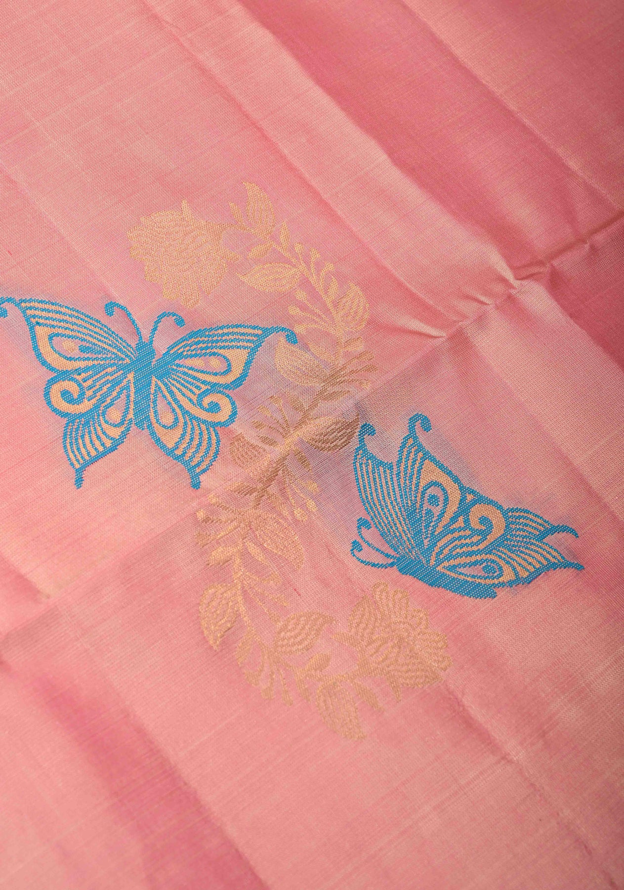 The Bubblegum Pink Dual Tone Borderless Kanjivaram Soft Silk Saree with Meenakari Butterfly and Floral Jaal is a graceful fusion of contemporary design and traditional craftsmanship. Woven from Kanjivaram soft silk, this saree showcases an intricate Meenakari butterfly and floral jaal, adding vibrant detailing and artistic elegance across the body. The borderless silhouette lends a modern, minimalist appeal, allowing the rich weaving to stand out beautifully.