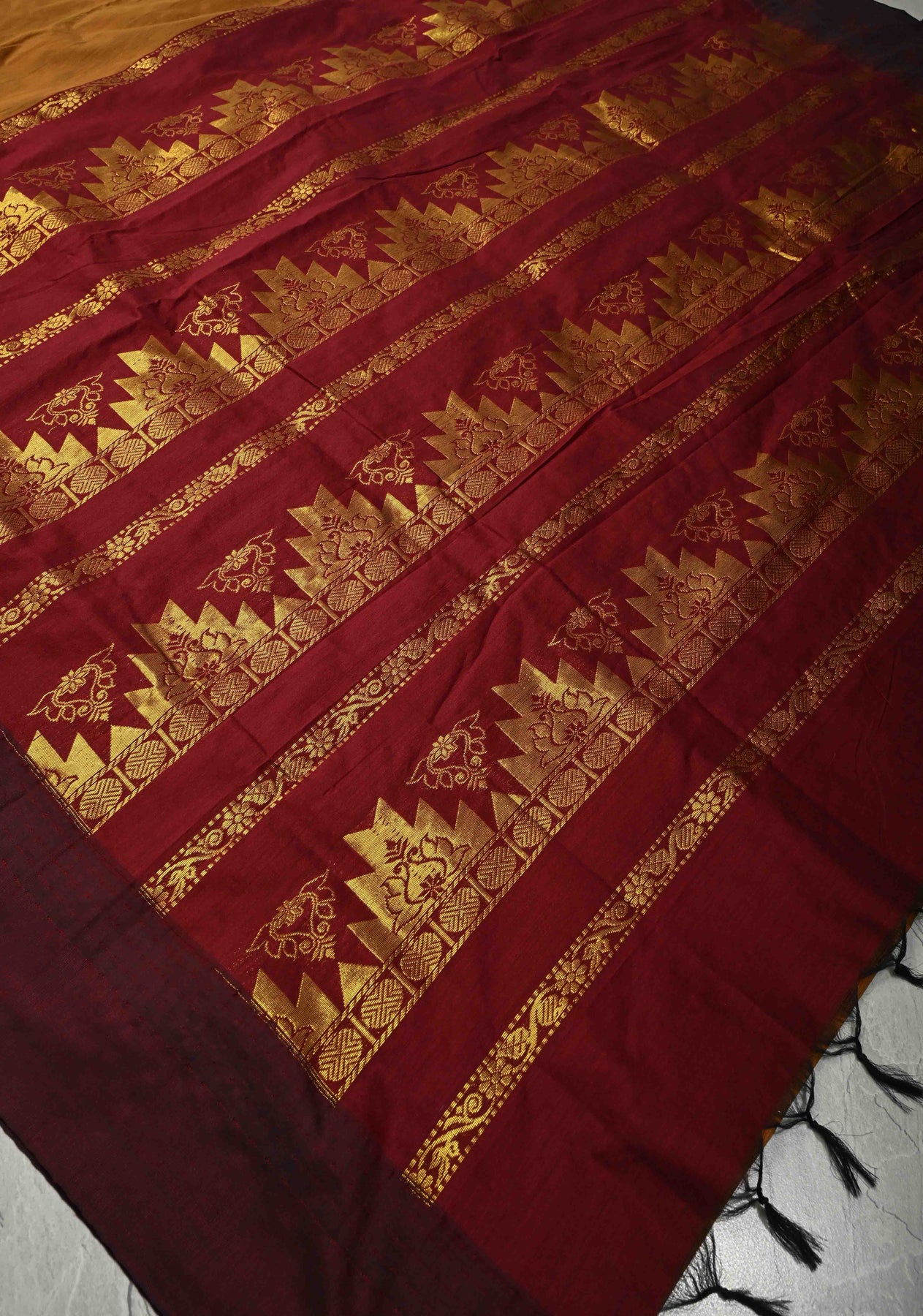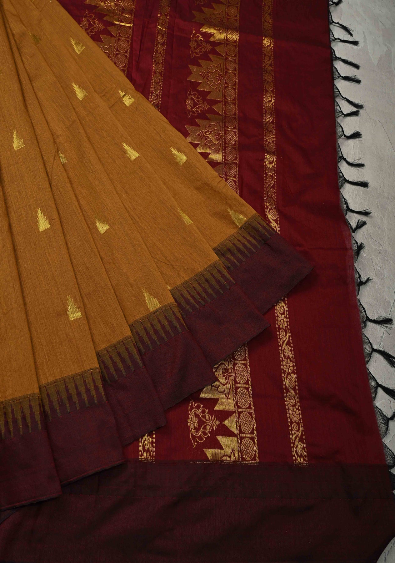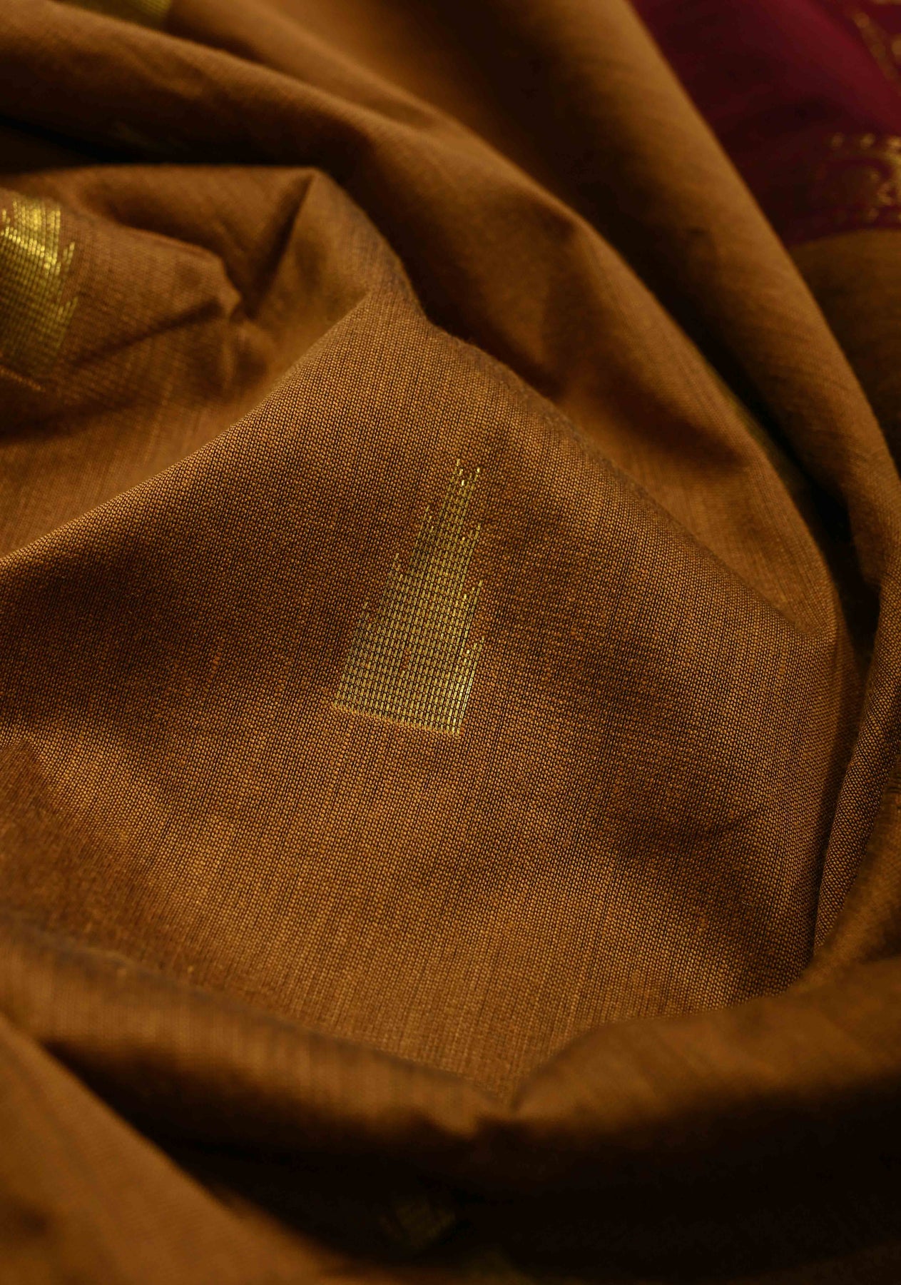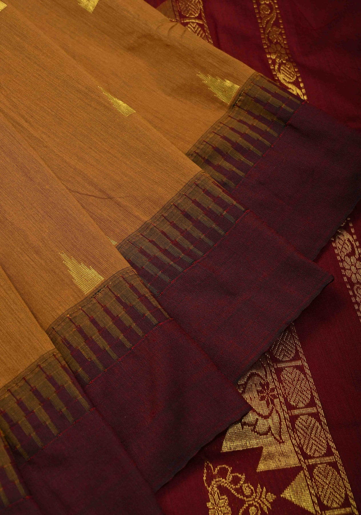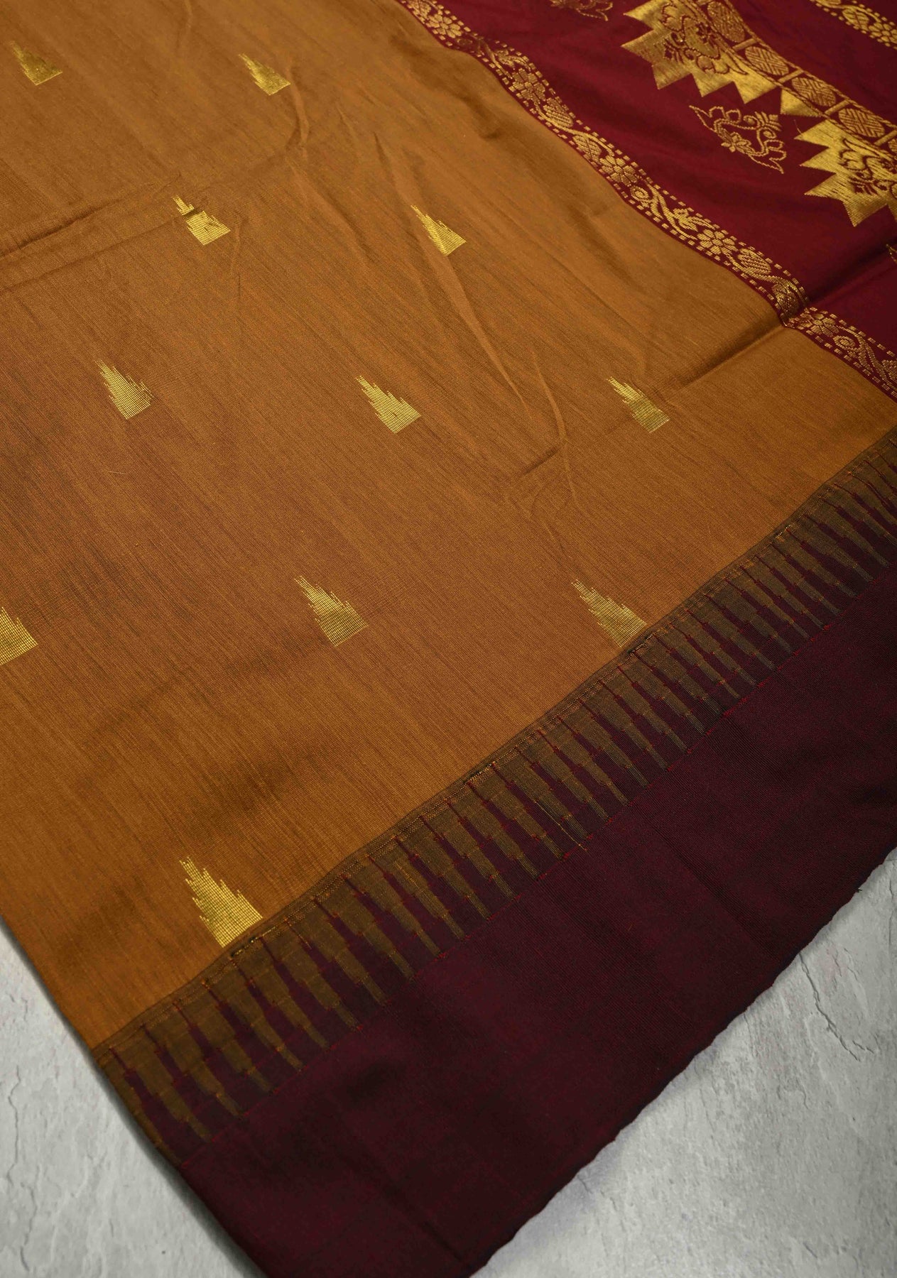 Discover timeless elegance with this Camel Brown Cotton Silk Saree, beautifully crafted to reflect classic Indian artistry. Made from a refined cotton–silk blend, the saree features elegant zari buttas that add subtle shimmer and texture. The contrast temple border lends a traditional and regal touch, enhancing its overall appeal. Lightweight with a graceful drape, this saree is perfect for festive occasions, cultural gatherings, and elegant daywear. Pair it with traditional jewelry for a poised and sophisticated look.