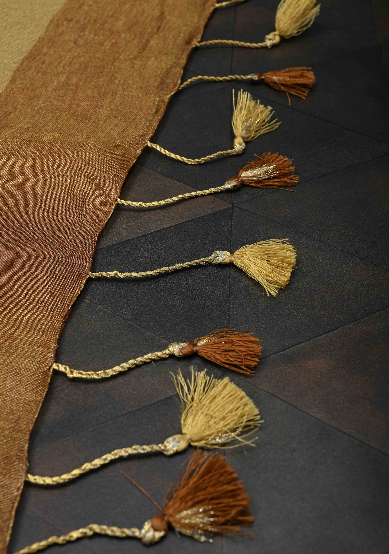 The saree is ready with fall and pico done. Long hand-knotted tassels line the pallu. An unstitched matching blouse fabric in tissue linen is included.