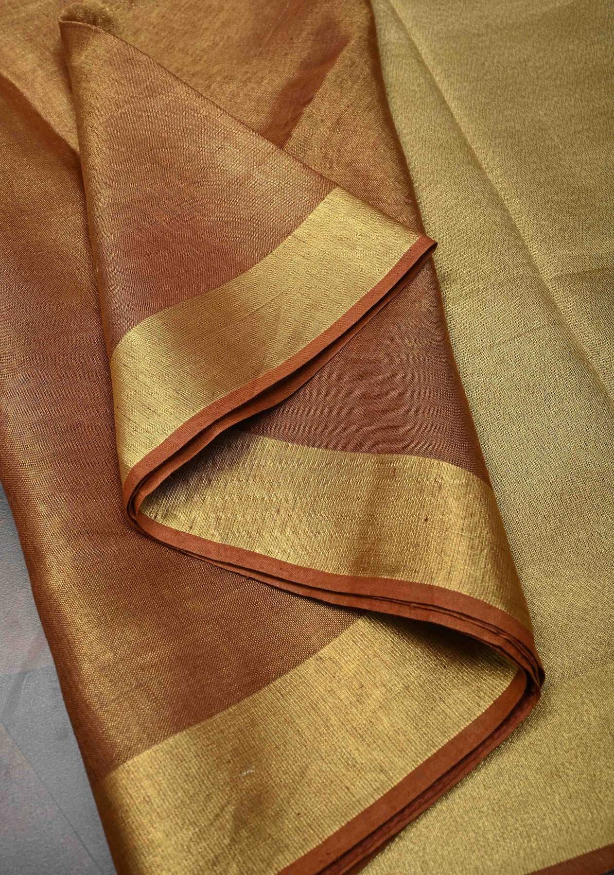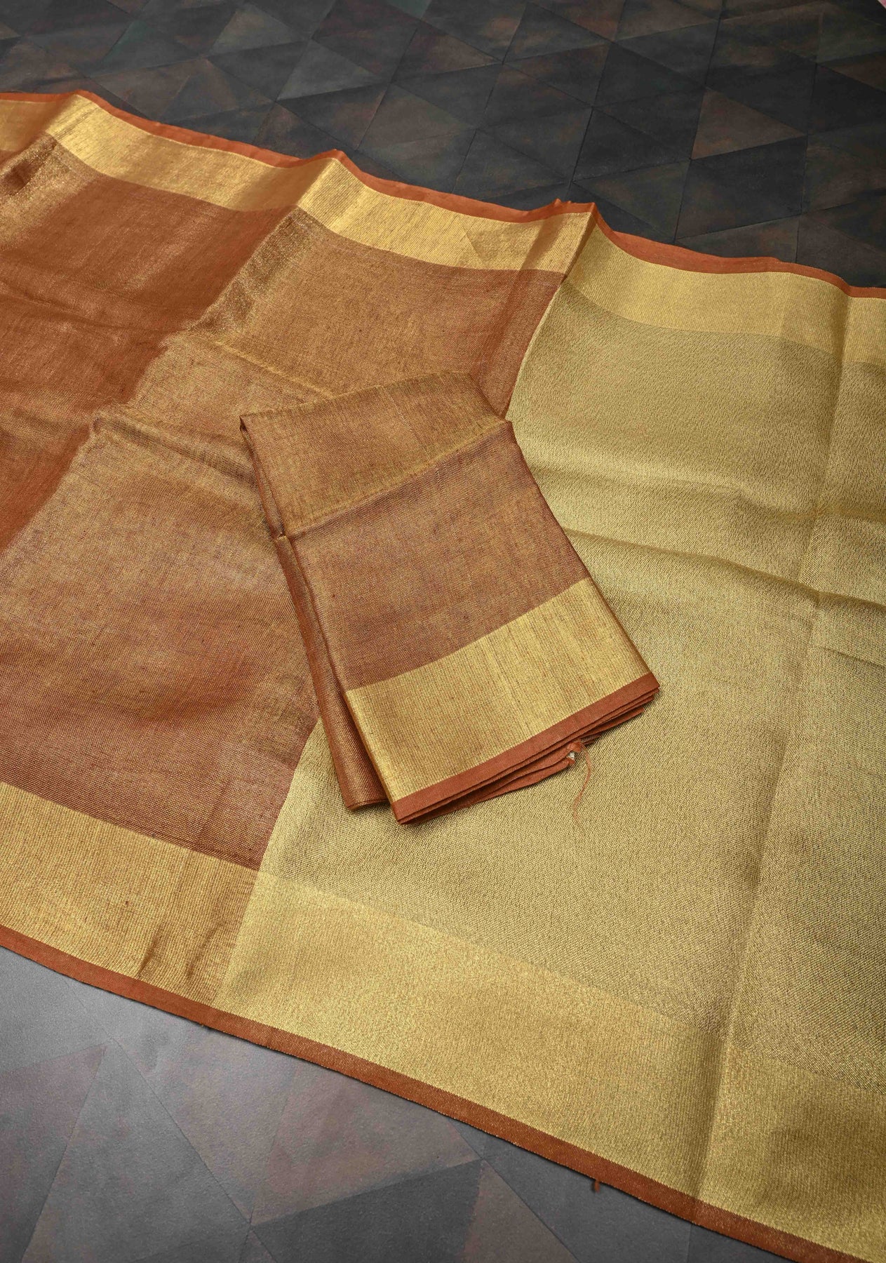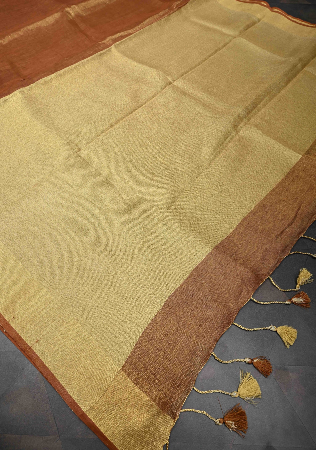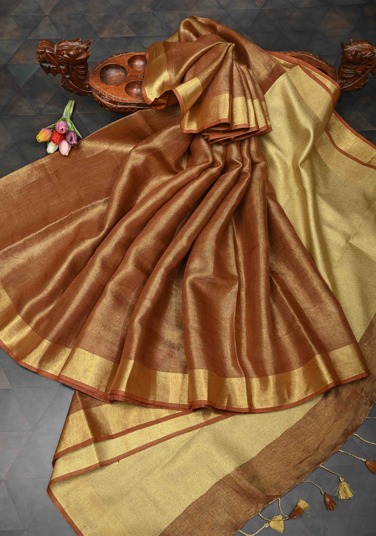 This stylish saree in Tan Gold comes in a muted metallic shade for some drama. The saree is perfect for evening wear and sure to add a lot of statement. The fabric is tissue linen which encompasses the shimmer of the tissue with the breathability of linen.