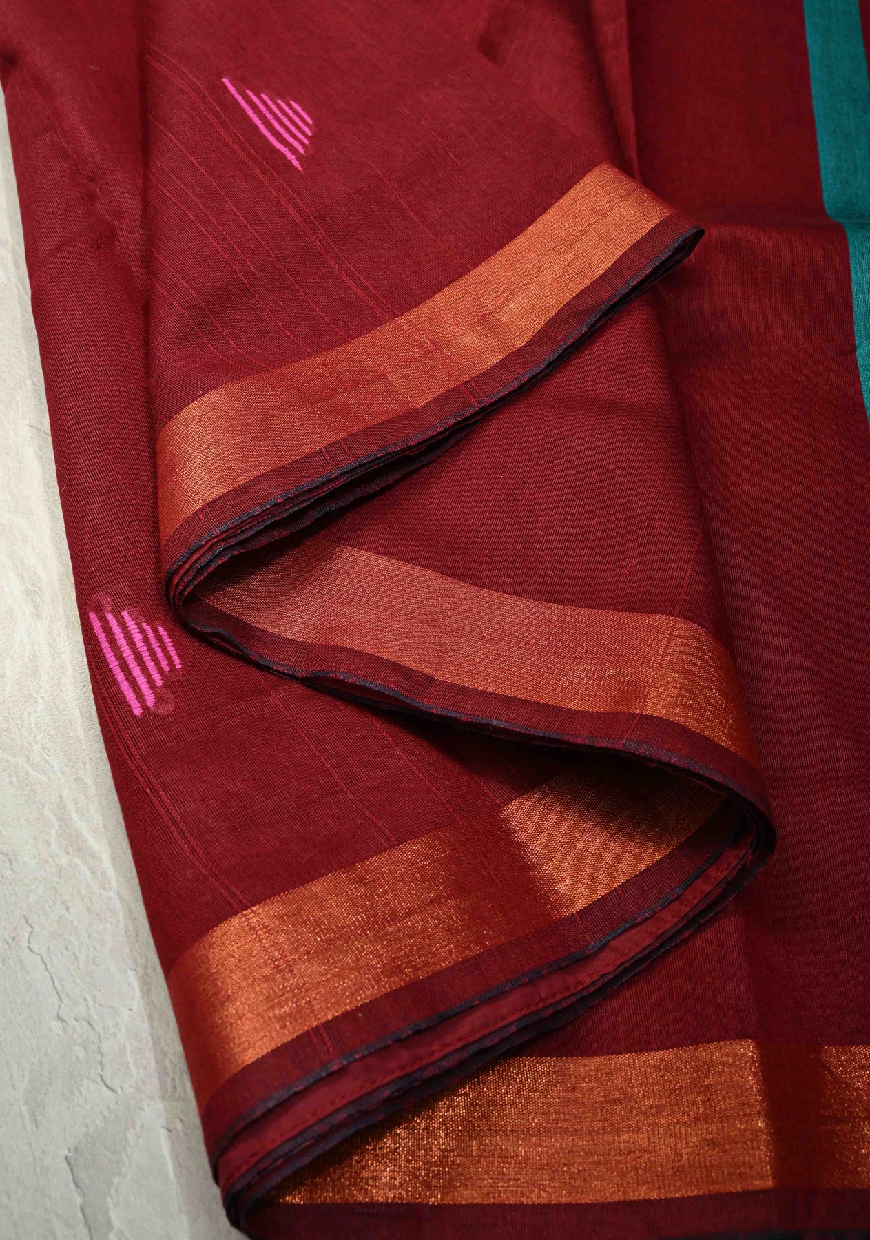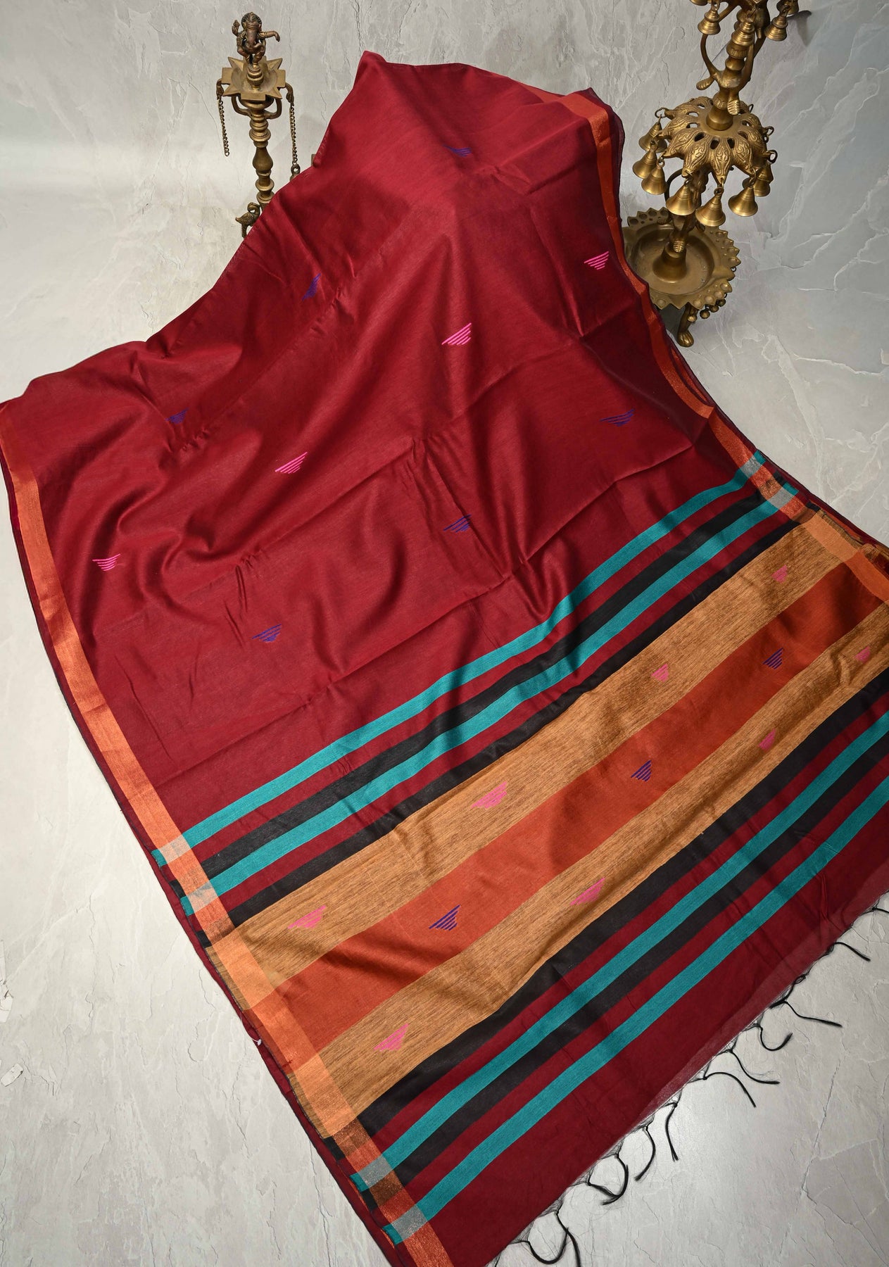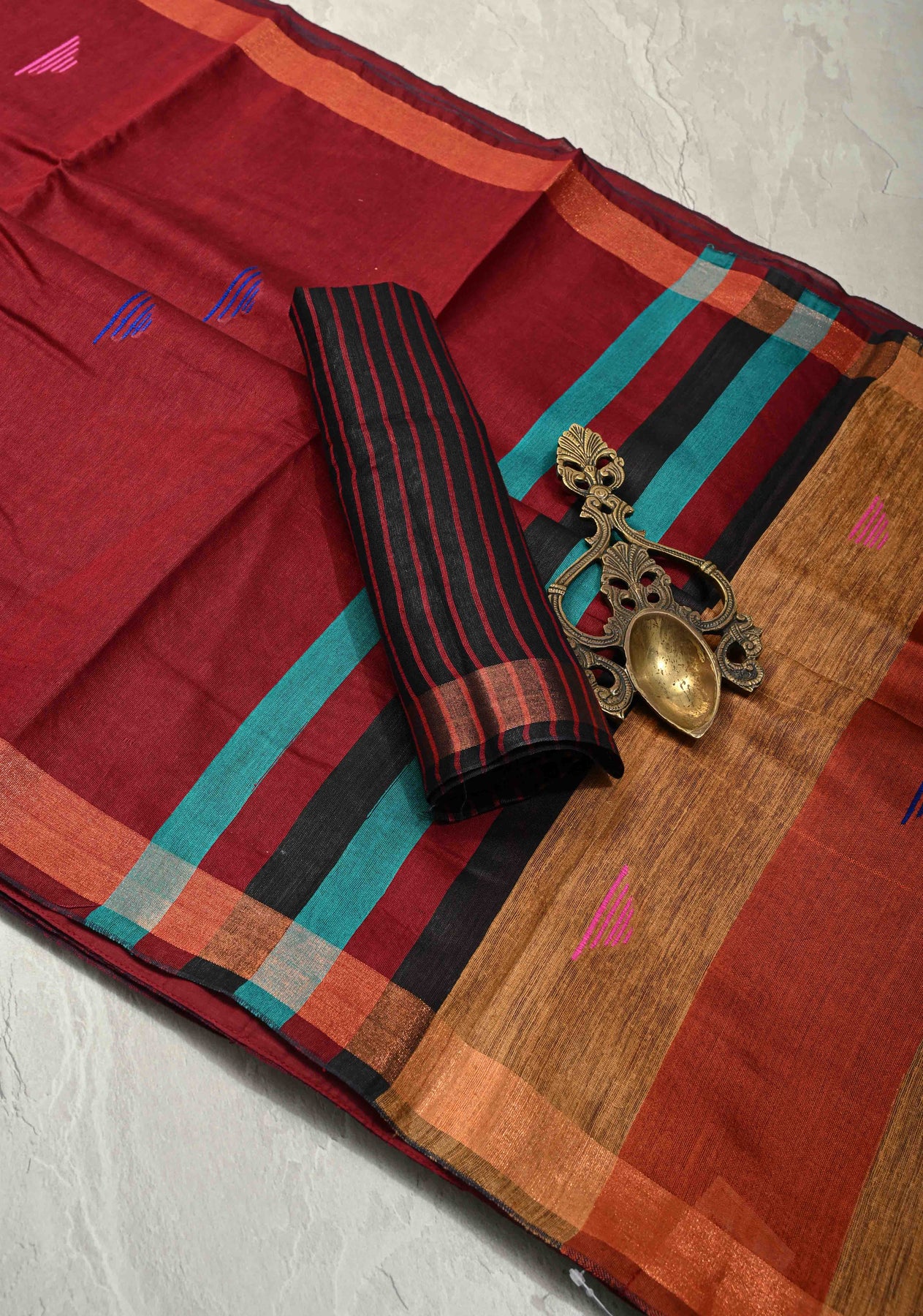The Deep Maroon Handwoven Silk Linen Saree is a sophisticated blend of natural texture and traditional detailing. Expertly handwoven from a silk linen blend, this saree features a deep maroon hue that exudes understated elegance. The body is adorned with delicate Meenakari thread buttas, adding subtle color and artisanal charm. A muted, minimal zari border completes the design, enhancing its refined aesthetic without overpowering the fabric’s natural beauty. Lightweight, breathable, and graceful, this saree is perfect for festive occasions, cultural gatherings, and elegant everyday wear.