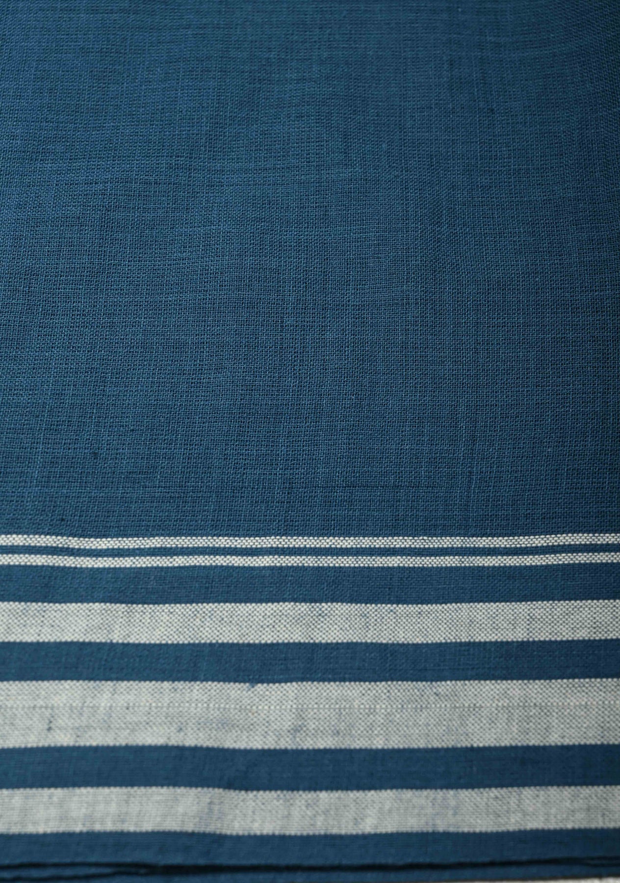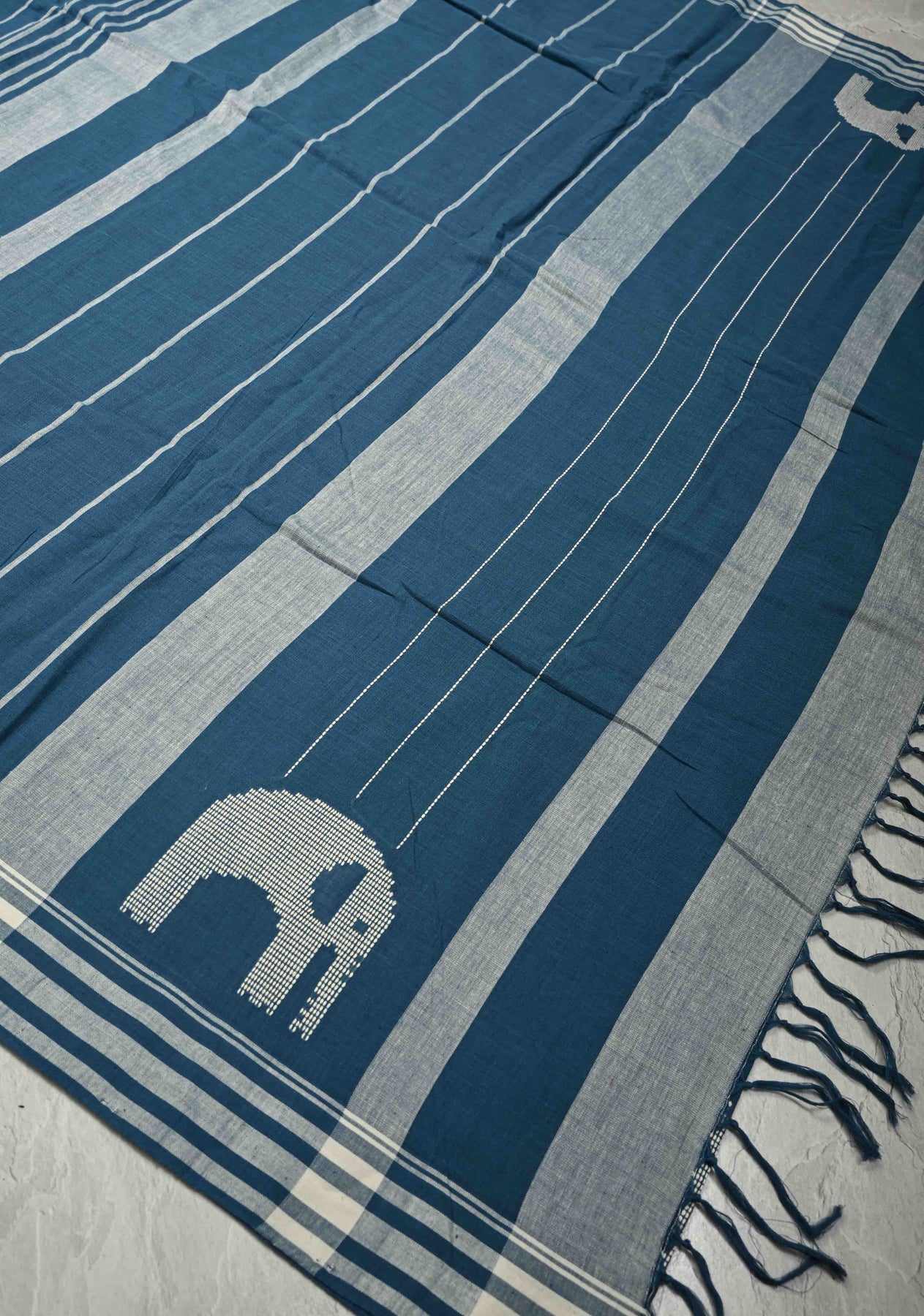 Embrace timeless elegance with this Deep Teal Heritage Bawan Buti Cotton Saree. Crafted from breathable cotton, the slate-blue body features intricate white elephant (Gaja) motifs, symbolizing strength. The design is beautifully finished with sophisticated silver-white striped borders and a matching pallu for a clean, geometric look. Perfect for office wear or cultural events, it combines heritage artistry with modern comfort for a truly dignified drape.
