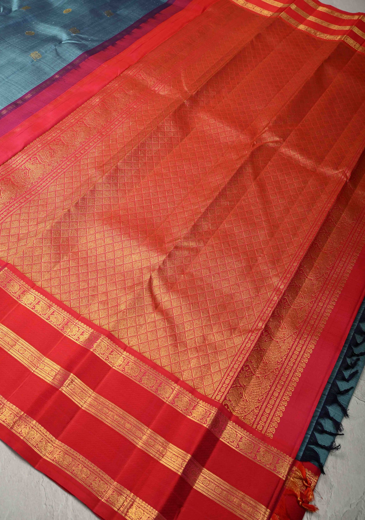 Elevate your ethnic wardrobe with this Dusty Blue Dual Tone Pure Kanjivaram Silk Saree, a perfect blend of tradition and elegance. Woven from pure Kanjivaram silk, the saree is adorned with delicate zari buttas that add a subtle shimmer across its graceful body. The contrast zari border enhances the saree’s dual-tone appeal, giving it a regal and refined finish. Ideal for weddings, festive celebrations, and grand traditional occasions, this saree drapes beautifully, offering timeless sophistication.