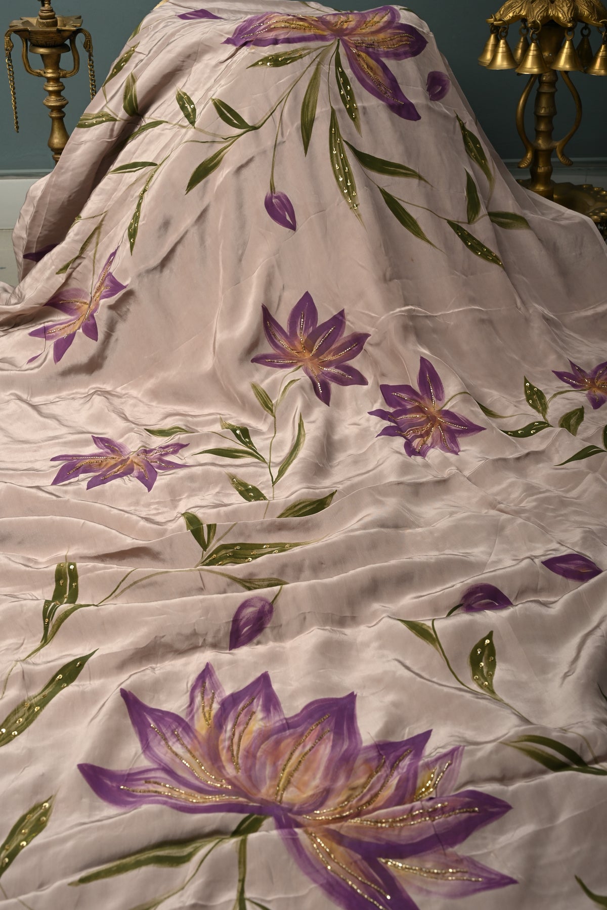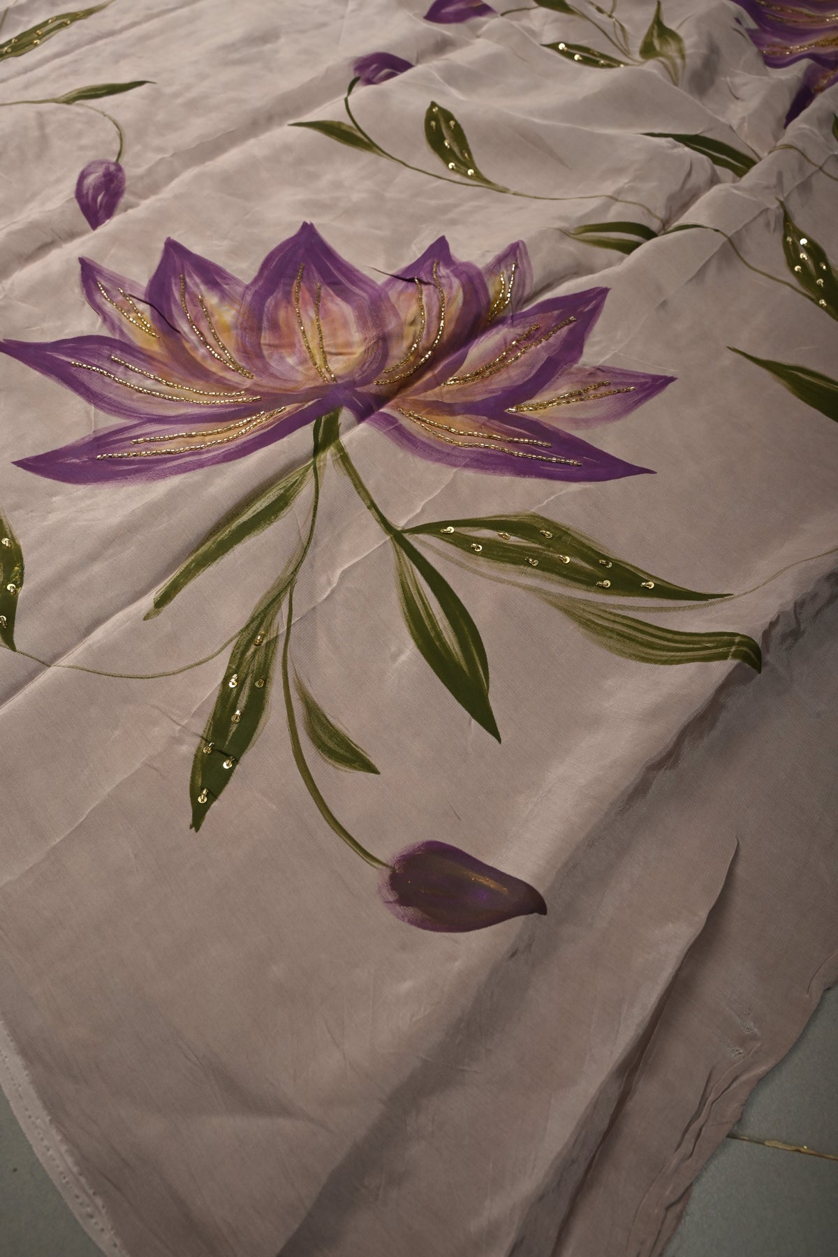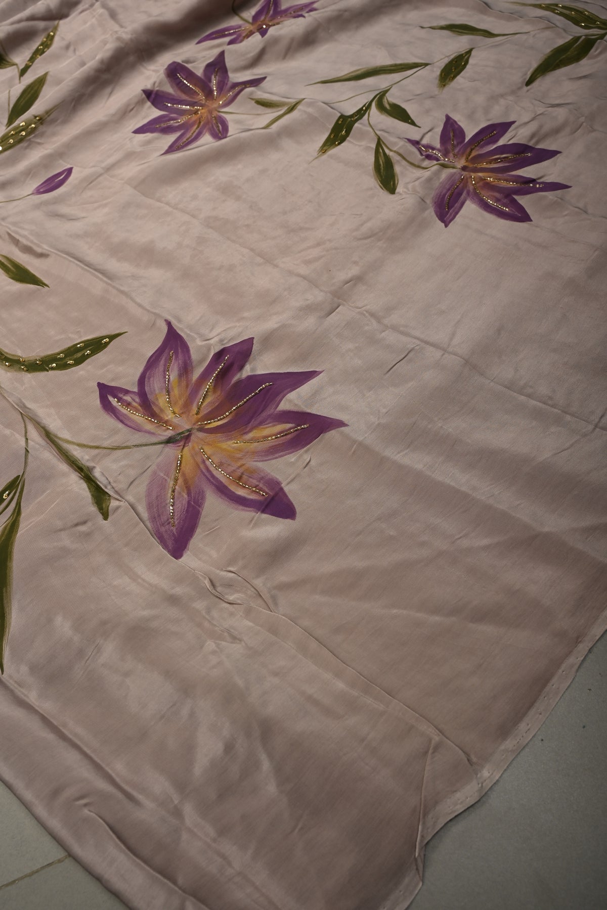 The Dusty Mauve Borderless Modal Silk Saree is a delicate expression of elegance and handcrafted beauty. Made from soft, lightweight modal silk, this saree offers a smooth texture and fluid drape for effortless grace. The soothing dusty mauve hue is adorned with intricate lotus hand-painted motifs, symbolizing purity and timeless charm. Enhanced with subtle sequins and cutdana handwork, it adds a refined shimmer without overpowering the design. The borderless finish lends a modern, minimalist appeal, making it perfect for festive gatherings, intimate celebrations, and sophisticated evening occasions.