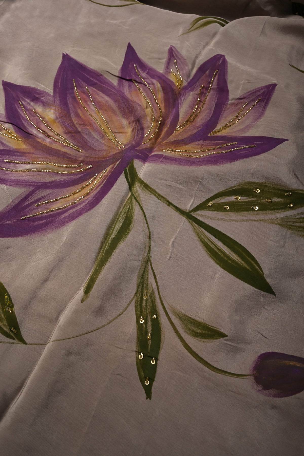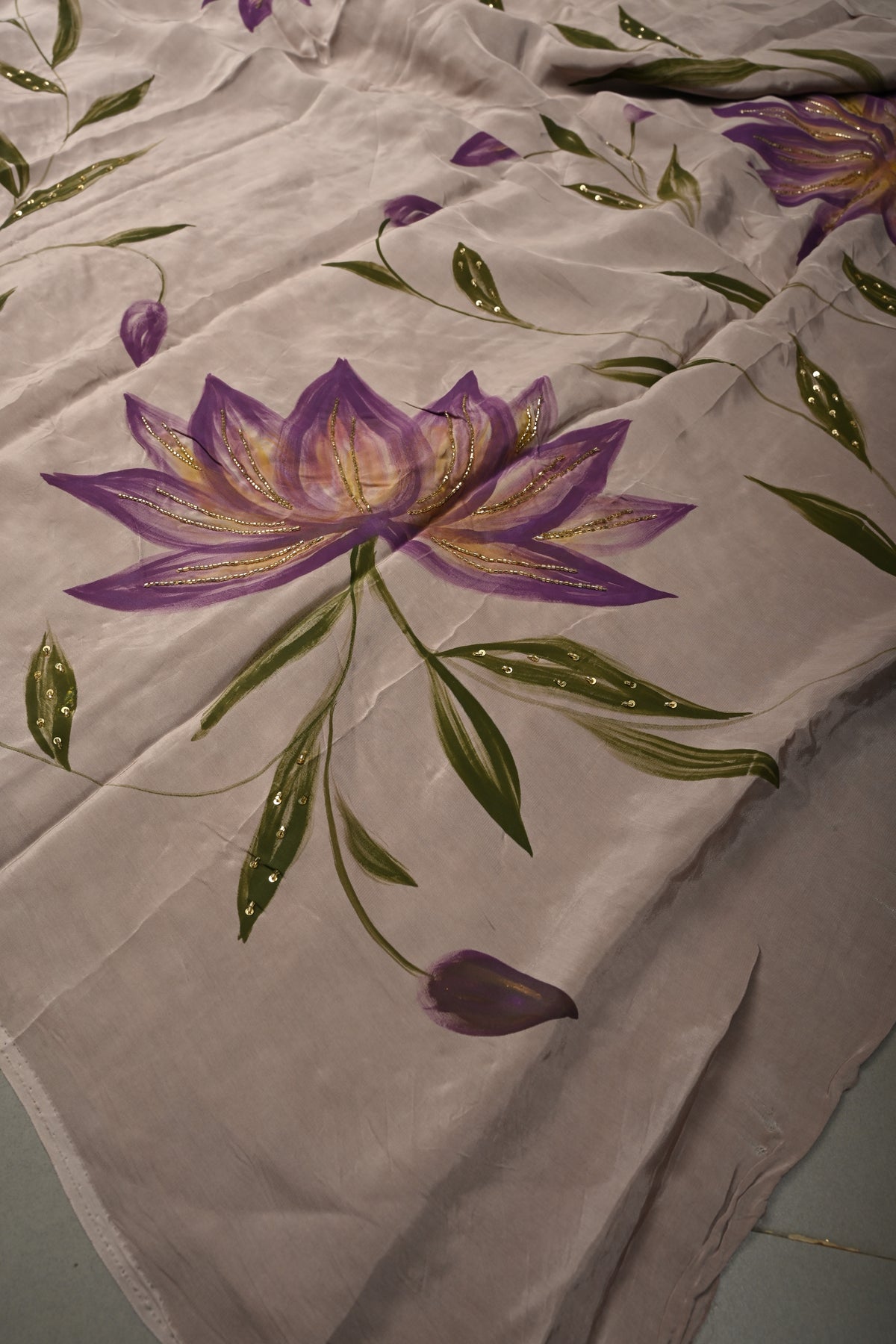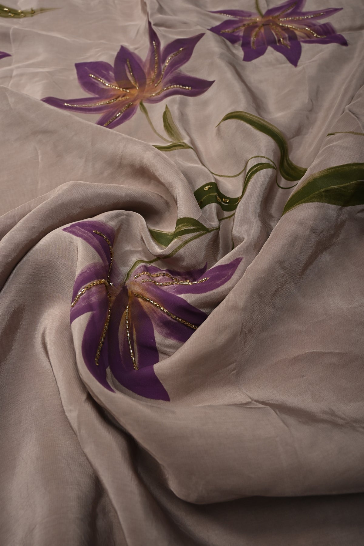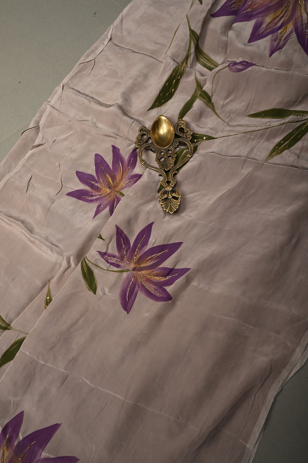 The Dusty Mauve Borderless Modal Silk Saree is a delicate expression of elegance and handcrafted beauty. Made from soft, lightweight modal silk, this saree offers a smooth texture and fluid drape for effortless grace. The soothing dusty mauve hue is adorned with intricate lotus hand-painted motifs, symbolizing purity and timeless charm. Enhanced with subtle sequins and cutdana handwork, it adds a refined shimmer without overpowering the design. The borderless finish lends a modern, minimalist appeal, making it perfect for festive gatherings, intimate celebrations, and sophisticated evening occasions.