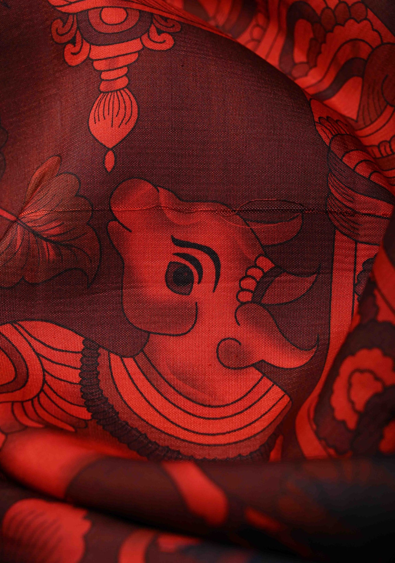 This garnet pure Kanjivaram silk saree showcases an exquisite Kalamkari-style Pichwai digital print, bringing artistic richness and cultural elegance to the luxurious silk base. The body is adorned with distinct gold and silver buttas that add a refined shimmer and traditional charm. A striking contrast Rettaipet border enhances the saree with bold character and classic Kanchipuram craftsmanship. Woven from pure silk, it reflects heritage artistry with a contemporary aesthetic. Ideal for weddings, festive occasions, and special celebrations, this saree makes a graceful statement of timeless beauty.