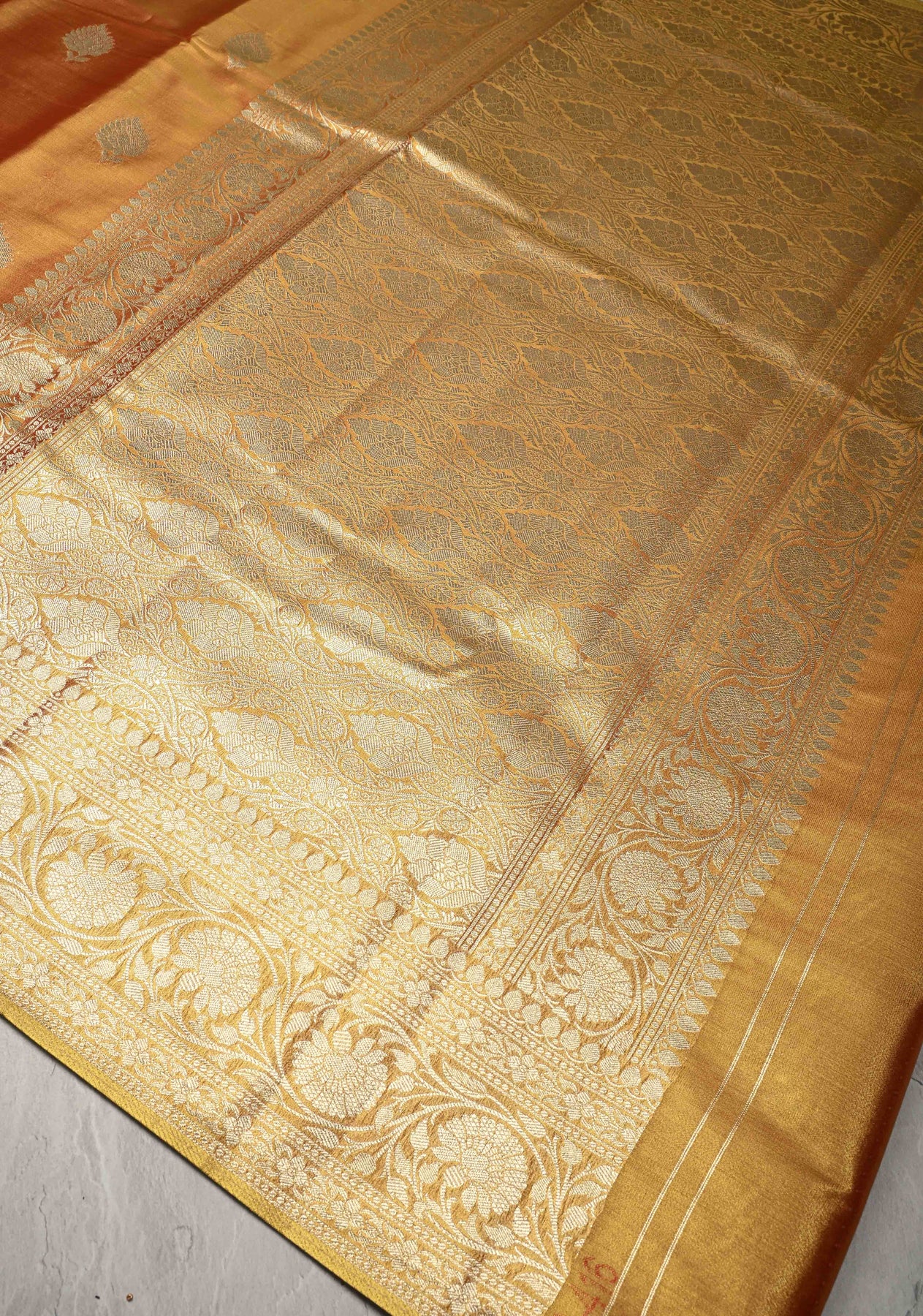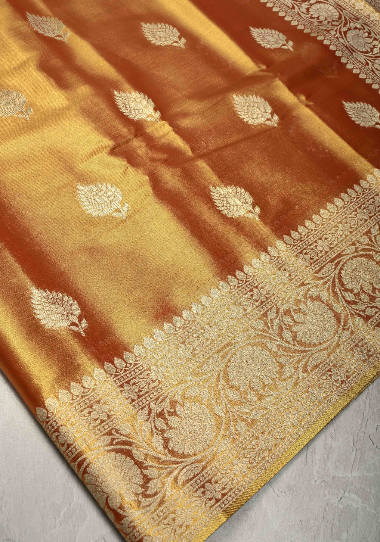 Embrace timeless elegance with our Gold Dual Tone Kanchi Tissue Semi Silk Saree, designed for the modern woman who values heritage. This saree features a rich dual-tone gold body that shimmers with every movement, crafted in luxurious semi silk with a tissue finish. Intricately woven Floral Buttas adorn the body, adding a soft, feminine charm. The look is completed with a traditional Zari border, giving it a regal edge perfect for weddings, festive occasions, and grand celebrations. Pair it with traditional jewelry and a classic blouse to turn heads effortlessly.