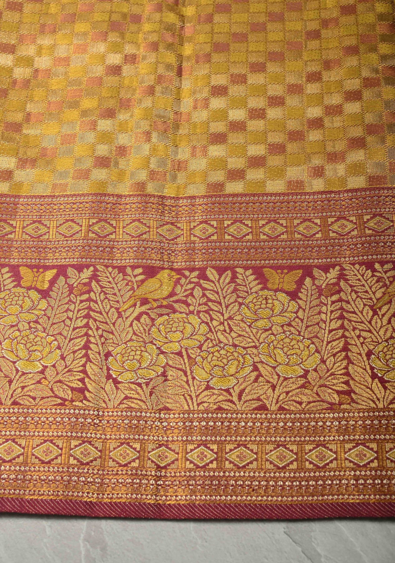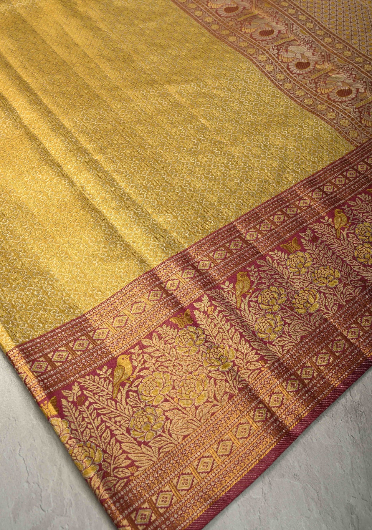 This gold pure Kanjivaram tissue silk saree is a magnificent celebration of heritage craftsmanship and regal beauty. Woven in tissue silk, it features an elaborate rangoli brocade jaal that adds intricate texture and traditional symbolism to the saree. The contrast meenakari birds and floral border brings vibrant color and artistic charm, creating a striking and luxurious finish. Ideal for weddings, festive occasions, and grand celebrations, this saree embodies timeless elegance and South Indian weaving excellence.