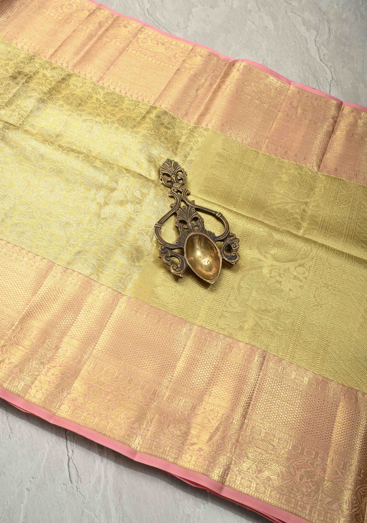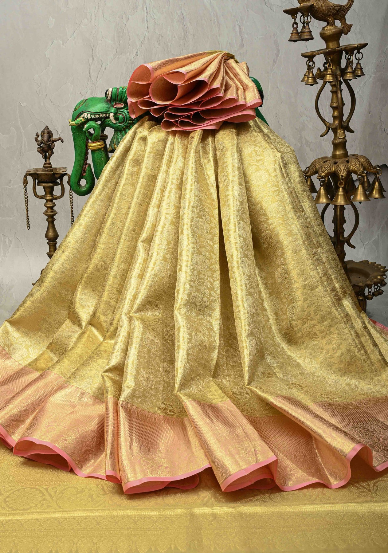 Exude timeless grandeur with this Gold Tissue Kanjivaram Pure Silk Saree, exquisitely woven to reflect classic South Indian craftsmanship. Crafted from tissue silk, the saree features an intricate floral jaal brocade that adds texture and elegant detailing throughout. The wide zari border enhances its regal appeal, lending a majestic and opulent finish. With its luminous sheen and graceful drape, this saree is an ideal choice for weddings, festive occasions, and special celebrations. Pair it with traditional jewelry for a truly elegant and heritage-inspired look.