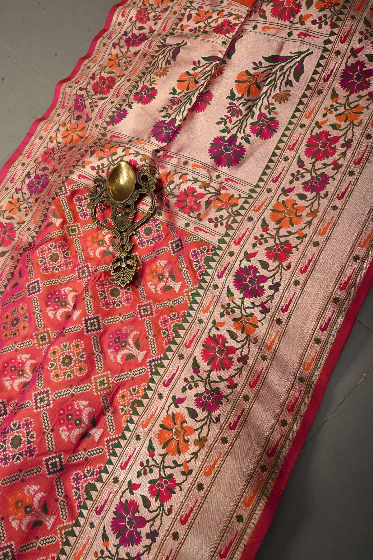 The saree features an exquisite meenakari floral zari brocade jaal, intricately woven with delicate gold and colored threads, creating a regal and artistic look. Its Paithani-style zari border adds a classic touch of elegance with colorful enamel detailing, completing the saree’s sophisticated appeal.