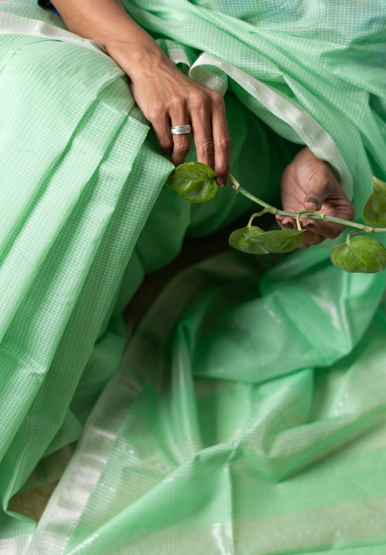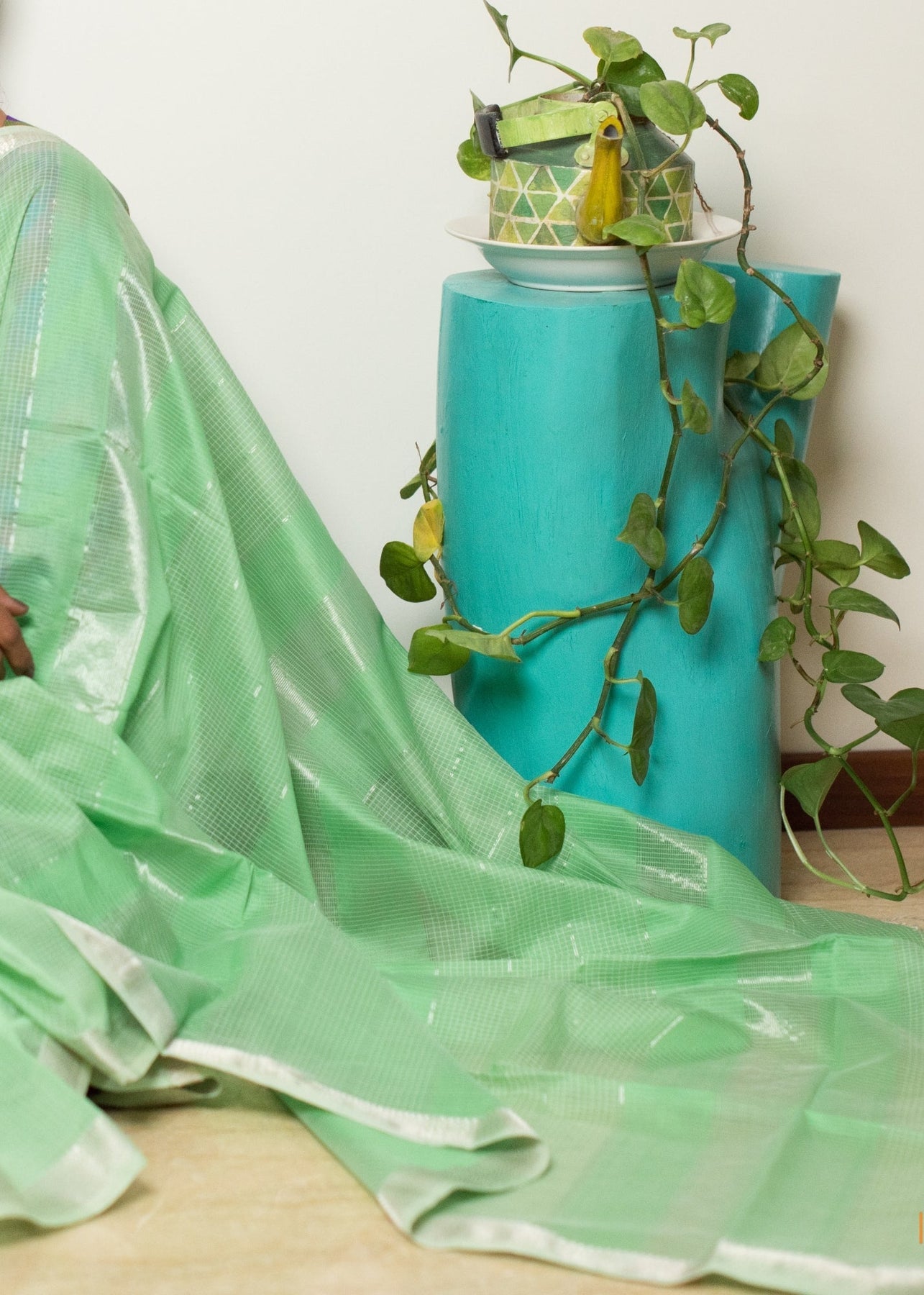 An elegant handwoven Maheshwari silk cotton saree in light green with silver zari borders. The saree body is checkered while the borders have narmada lehar motifs. The pallu features traditional lines and stripes in silver.