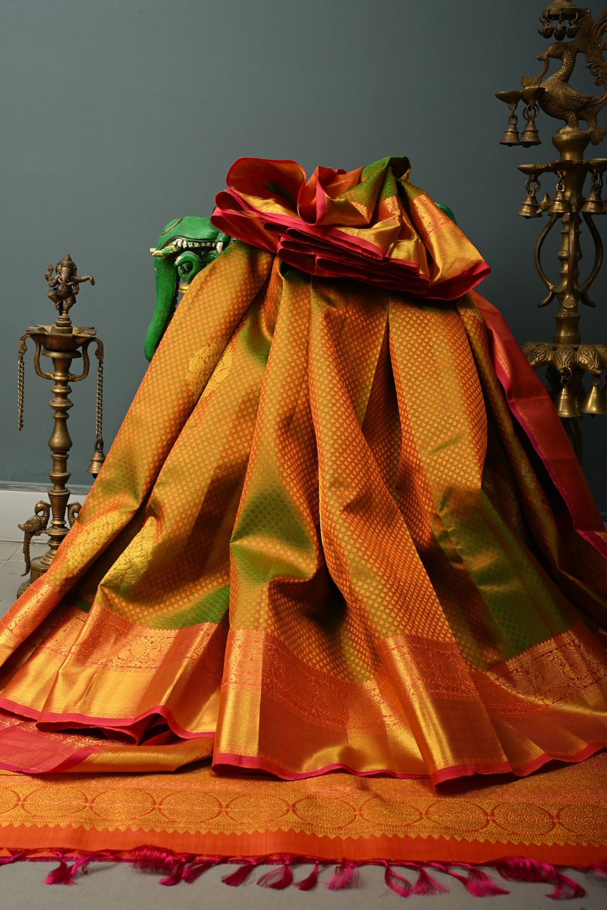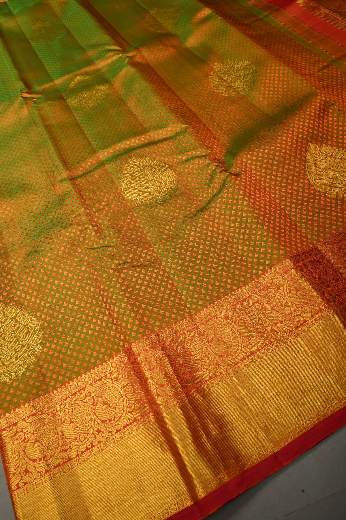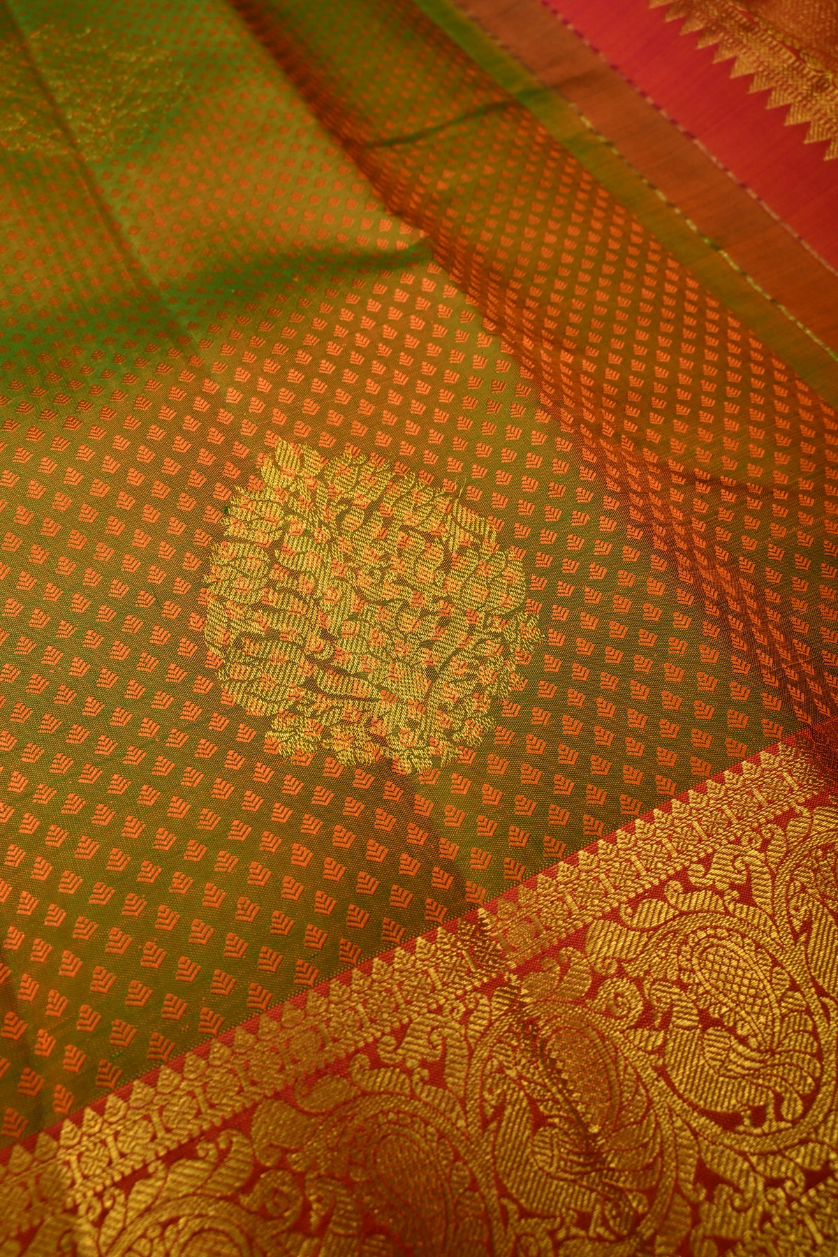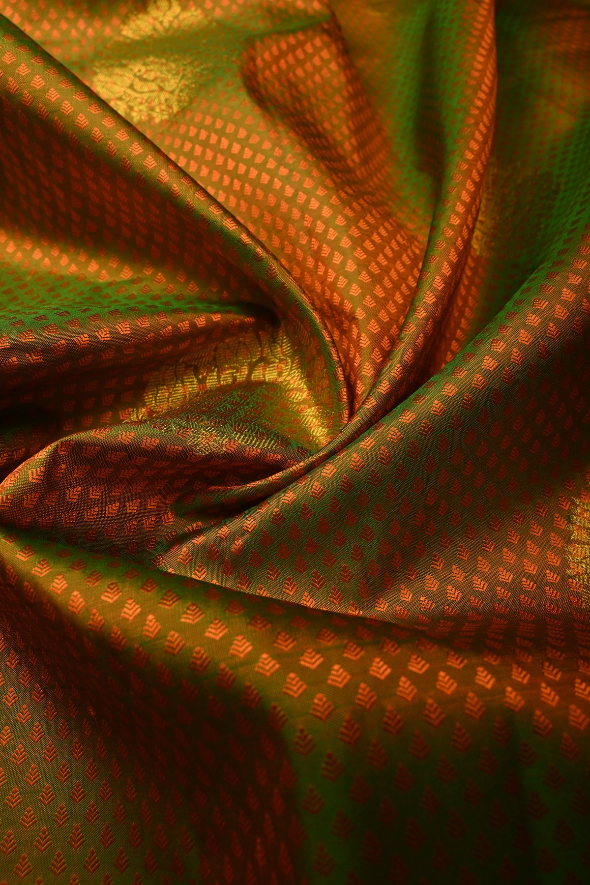 Elegant and regal, this Henna Green Dual Tone Kanjivaram Pure Silk Saree beautifully showcases traditional South Indian craftsmanship. The rich dual-tone henna green body features intricate self-brocade weaving, adding depth and texture to the saree. Delicate zari buttas scattered across the fabric enhance its opulent look, while a golden zari border frames the saree with classic grandeur. Lightweight yet luxurious, this saree drapes gracefully, making it perfect for weddings, festive occasions, and special celebrations where timeless elegance is desired. ✨