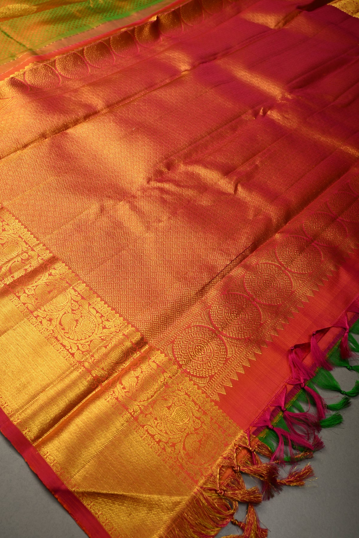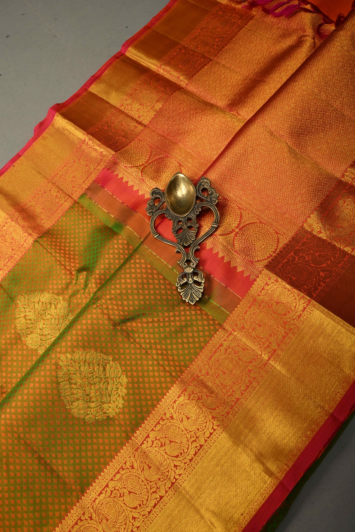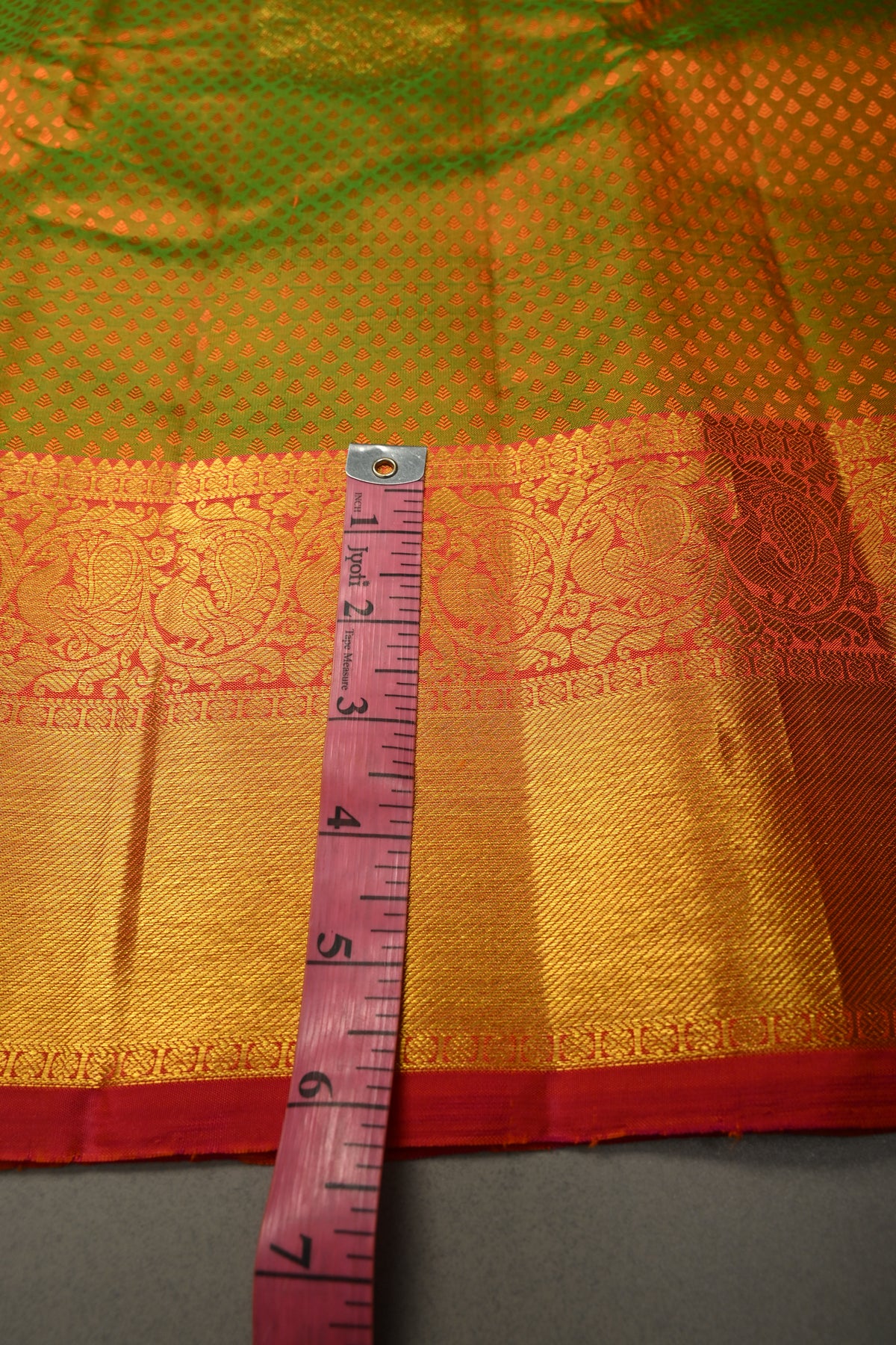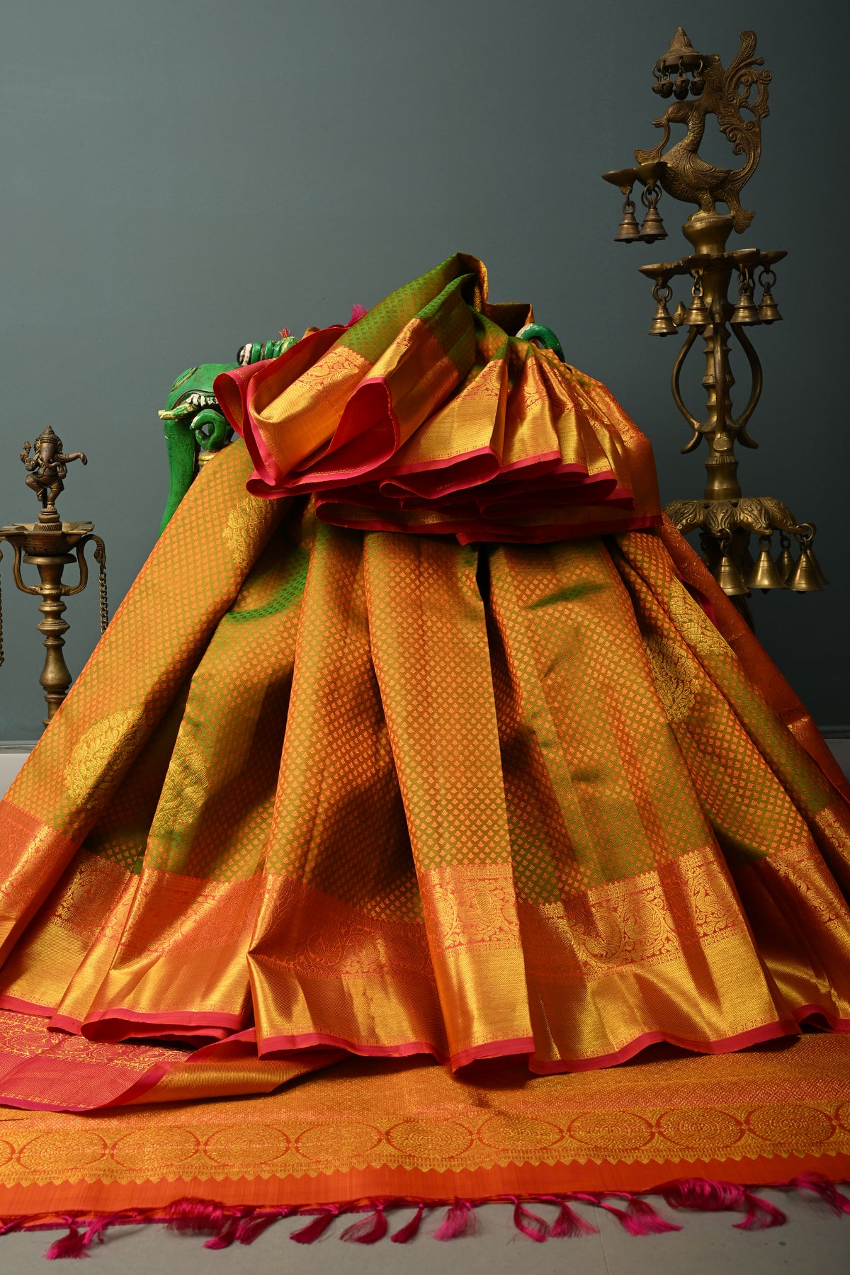 Elegant and regal, this Henna Green Dual Tone Kanjivaram Pure Silk Saree beautifully showcases traditional South Indian craftsmanship. The rich dual-tone henna green body features intricate self-brocade weaving, adding depth and texture to the saree. Delicate zari buttas scattered across the fabric enhance its opulent look, while a golden zari border frames the saree with classic grandeur. Lightweight yet luxurious, this saree drapes gracefully, making it perfect for weddings, festive occasions, and special celebrations where timeless elegance is desired. ✨