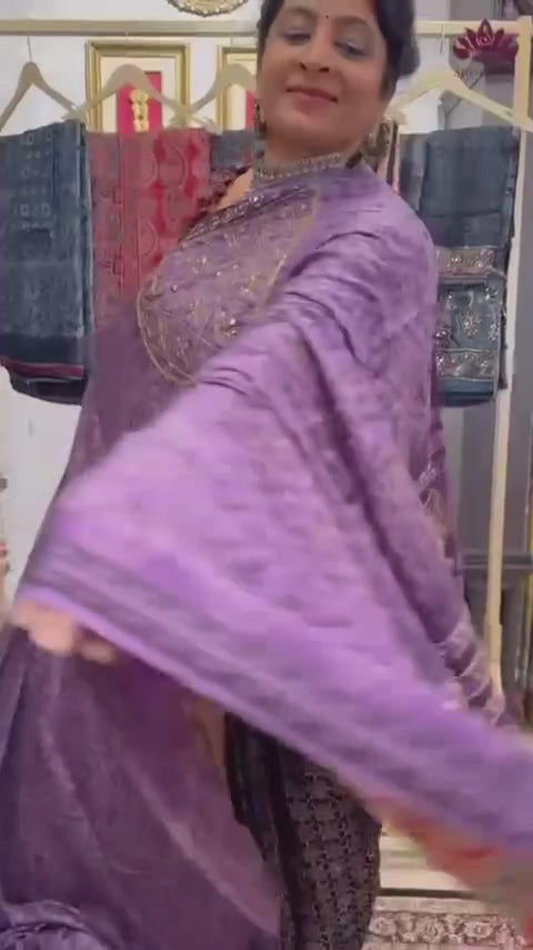 This lavender modal silk saree is a graceful blend of softness, sheen, and artisan elegance. Crafted from modal silk, it drapes beautifully and feels feather-light on the skin. The saree features intricate Vanaspati hand block prints inspired by nature, adding a subtle yet timeless charm to its soothing lavender base. Delicate embellishments of cutdana, sequins, and tikki work are meticulously hand-worked across the body and pallu, creating a refined shimmer that catches the light without overpowering the design. Perfect for festive occasions, celebrations, or elegant evening gatherings, this saree beautifully balances traditional craftsmanship with contemporary sophistication.