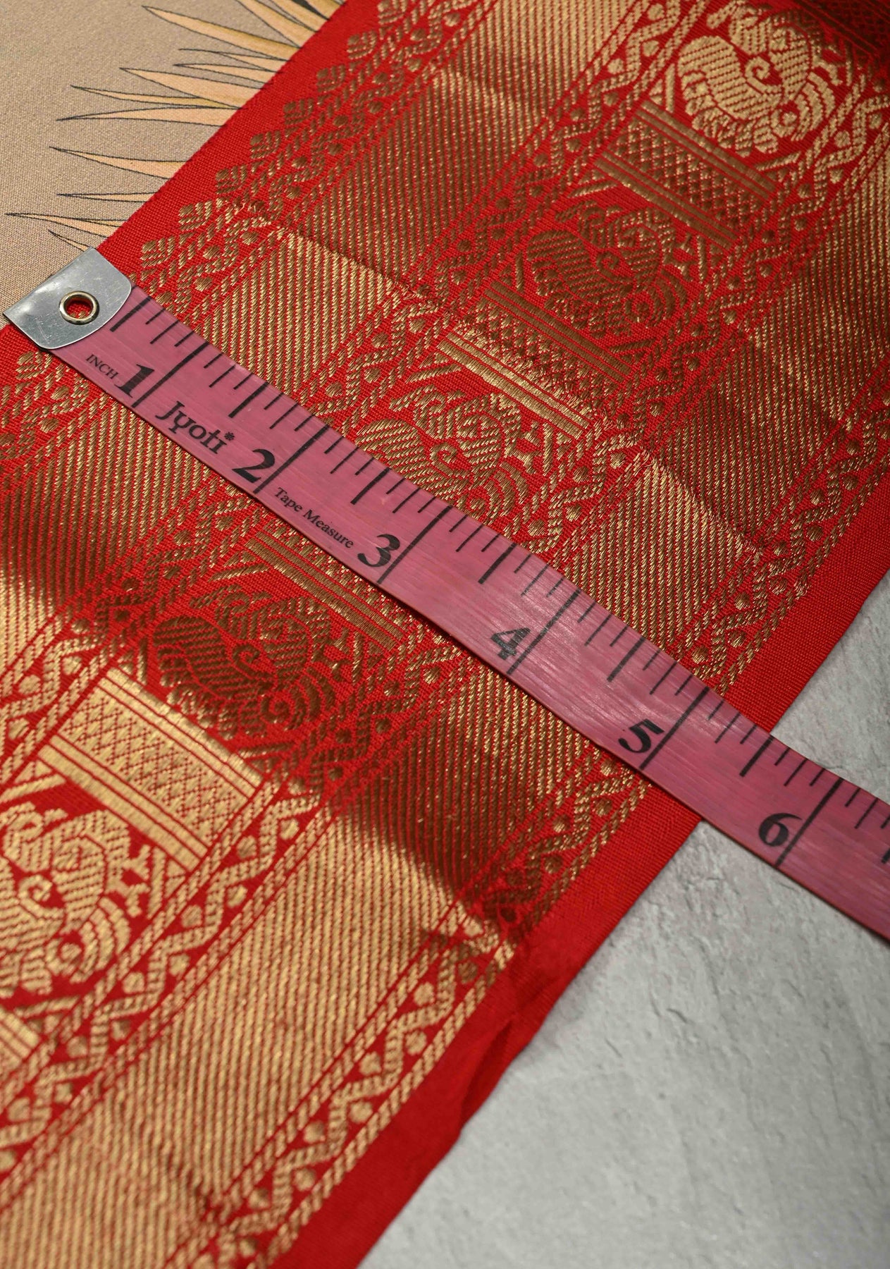 This light beige pure Kanjivaram silk saree showcases a graceful blend of tradition and contemporary design. Adorned with vibrant tropical flowers digital prints across the body, it brings a fresh and elegant charm to the classic silk weave. The saree is beautifully framed with a rich contrast zari border that adds a touch of regal sophistication. Crafted from lustrous pure silk, this saree is an ideal choice for weddings, festive celebrations, and special occasions where timeless elegance meets modern artistry.