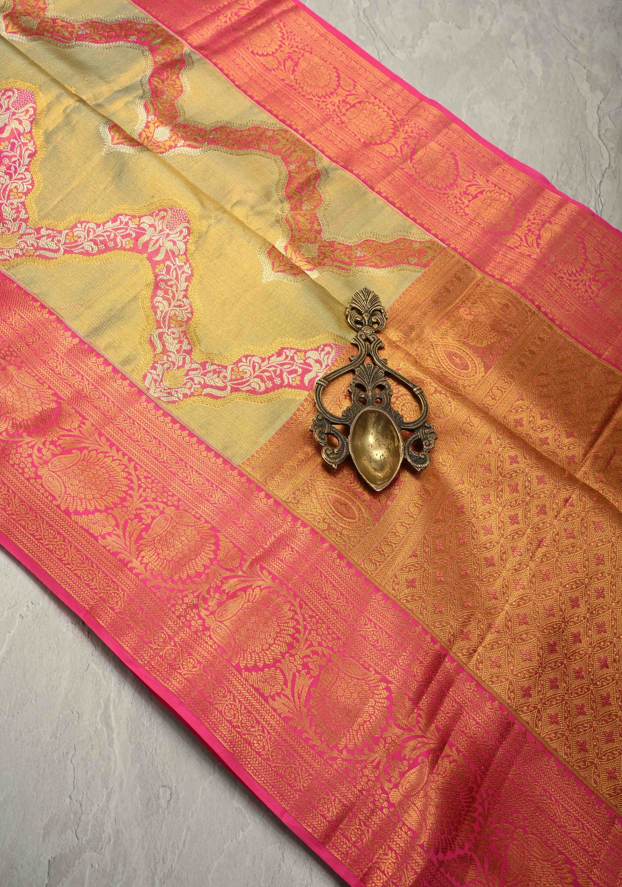 Light Green Tissue Kanjivaram Pure Silk Saree With Meenakari Leheria Design and Zari Border | SILK MARK CERTIFIED