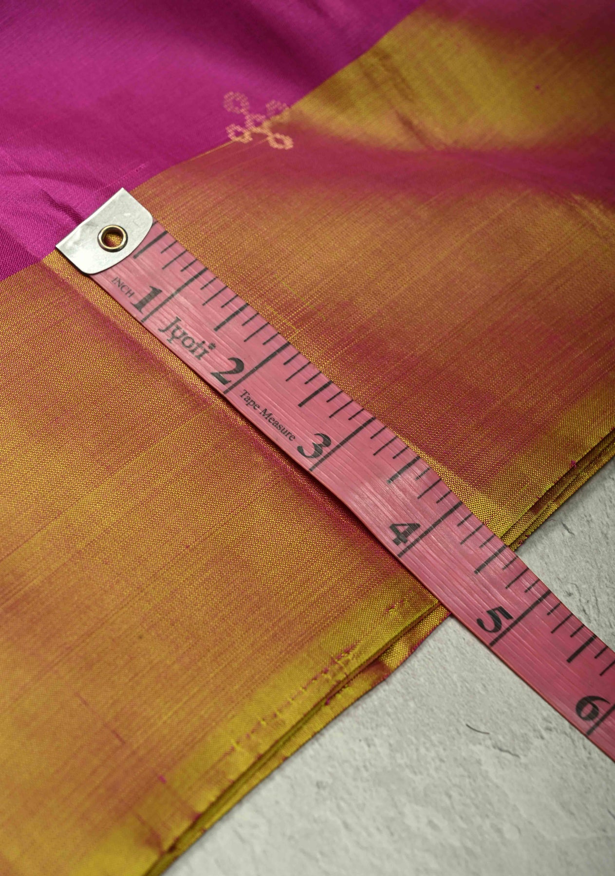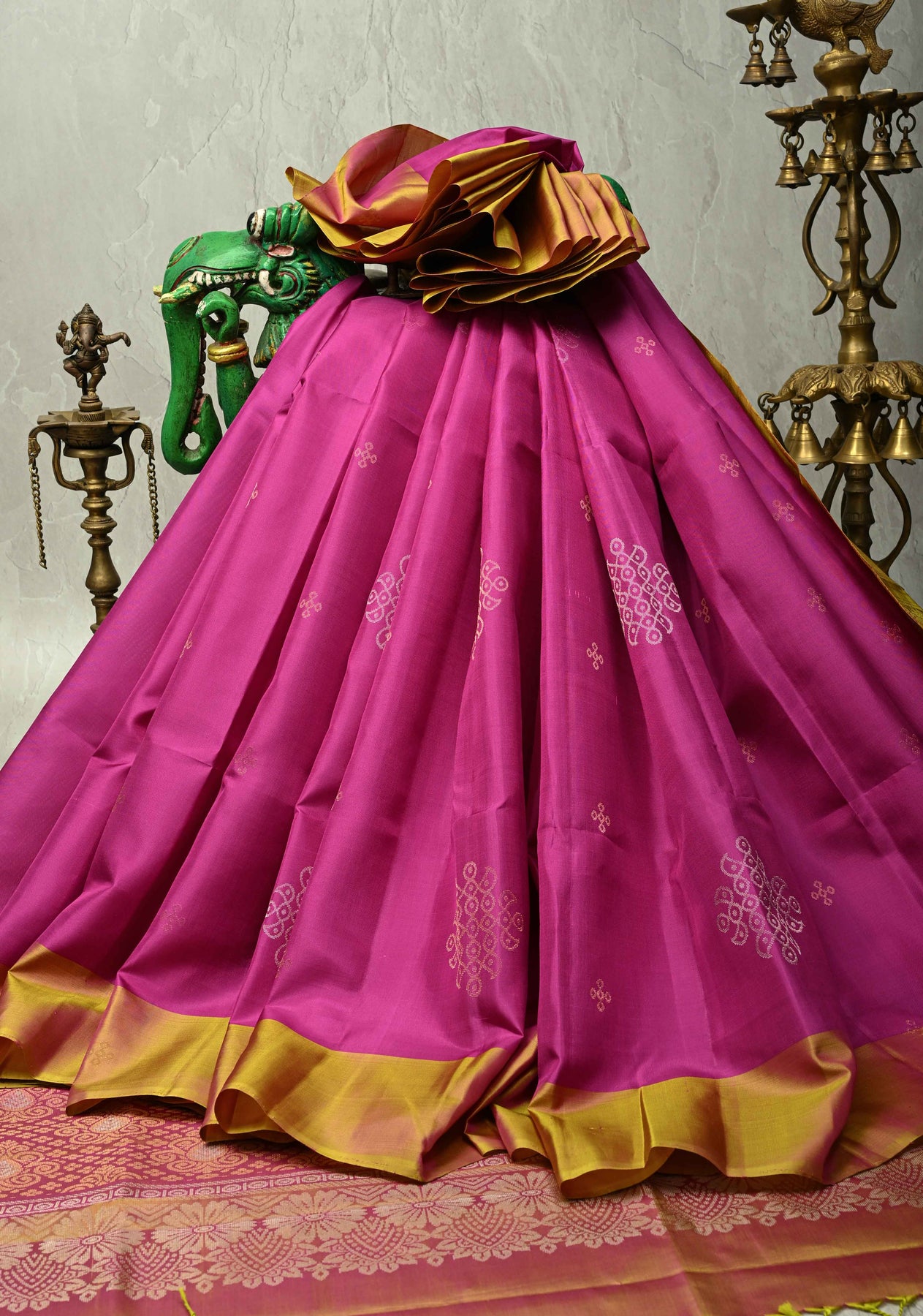Indulge in the splendor of this exquisite Light Magenta Kanjivaram, crafted from Soft Silk for a fluid and comfortable drape. The body is richly embellished with intricate Gold and Silver Zari 'Rangoli' Buttas, lending a celebratory shimmer to the deep hue. The elegance is further elevated by a stunning Contrast Border, woven meticulously to frame the saree and complete its opulent look. A perfect choice for weddings, festivals, and special occasions where timeless tradition meets luxurious comfort.