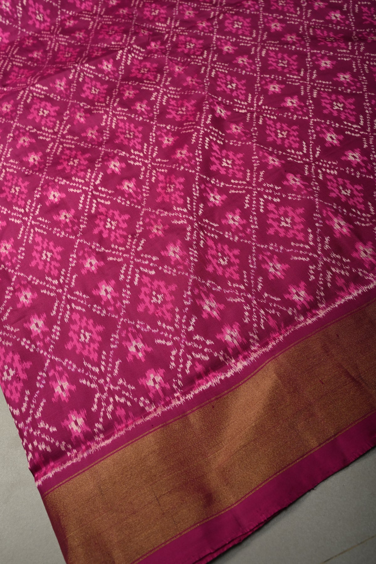 Elevate your ethnic wardrobe with this exquisite Magenta Pochampally Ikkat Pure Silk Saree, a timeless masterpiece that beautifully reflects the rich weaving heritage of Pochampally. Handwoven in pure silk, this saree showcases intricate geometric jaal patterns created using the traditional Ikkat dyeing technique, where each thread is resist-dyed before weaving to achieve its distinctive design. The magenta hue adds a regal charm, while the elegant tissue zari border lends a subtle shimmer and festive appeal. Lightweight yet opulent, this saree drapes gracefully, making it perfect for weddings, celebrations, and special occasions. A true blend of craftsmanship and sophistication, it is a statement piece that embodies tradition with contemporary elegance.