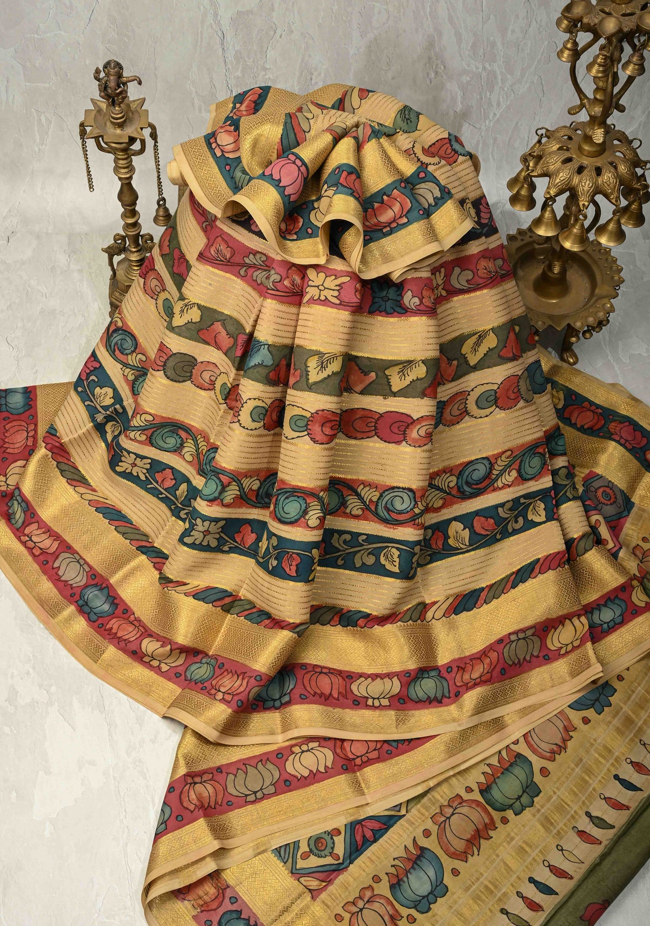 This multicolor floral-themed saree is a masterpiece of traditional artistry, featuring authentic hand-painted Pen Kalamkari work on pure Mysore crepe silk. The intricate floral motifs showcase the skill and precision of Indian artisans, bringing vibrant colors and delicate detailing to life. The saree is designed with elegant panels and stripes, adding structure and a contemporary twist to the classic Kalamkari style. Its soft, flowing texture and natural sheen enhance the drape, making it perfect for formal gatherings, cultural celebrations, and festive occasions. A blend of heritage craftsmanship and modern design, this saree is truly a wearable work of art.