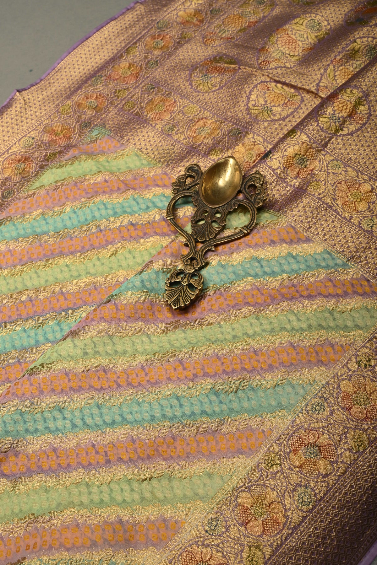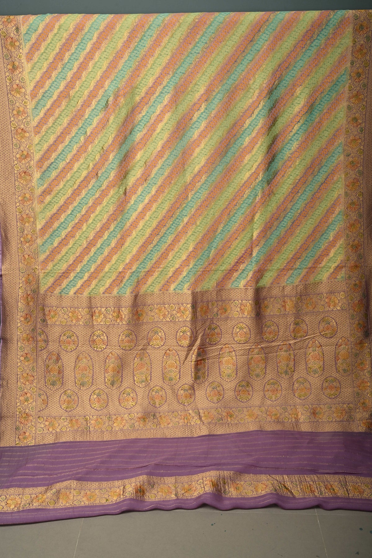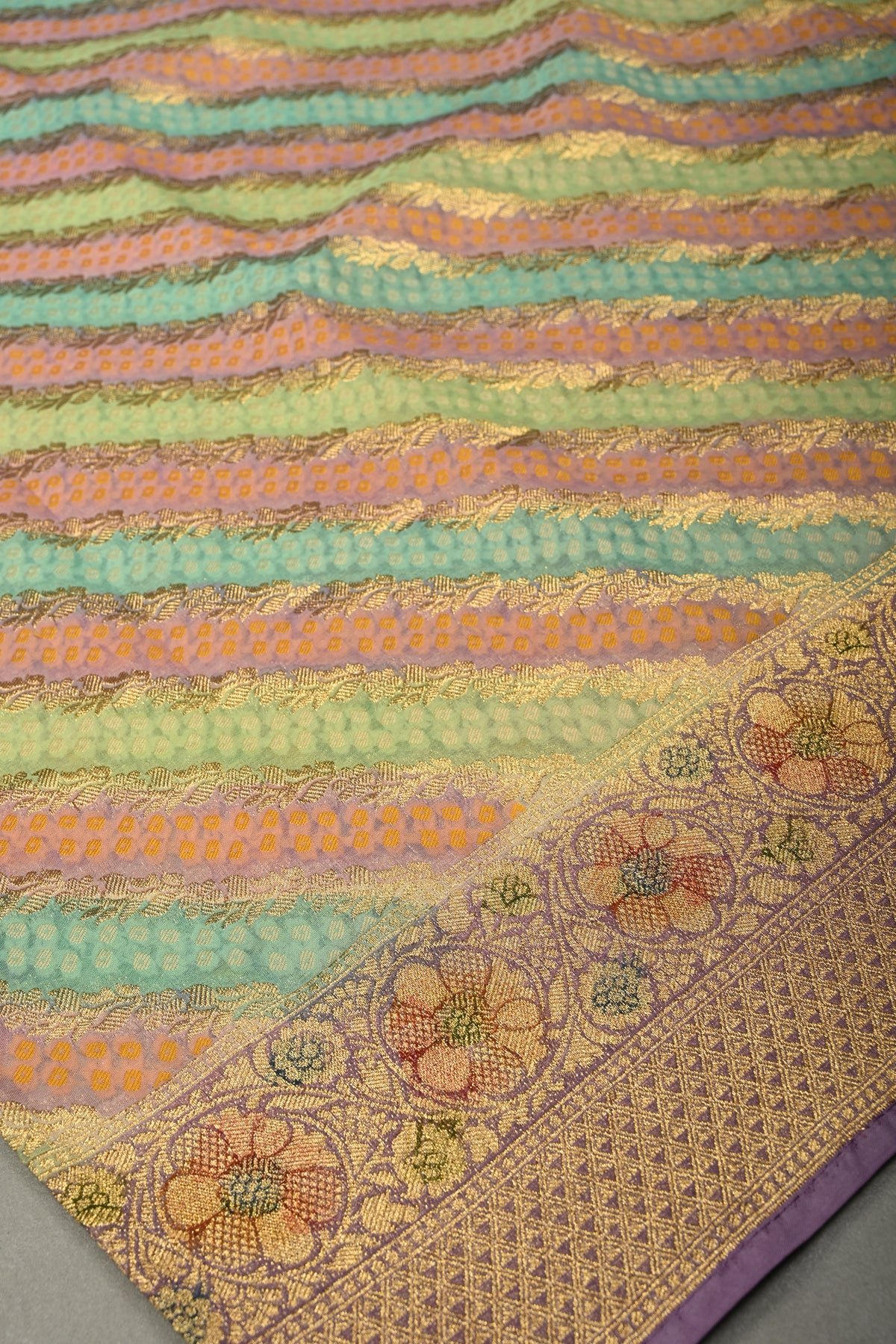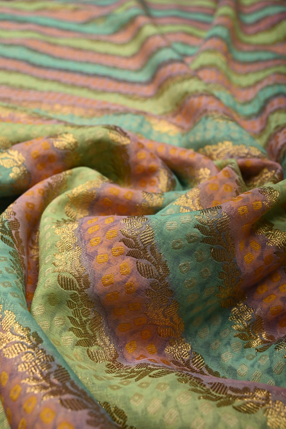 This multicolor vegan viscose georgette saree is a stunning blend of modern design and traditional craftsmanship. Featuring a diagonal pattern enhanced with intricate zari detailing, it exudes a sophisticated shimmer that catches the eye. The rangkaat-style brush dye adds a fluid, artistic gradient across the fabric, while delicately woven borders frame the saree beautifully. flowing, it drapes effortlessly, making it perfect for festive celebrations, weddings, or elegant daytime events. A perfect choice for those who love vibrant colors with a touch of refined artistry.