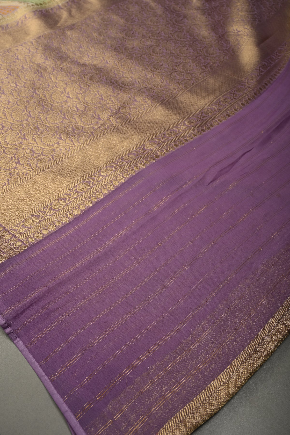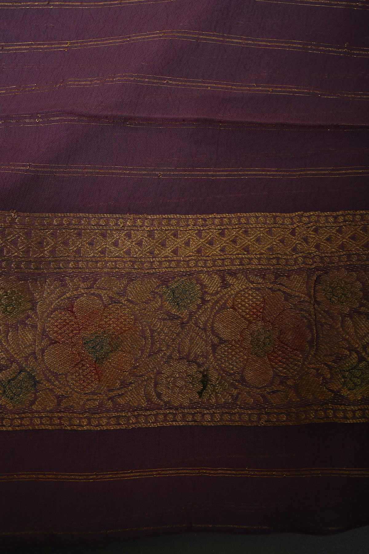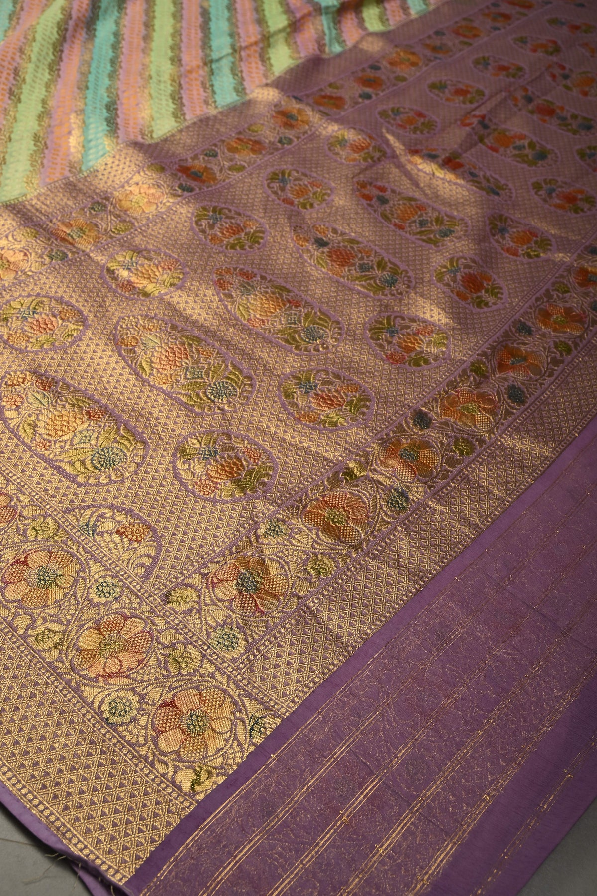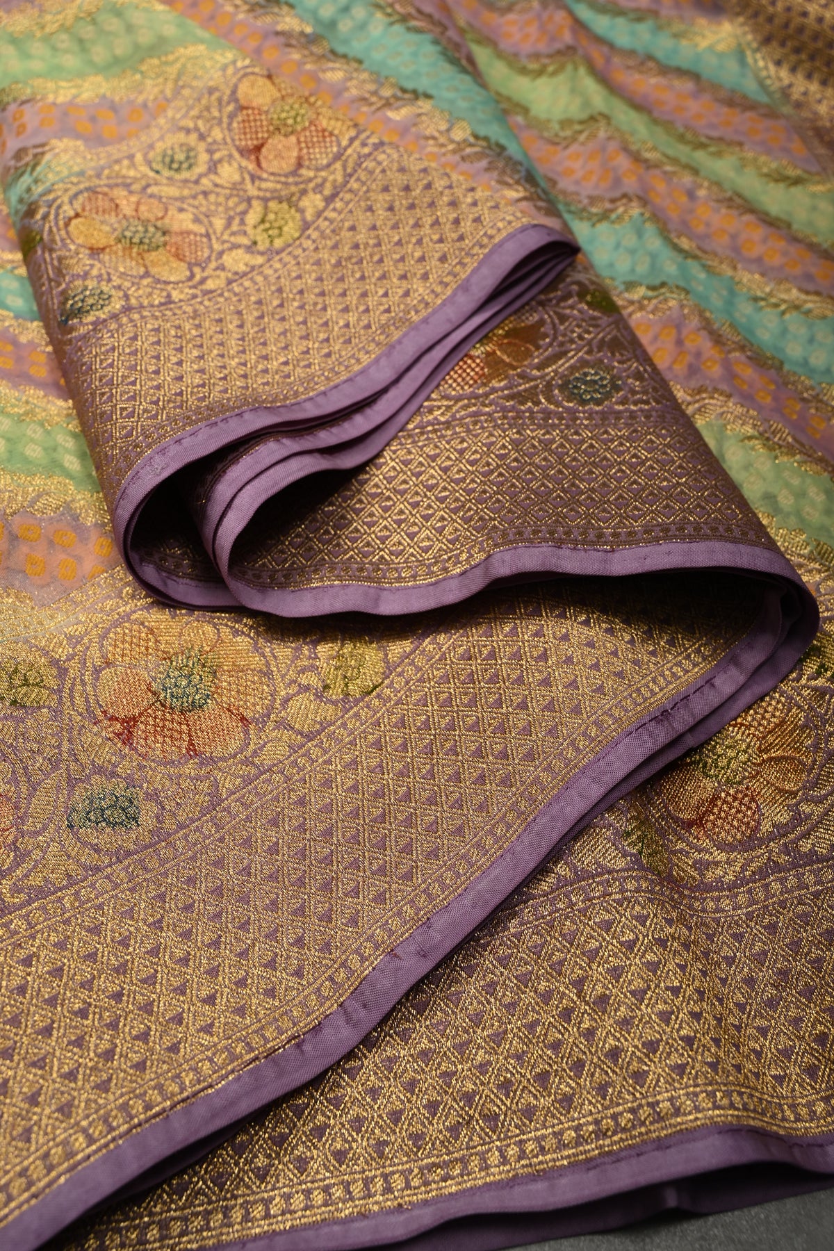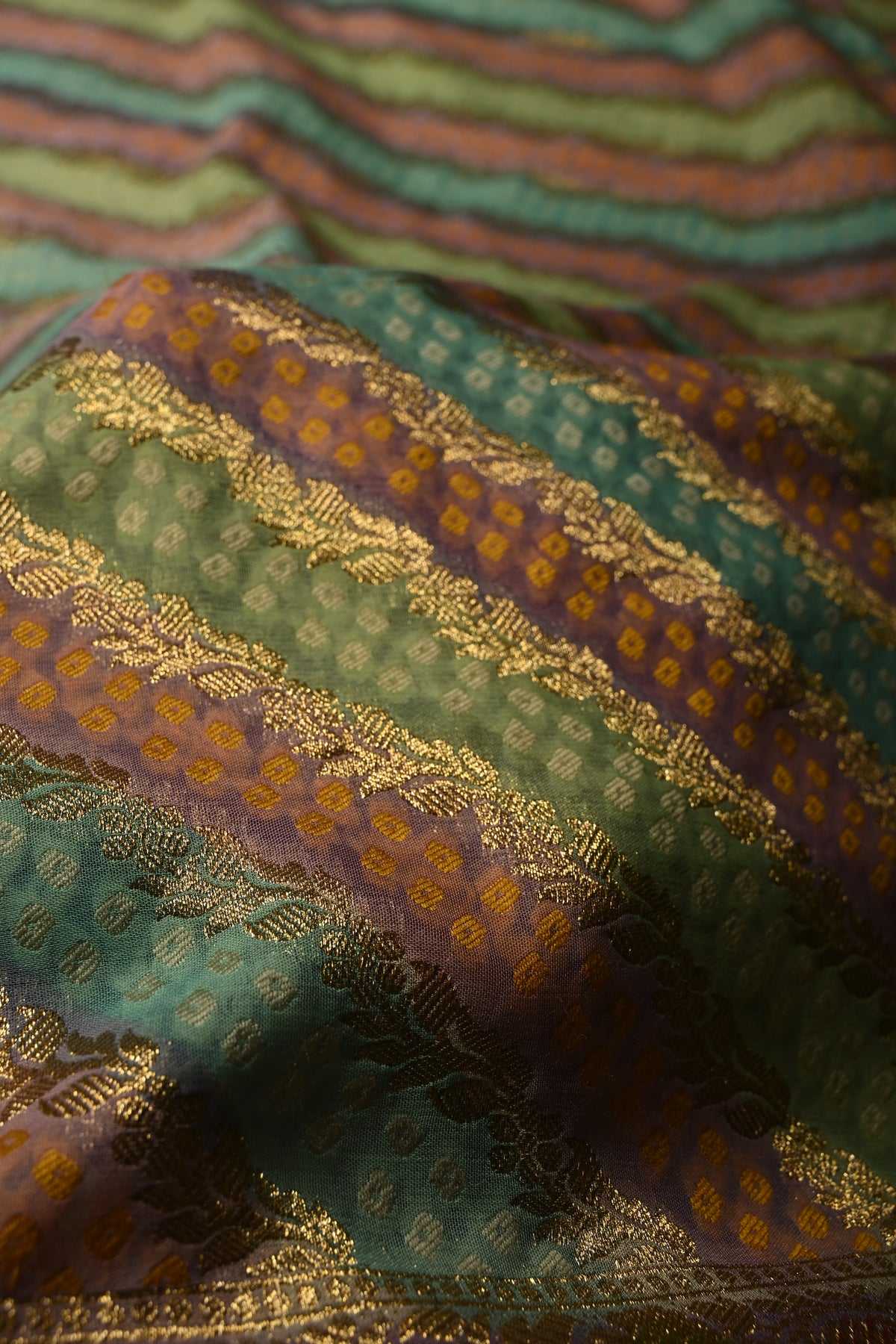 This multicolor vegan viscose georgette saree is a stunning blend of modern design and traditional craftsmanship. Featuring a diagonal pattern enhanced with intricate zari detailing, it exudes a sophisticated shimmer that catches the eye. The rangkaat-style brush dye adds a fluid, artistic gradient across the fabric, while delicately woven borders frame the saree beautifully. flowing, it drapes effortlessly, making it perfect for festive celebrations, weddings, or elegant daytime events. A perfect choice for those who love vibrant colors with a touch of refined artistry.