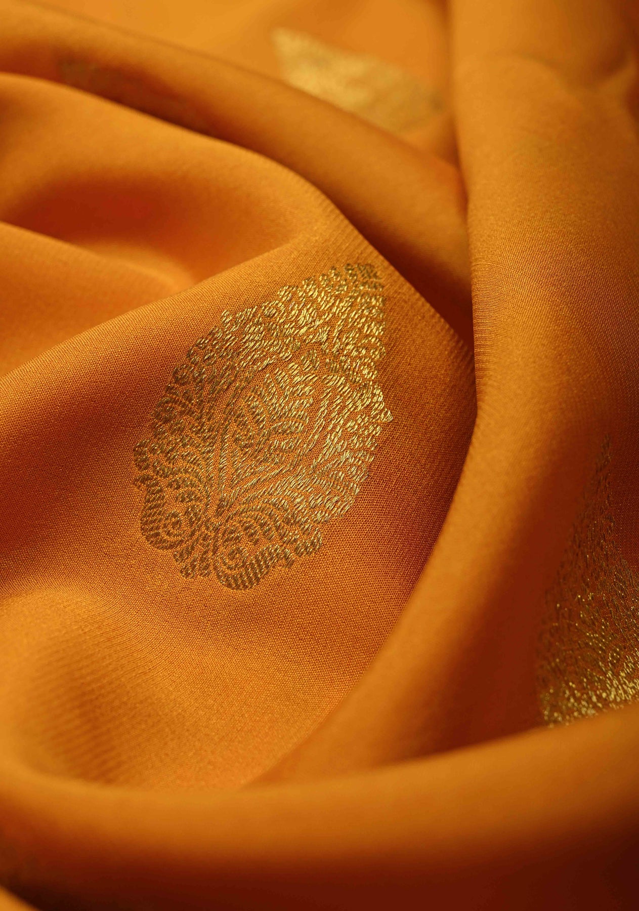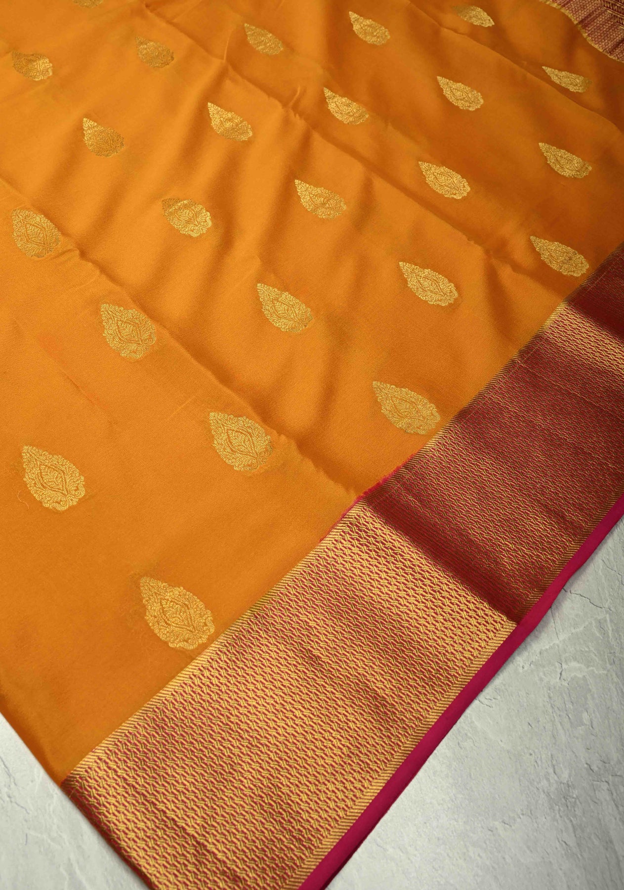 Elevate your festive style with this stunning Mustard Yellow Mysore Silk Saree, crafted from , lightweight silk known for its natural sheen and elegant fall. The vibrant mustard hue is beautifully complemented by intricately woven floral zari buttas, adding a graceful sparkle across the body. A contrast zari border frames the saree, enhancing its traditional charm and making it perfect for weddings, celebrations, and special occasions. Timeless, radiant, and effortlessly regal—this saree is a true statement of sophistication.