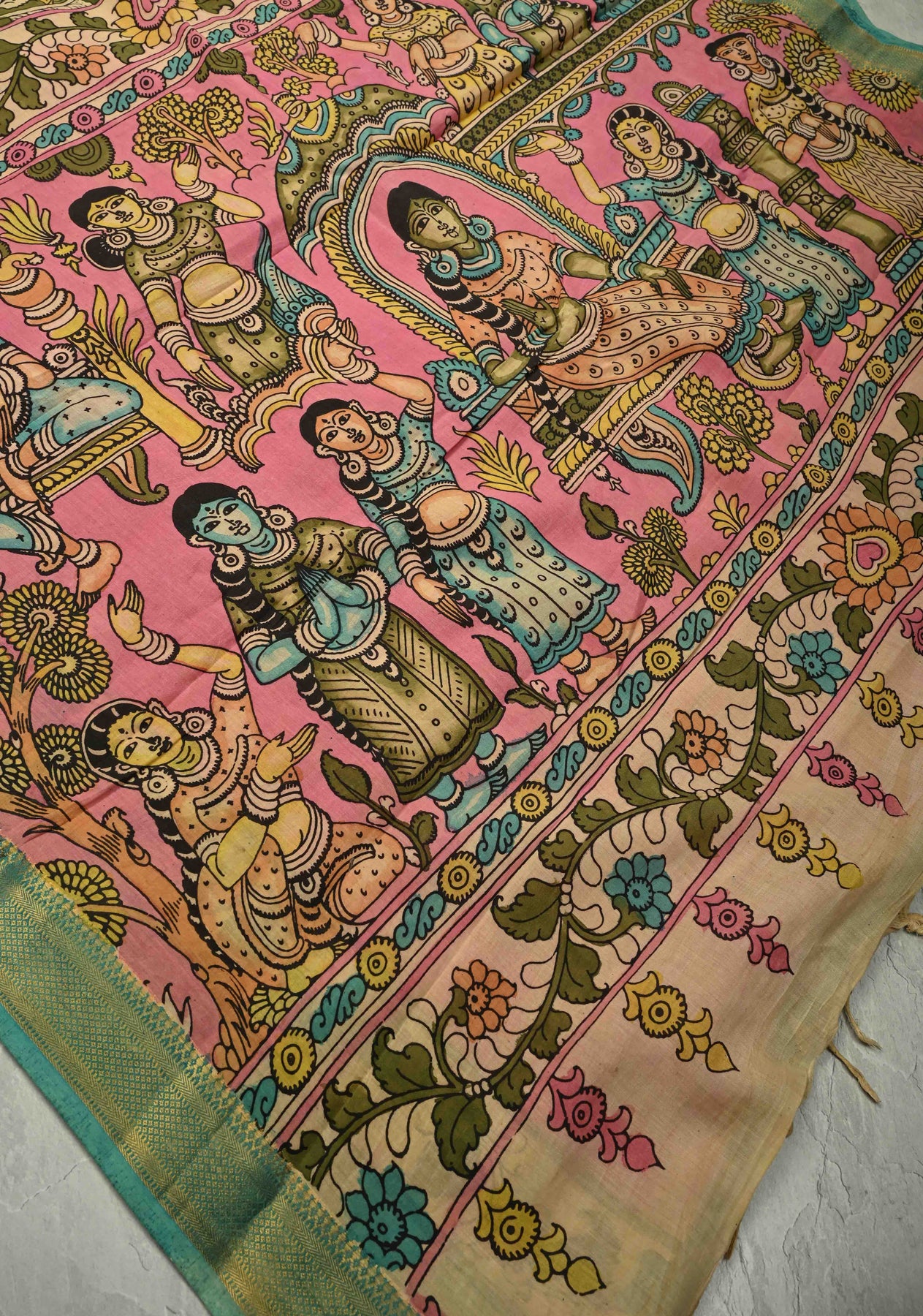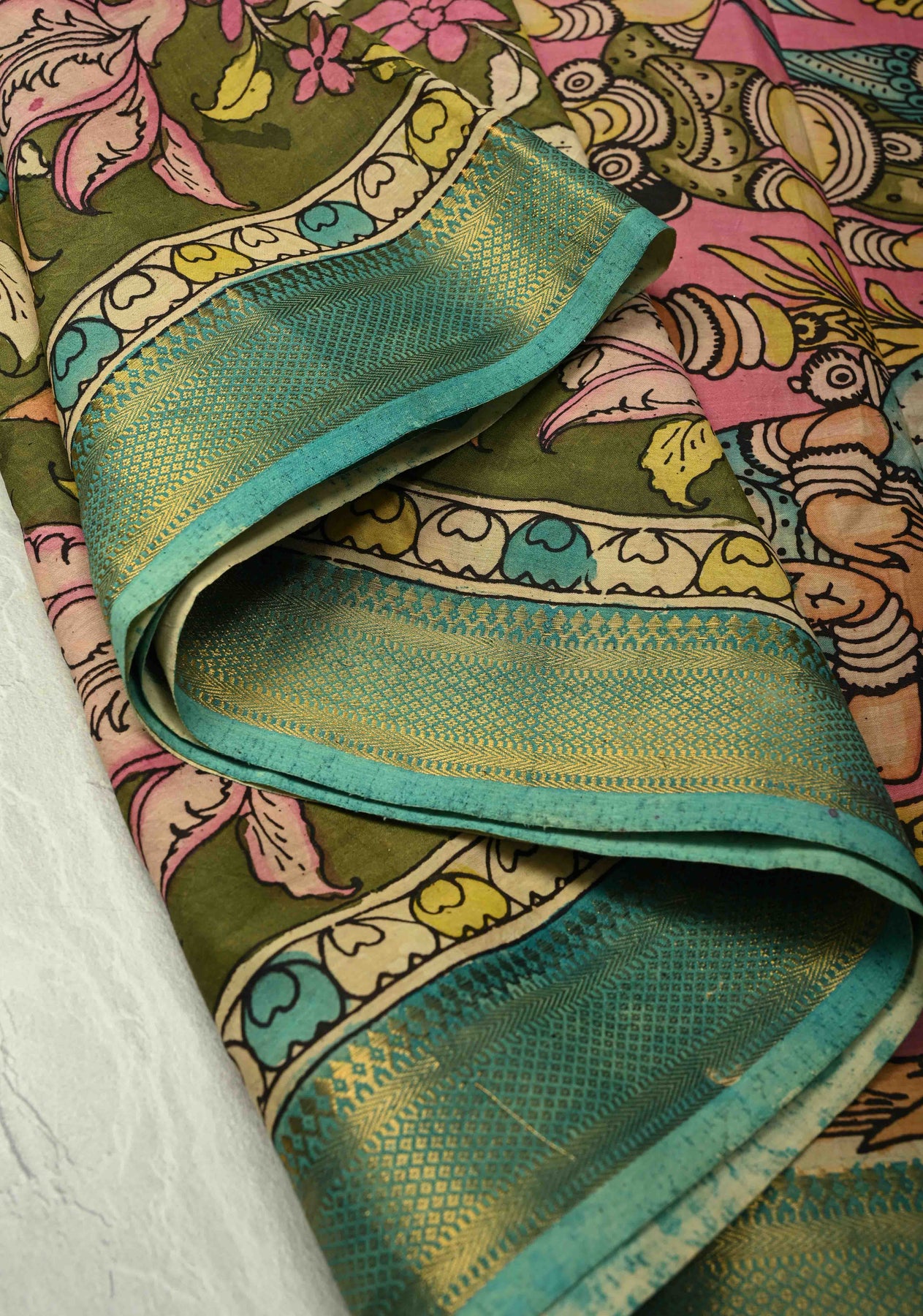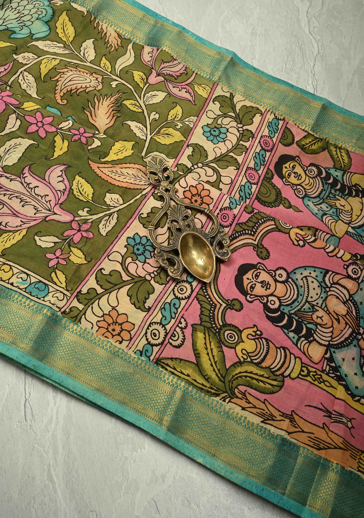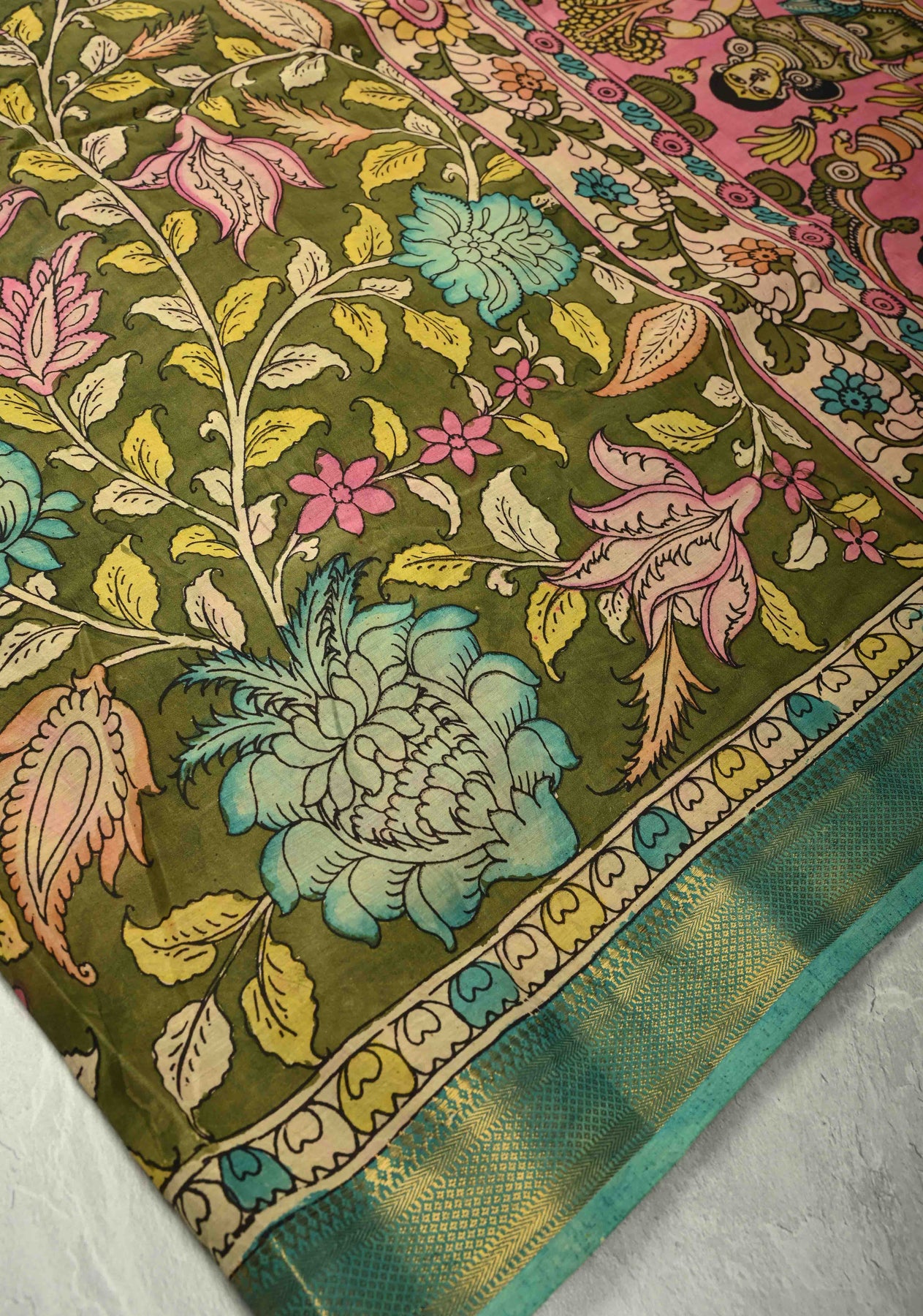 Celebrate artistry and tradition with this Henna Green Pure Mangalagiri Silk Cotton Saree, featuring an authentic pen Kalamkari design on the pallu inspired by mythological motifs. The intricate hand-painted detailing brings stories and heritage to life, while the zari border adds a touch of elegance and festivity.