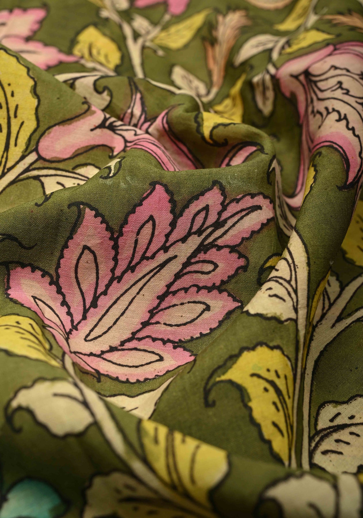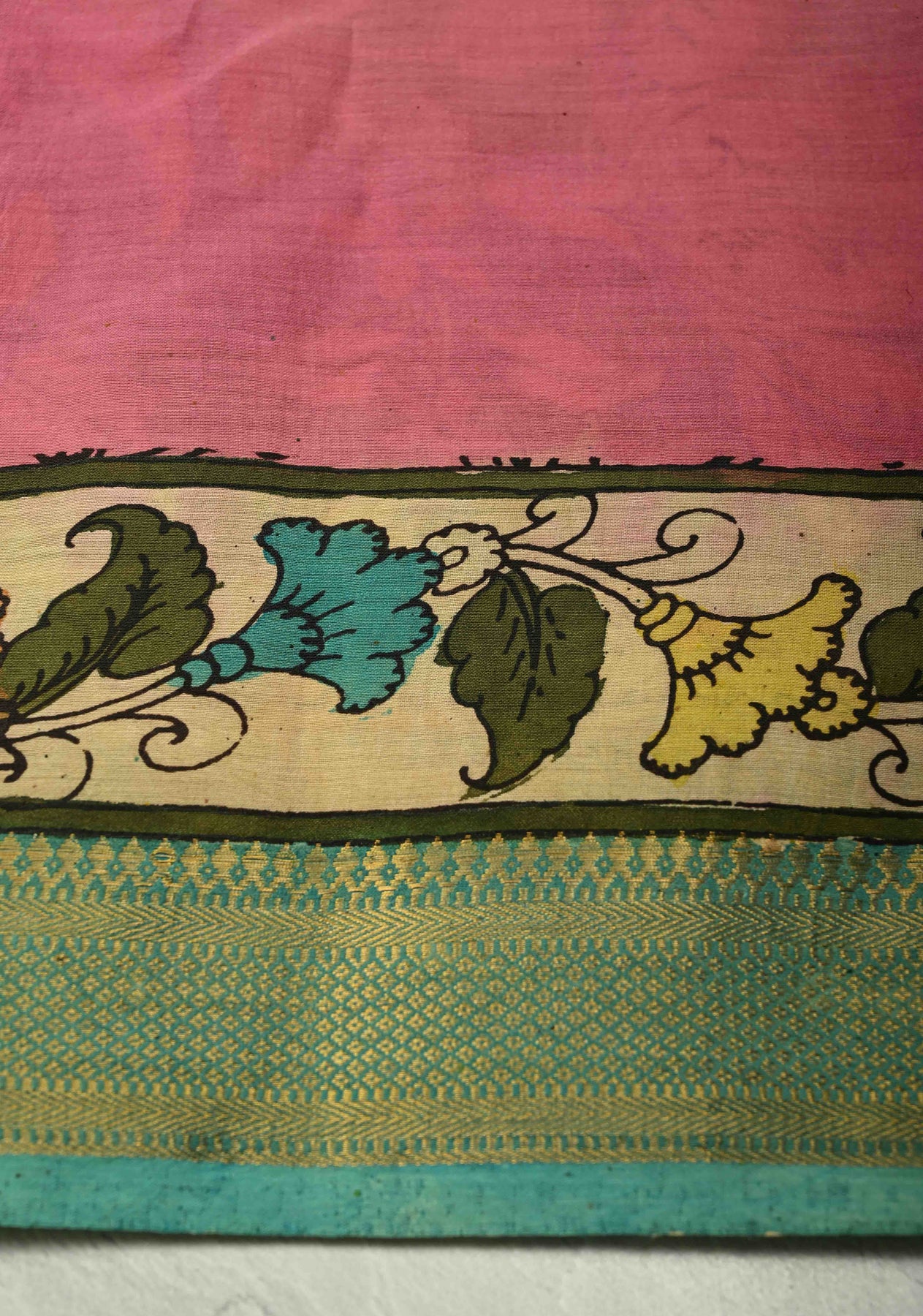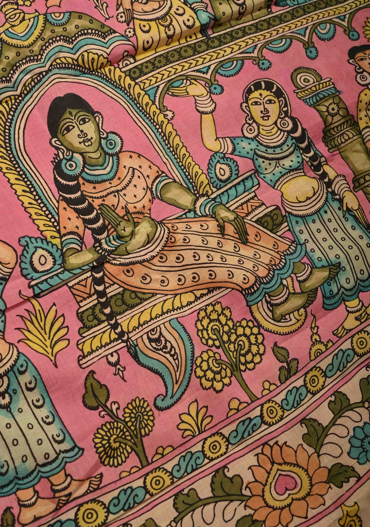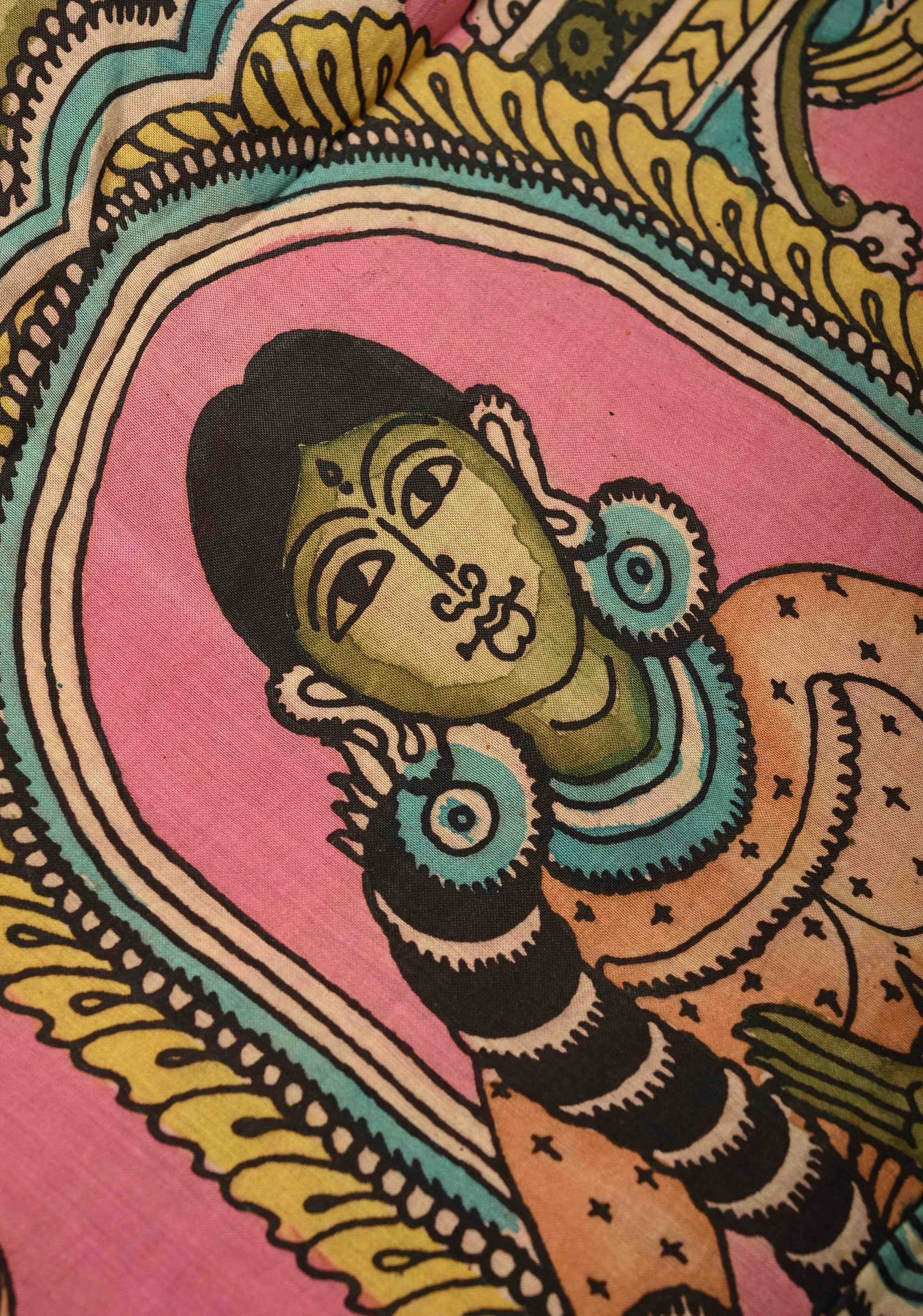 Celebrate artistry and tradition with this Henna Green Pure Mangalagiri Silk Cotton Saree, featuring an authentic pen Kalamkari design on the pallu inspired by mythological motifs. The intricate hand-painted detailing brings stories and heritage to life, while the zari border adds a touch of elegance and festivity.