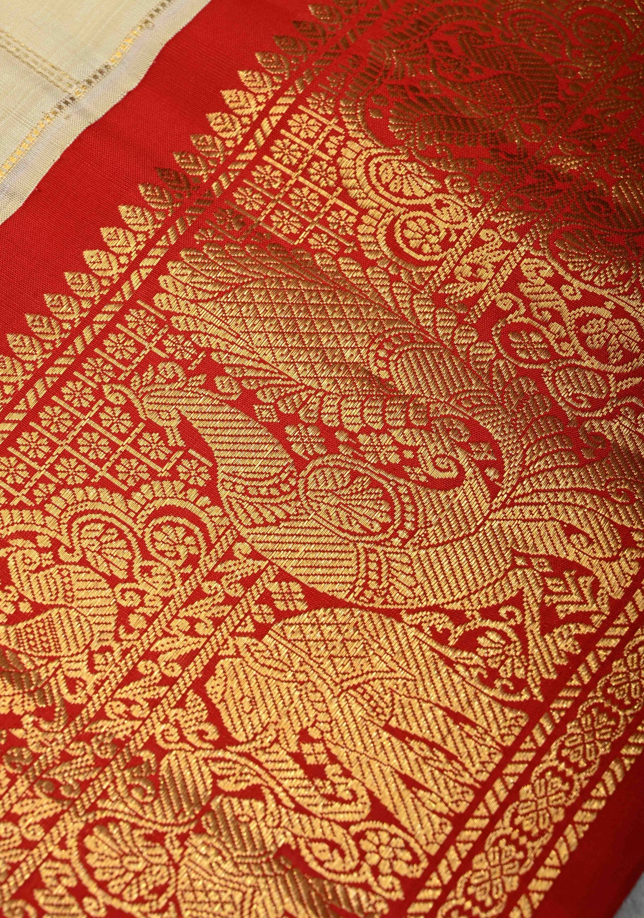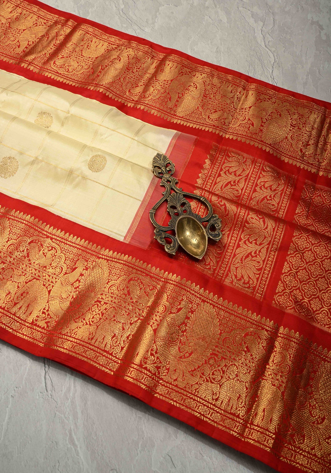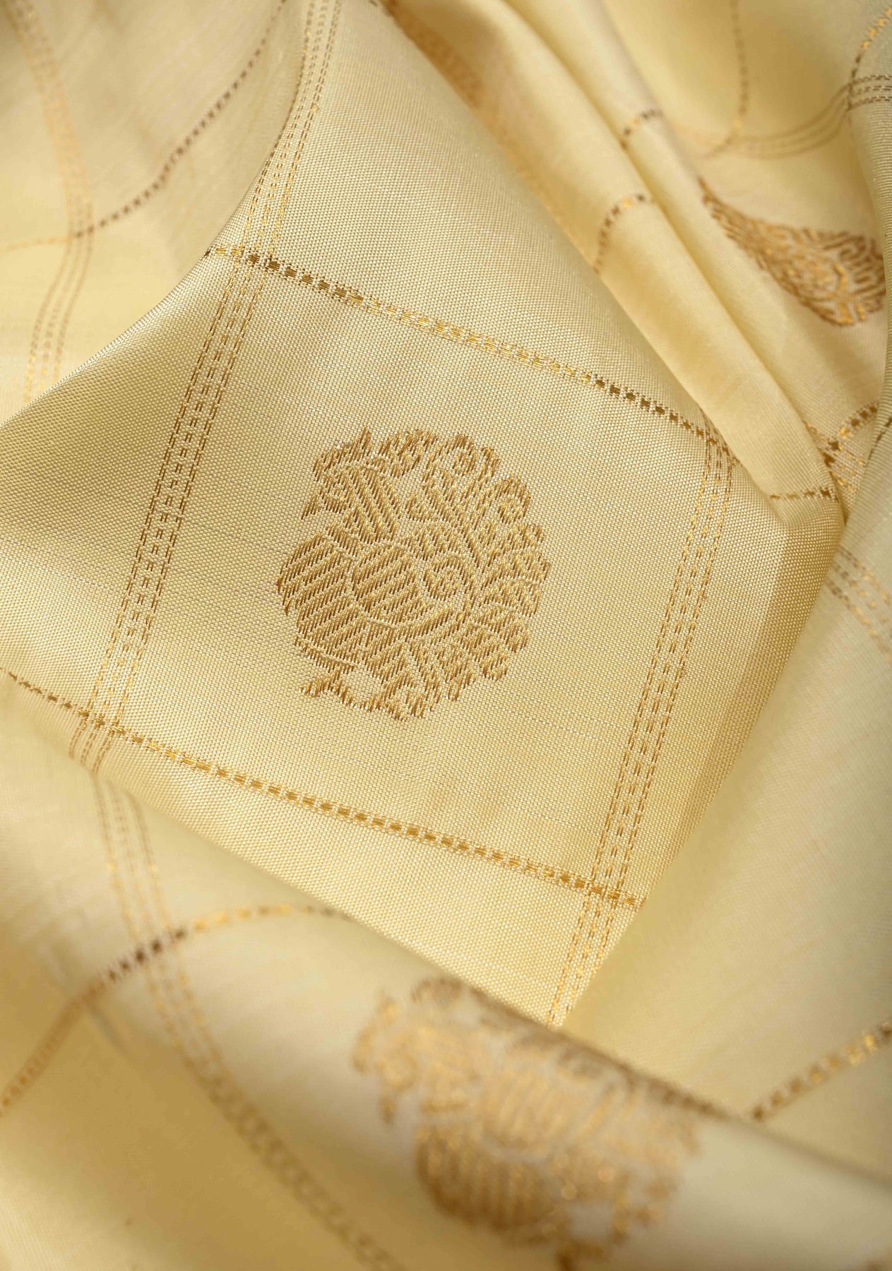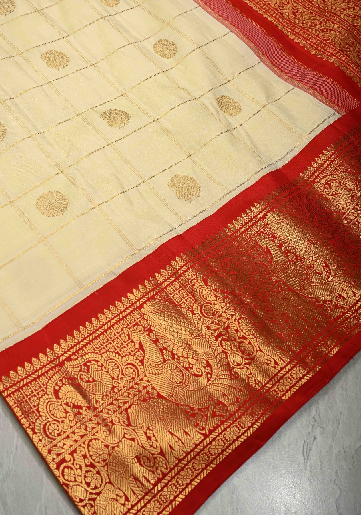Exude understated elegance with this Off White Pure Gadwal Silk Saree, featuring delicate zari checks and subtle zari buttas throughout the body. The saree is enhanced with a striking contrast Korvai zari border, creating a perfect balance of sophistication and traditional charm. Crafted from Gadwal silk, it drapes gracefully and feels lightweight, making it ideal for weddings, festive occasions, and formal celebrations. A classic handloom masterpiece that celebrates timeless craftsmanship.